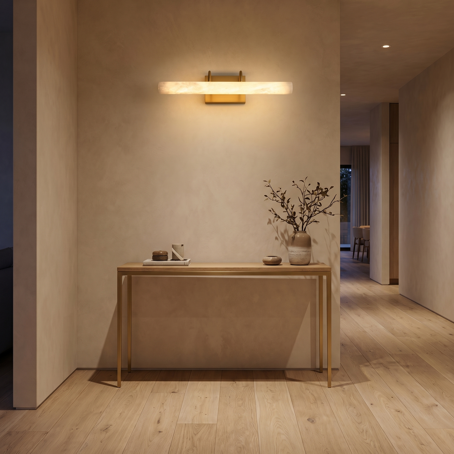Part of the Tubo Collection, this wall lamp combines natural stone with refined metalwork. Each alabaster element is cut from a single stone block, so no two pieces are identical — the veining, translucency, and mineral tone are unique to every fixture.