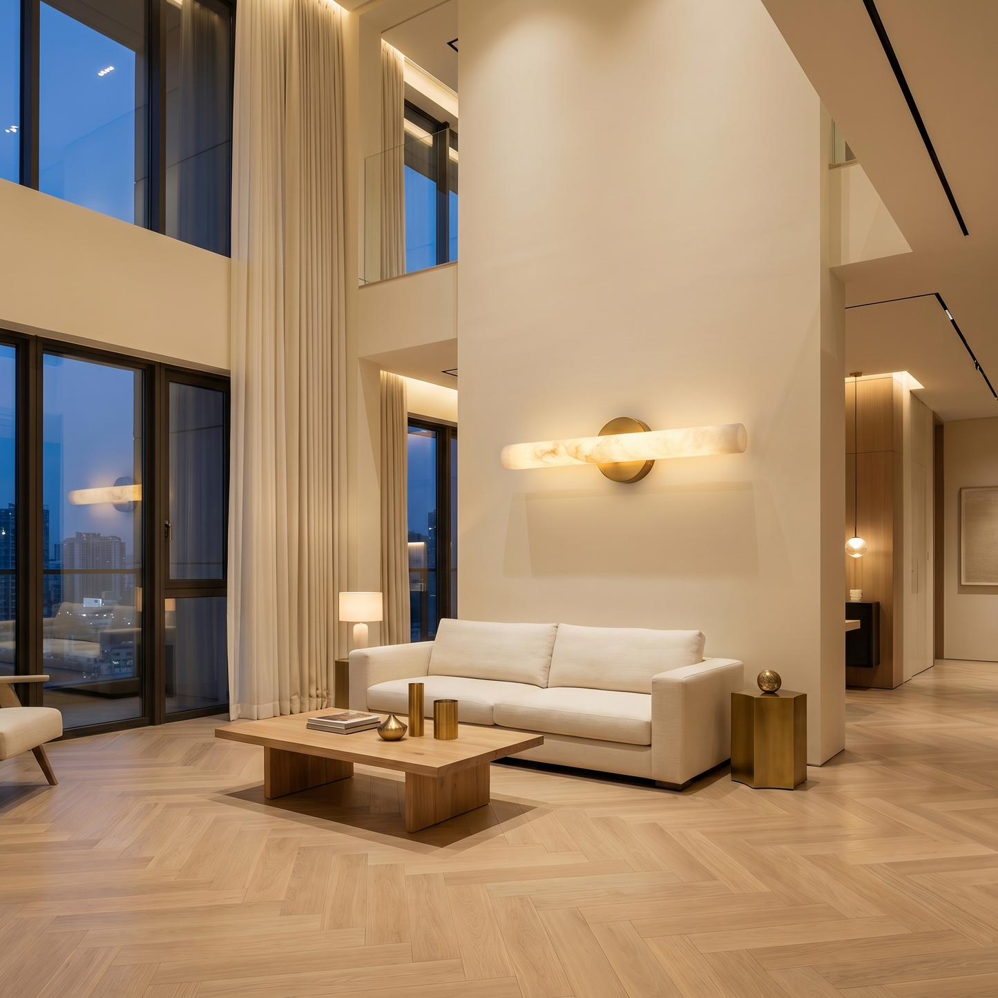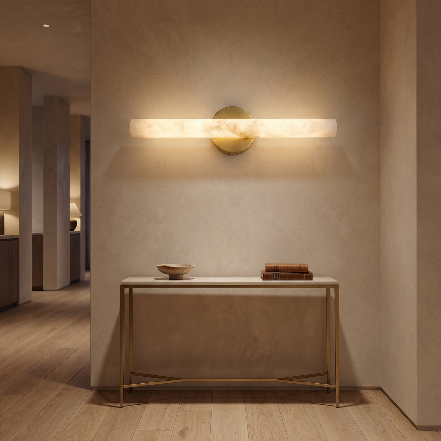 Part of the Tubo Collection, this wall lamp combines natural stone with refined metalwork. Each alabaster element is cut from a single stone block, so no two pieces are identical — the veining, translucency, and mineral tone are unique to every fixture.