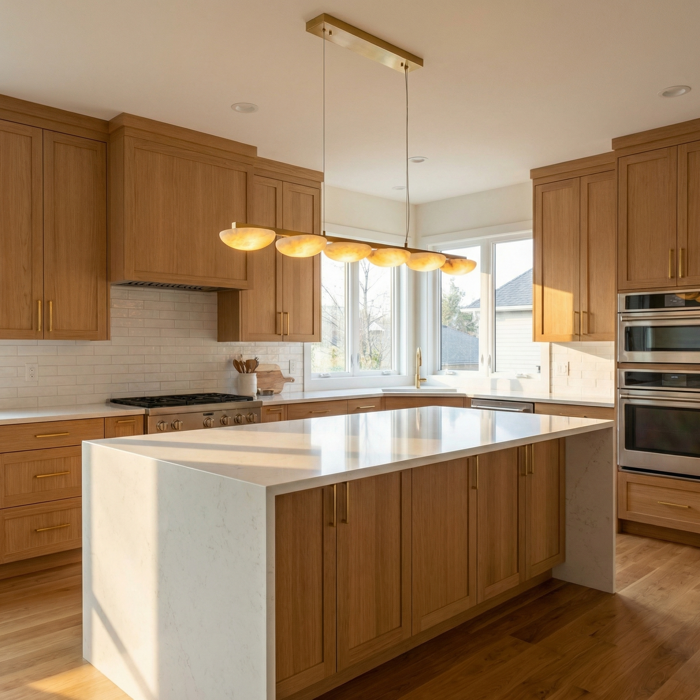Part of the Ciottolo Collection, this chandelier combines natural stone with refined metalwork. Each alabaster element is cut from a single stone block, so no two pieces are identical — the veining, translucency, and mineral tone are unique to every fixture.
