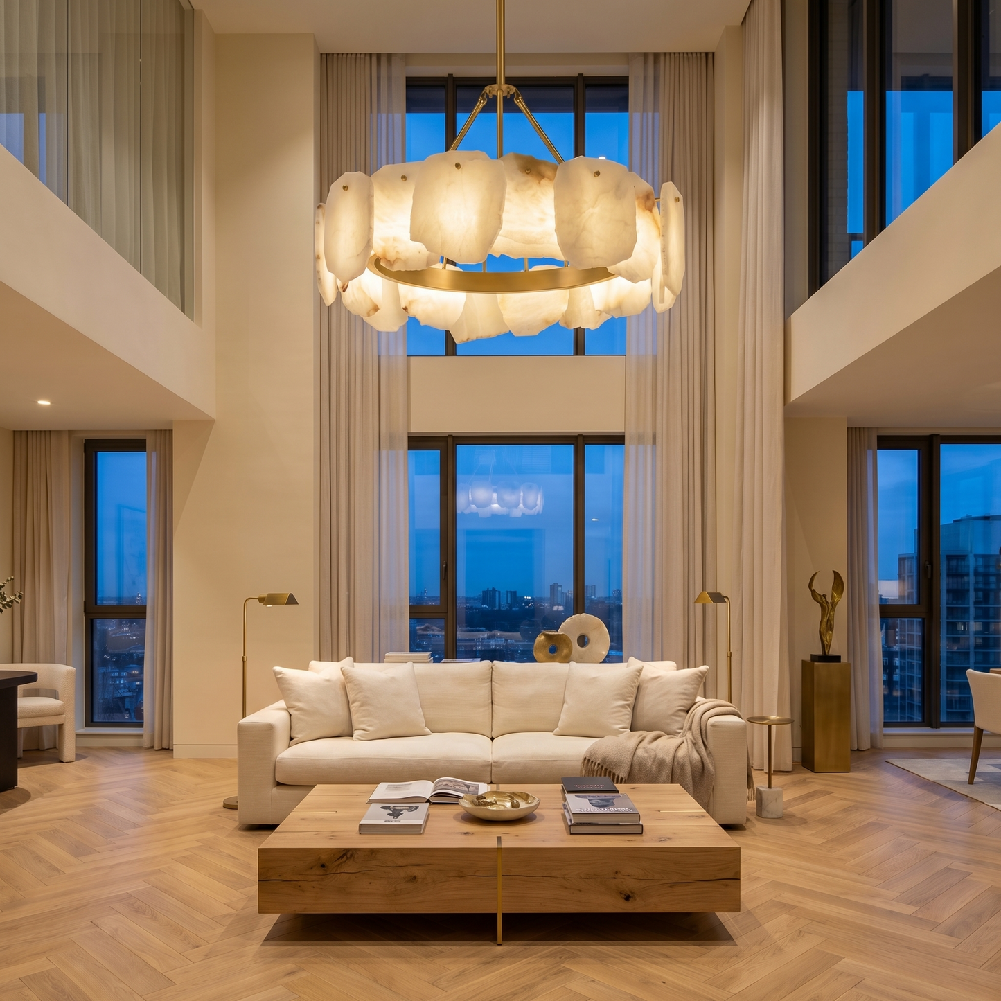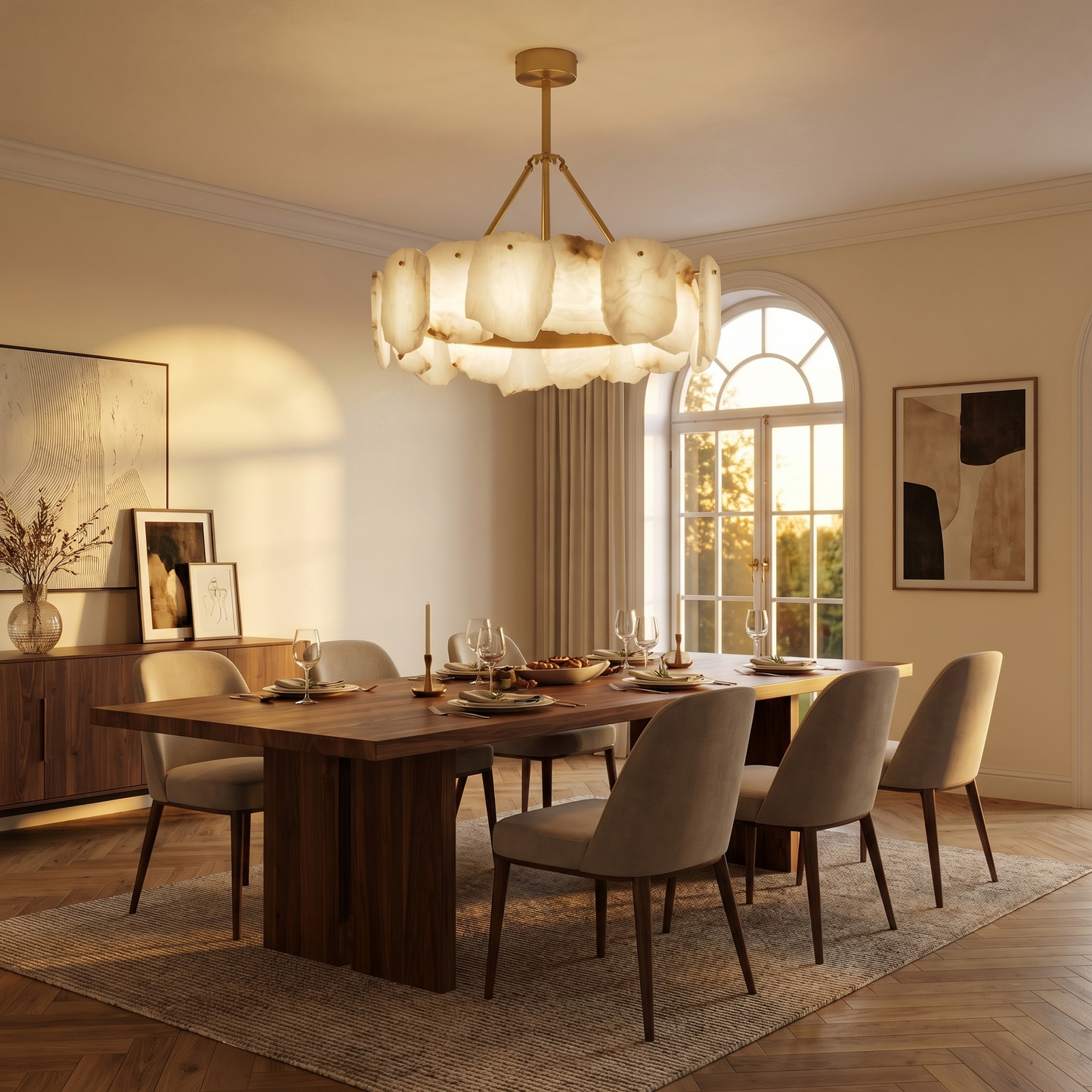 Part of the Foglia Collection, this chandelier combines natural stone with refined metalwork. Each alabaster element is cut from a single stone block, so no two pieces are identical — the veining, translucency, and mineral tone are unique to every fixture.