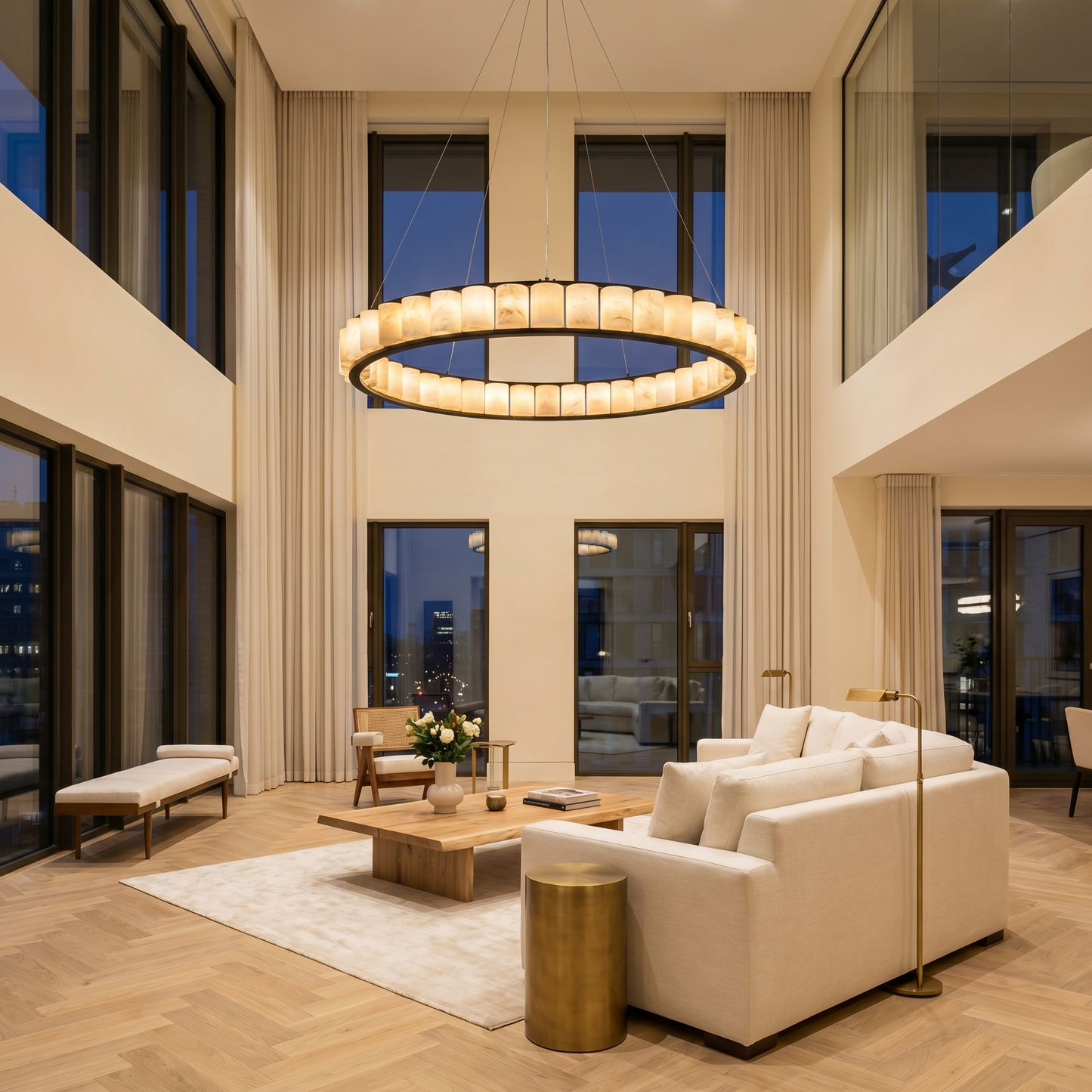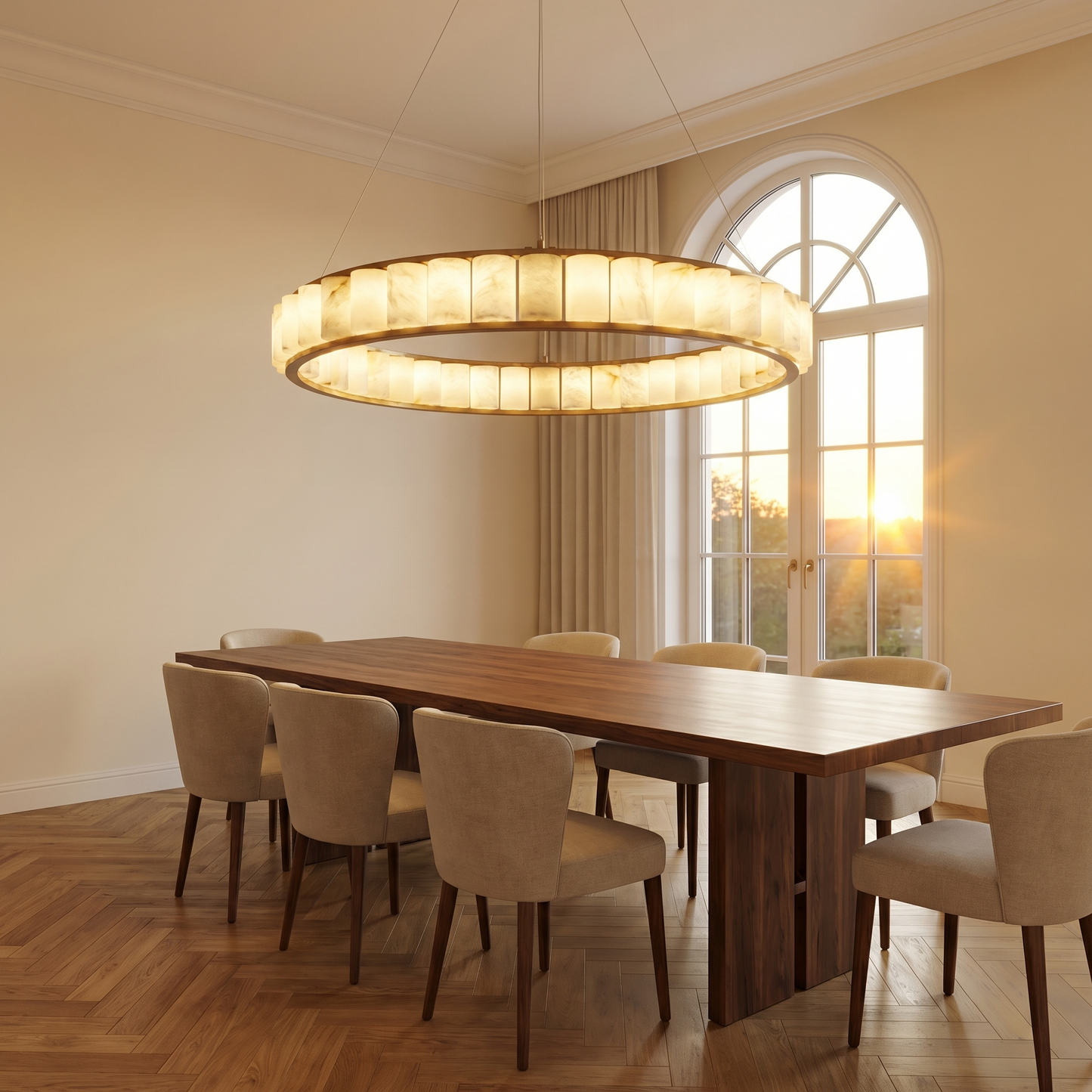 Part of the Geometrica Collection, this chandelier combines natural stone with refined metalwork. Each alabaster element is cut from a single stone block, so no two pieces are identical — the veining, translucency, and mineral tone are unique to every fixture.