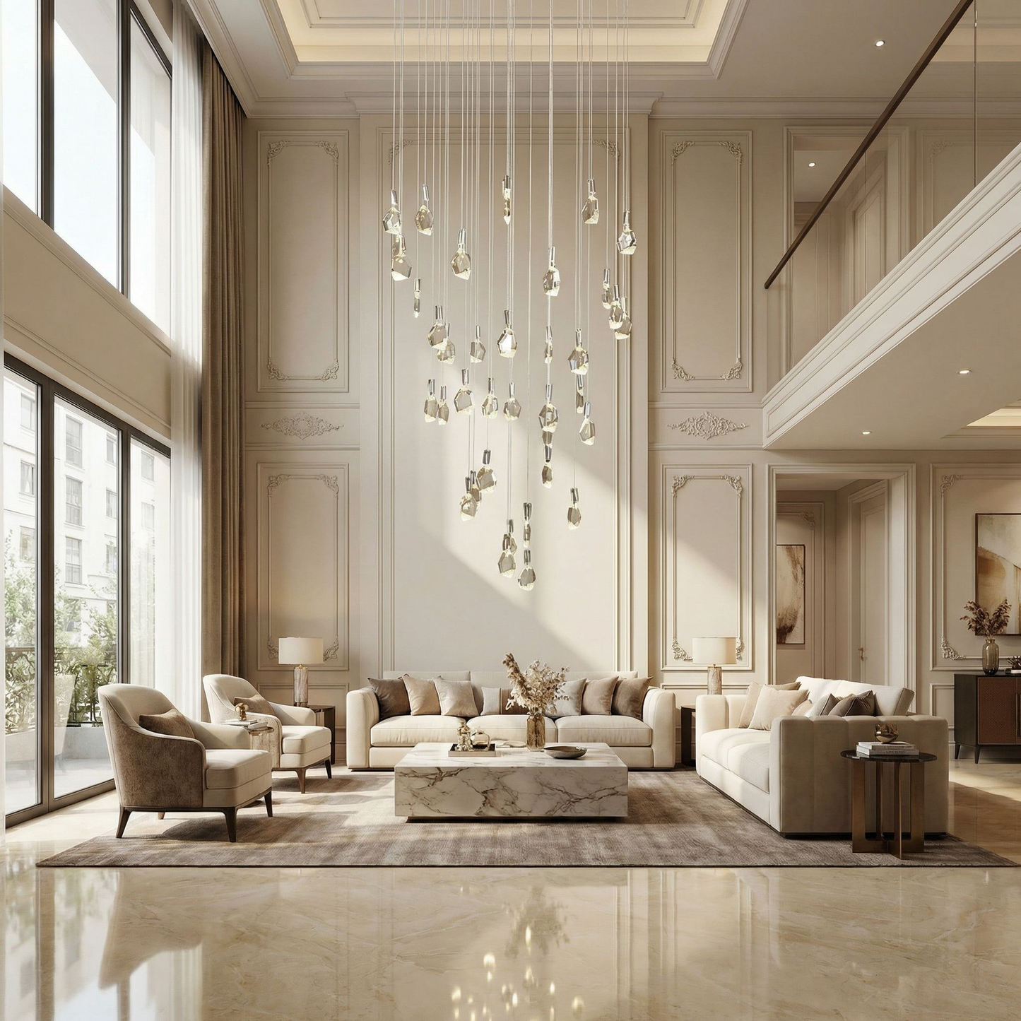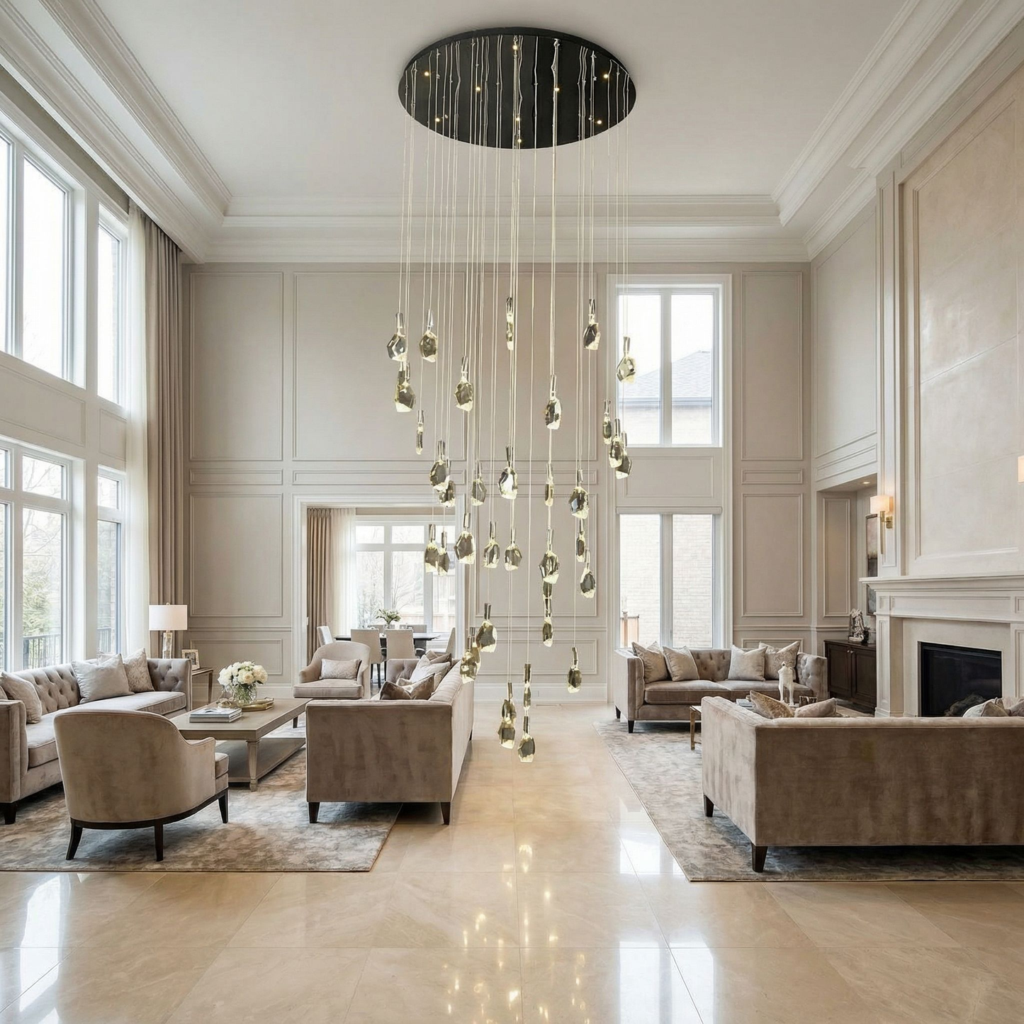 A magnificent grand chandelier with dozens of crystal stone pendants cascading from a large round canopy. Creates a breathtaking waterfall of sparkling light.