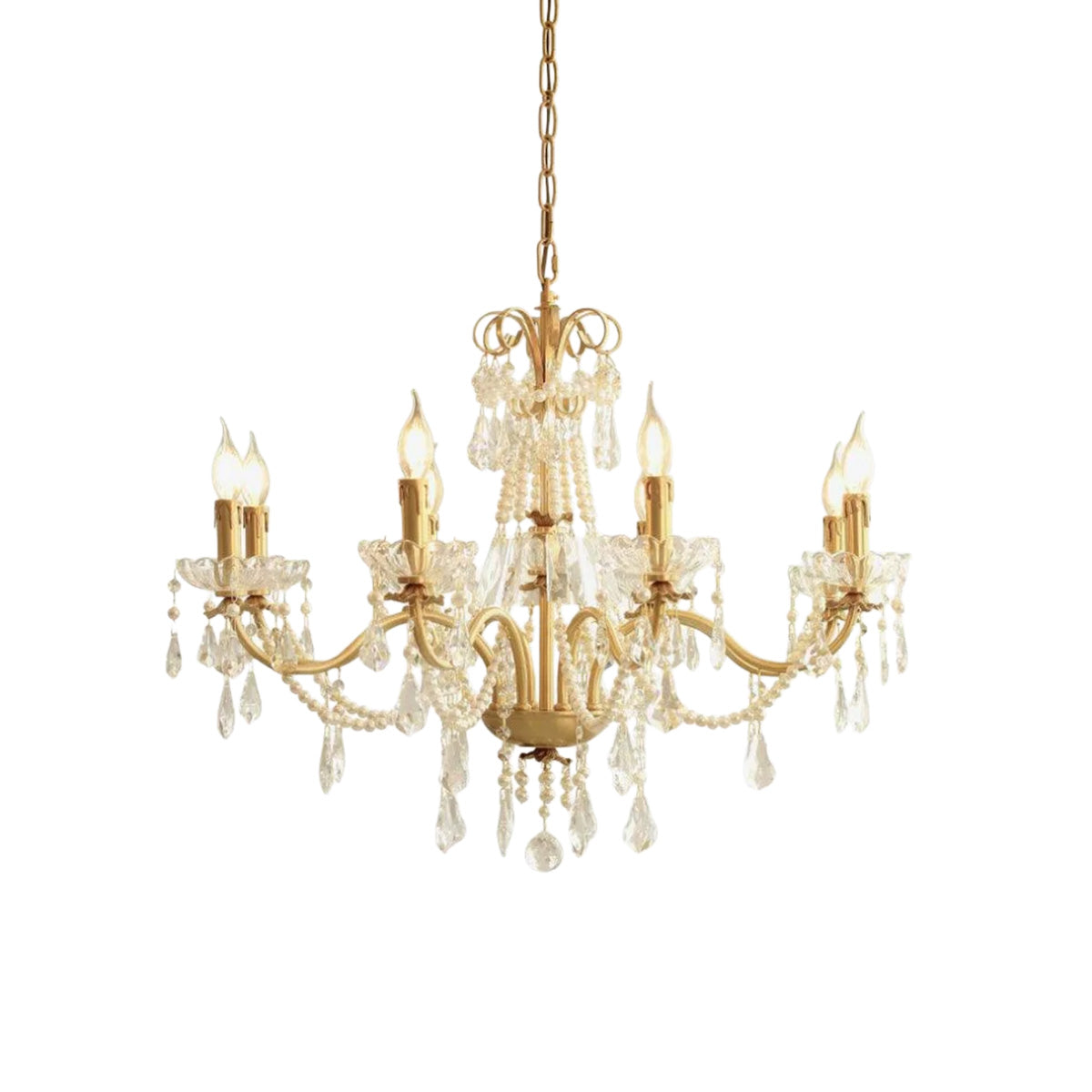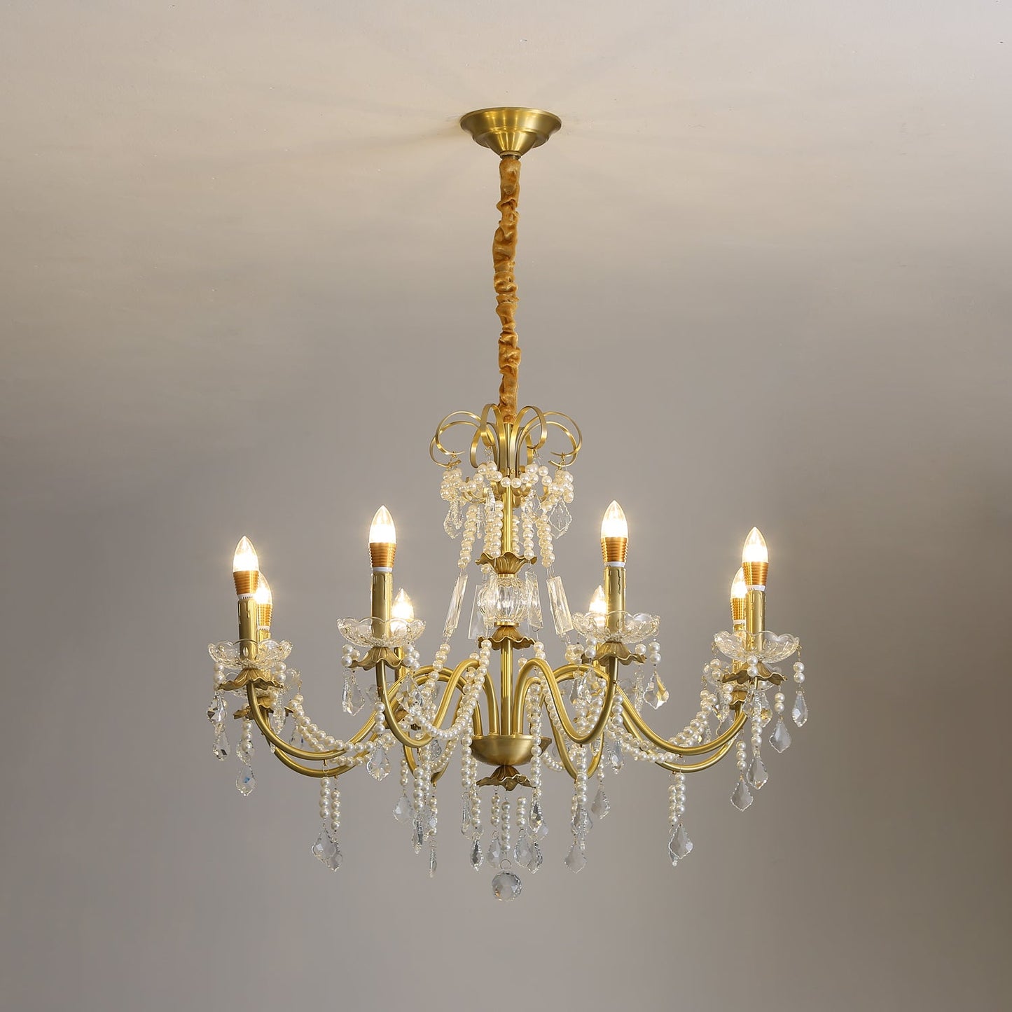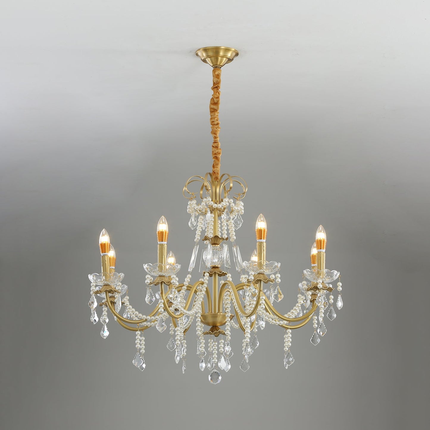 Expertly made from premium brass and clear crystal, this chandelier showcases pearl details that add a refined touch. Each component is polished to highlight its brilliance, ensuring durability and long-lasting shine.