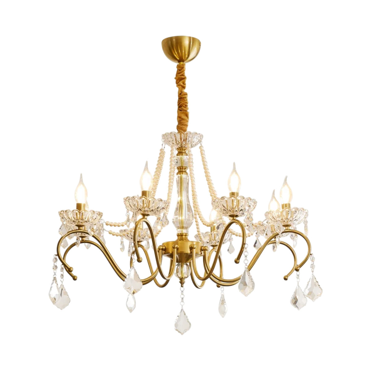 The Crystal Chandelier brings timeless elegance to your home with its gold-finished brass frame, pearl-trimmed arms, and cascading clear crystals. Available in 6-light or 8-light designs, it creates a warm, luxurious glow perfect for dining rooms, living spaces, or entryways.