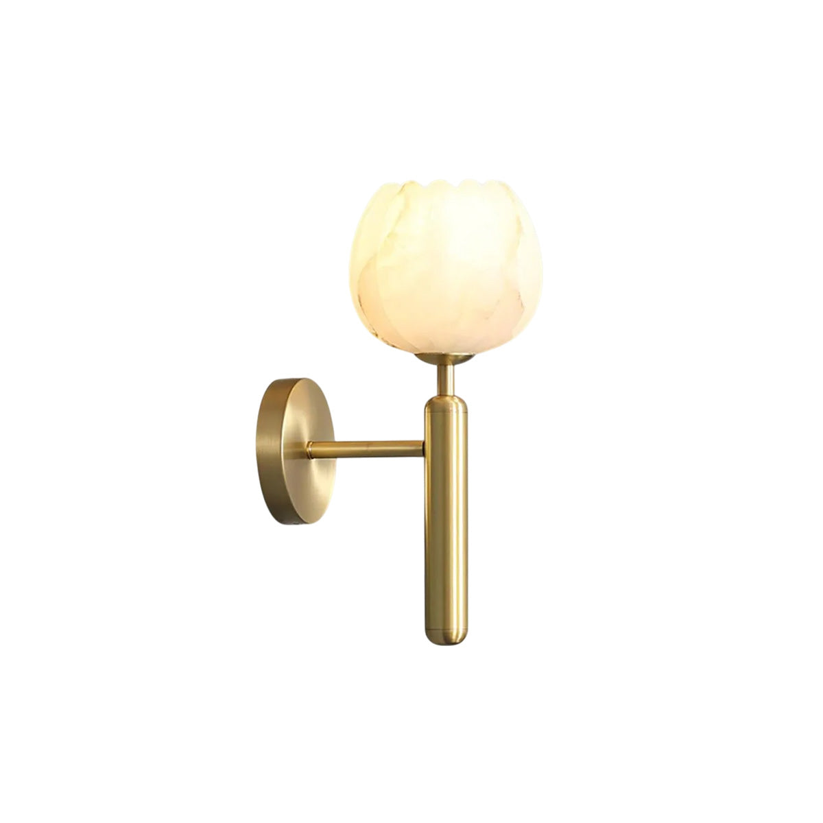 Bring a natural elegance to your space with this wall lamp, designed with a sleek brass frame and hand-crafted alabaster flowers. Its LED-compatible design provides up to 15 W of soft, warm light for hallways, bedrooms, or living rooms.