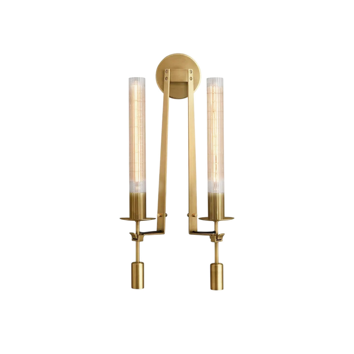 This elegant French classicism wall lamp features a solid brass frame and clear glass cylinders that bring a timeless glow to any space.