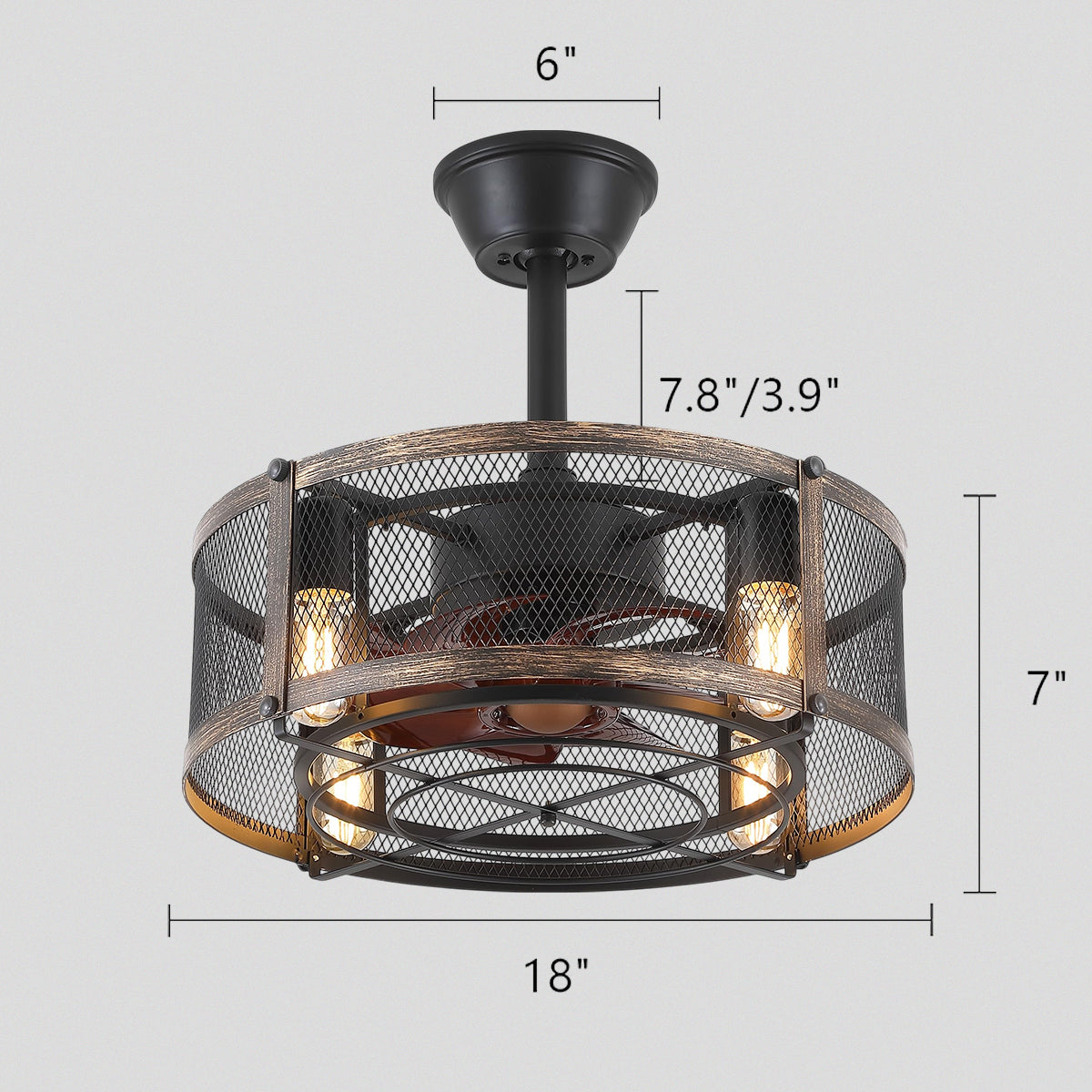 This modern low-profile caged farmhouse ceiling fan with light combines style and performance in a compact 18-inch design. Featuring a matte black finish with a wood-grain open-frame cage and rhombus grid design, it adds a touch of industrial elegance to any space. Despite its small size, the powerful DC motor delivers quiet, reversible airflow, making it perfect for year-round comfort.