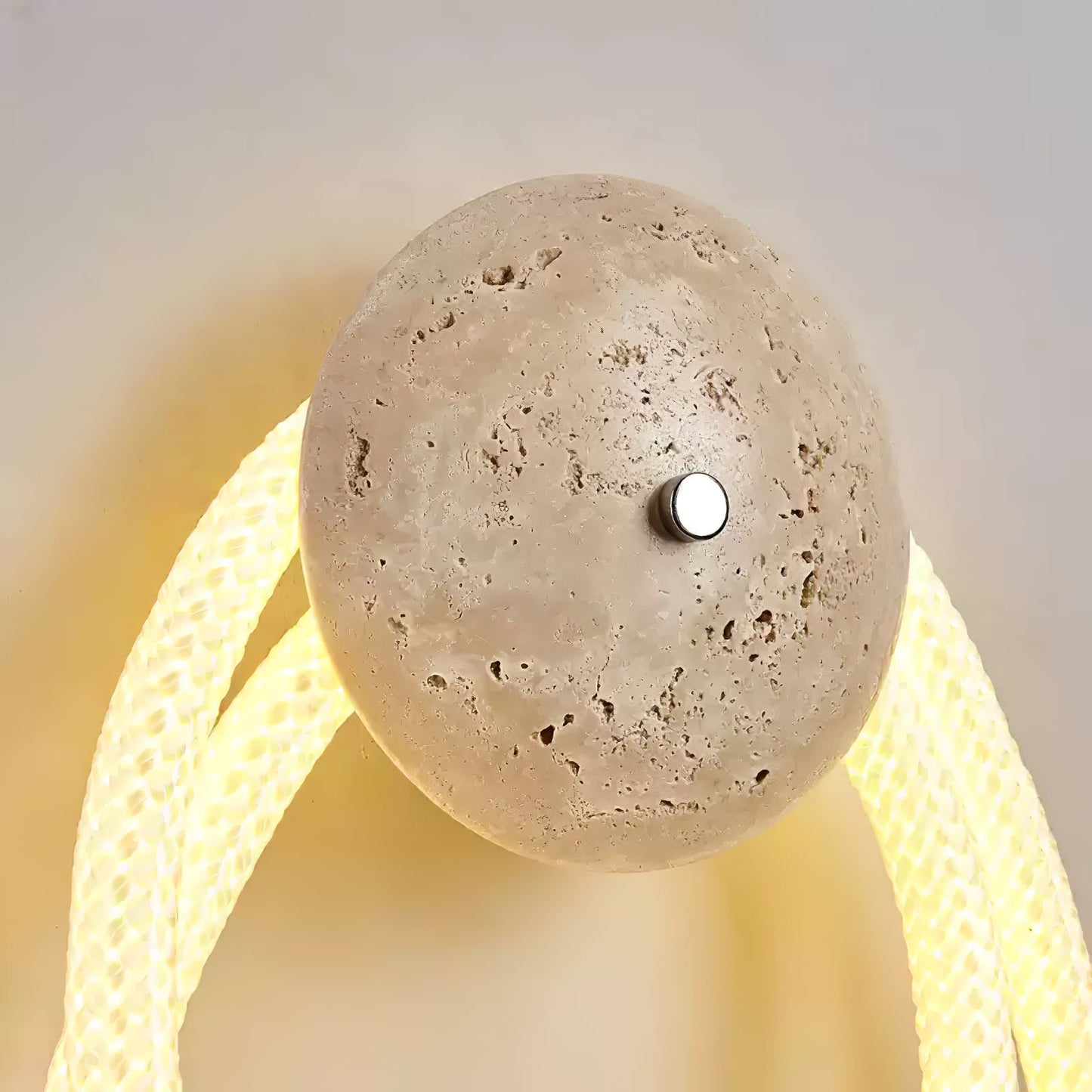 The Loop Wall Sconce features a glowing braided fiber light strip elegantly looped around a natural stone base, creating a striking sculptural presence. Reminiscent of a luminous necklace, the flexible light gently drapes and glows with a soft, ambient tone. The contrast between the tactile stone and the smooth, fluid line of the LED strip adds a refined balance of material and form. Ideal for hallways, bedrooms, or artistic interiors, this wall light is both functional and visually poetic.