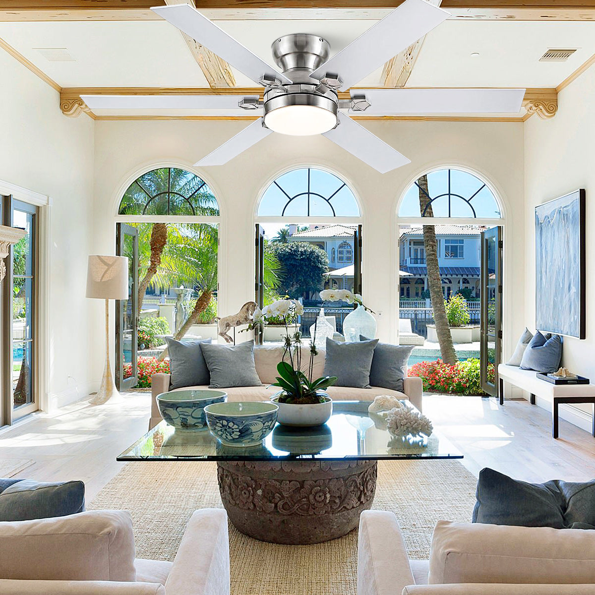 Suitable for bedrooms, living rooms, and covered outdoor areas. Provides cooling in summer, warmth circulation in winter, and versatile ambient lighting.