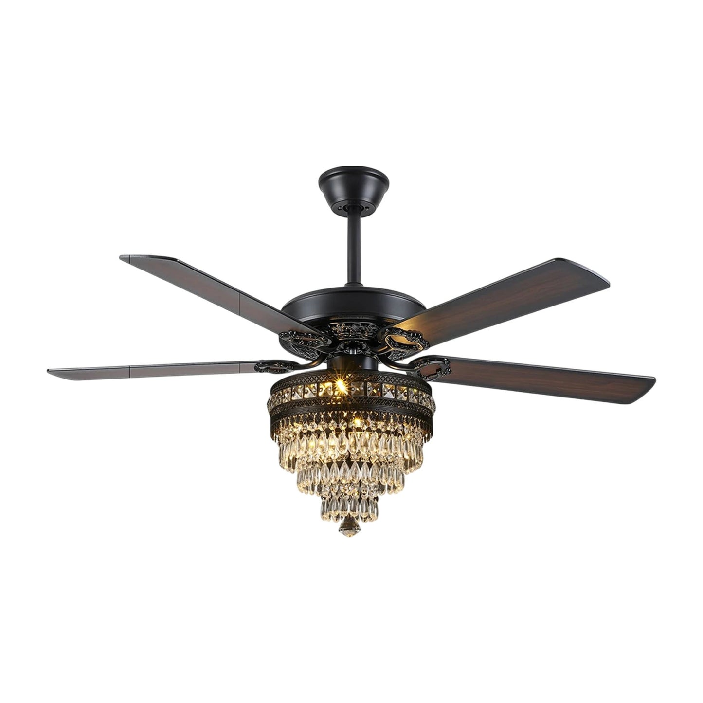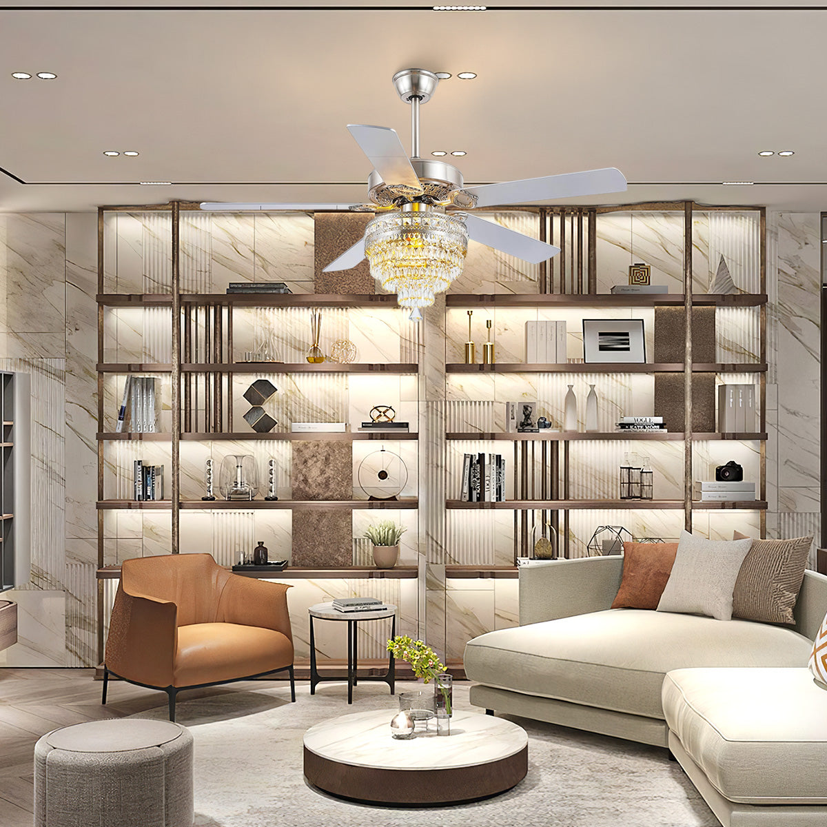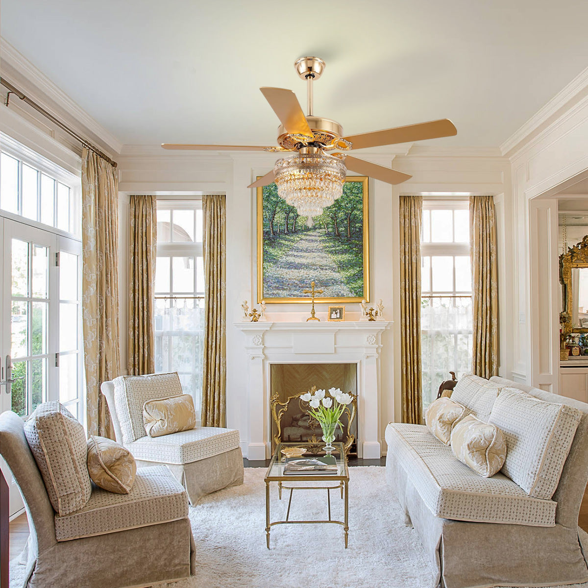 This ceiling fan combines a traditional silhouette with an exquisite crystal lampshade, offering elegance and romance under soft lighting. Designed with a copper AC motor, it ensures quiet, energy-efficient performance while enhancing any living room interior.
