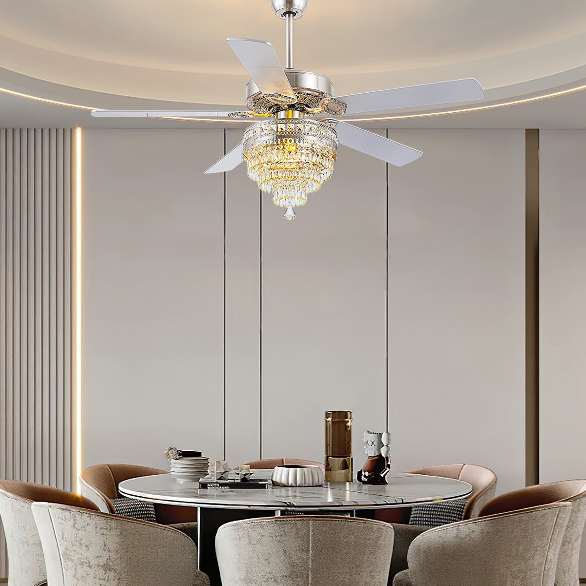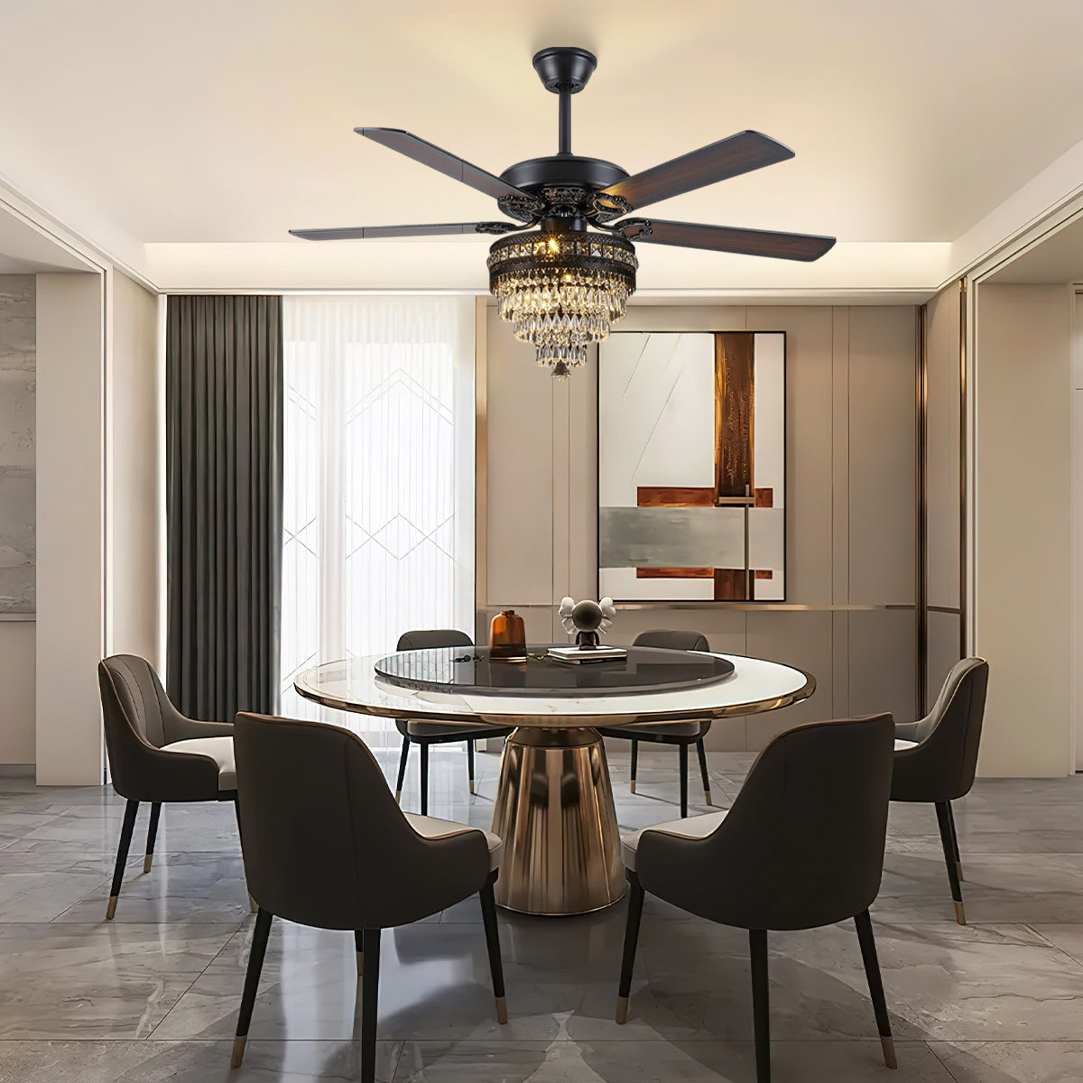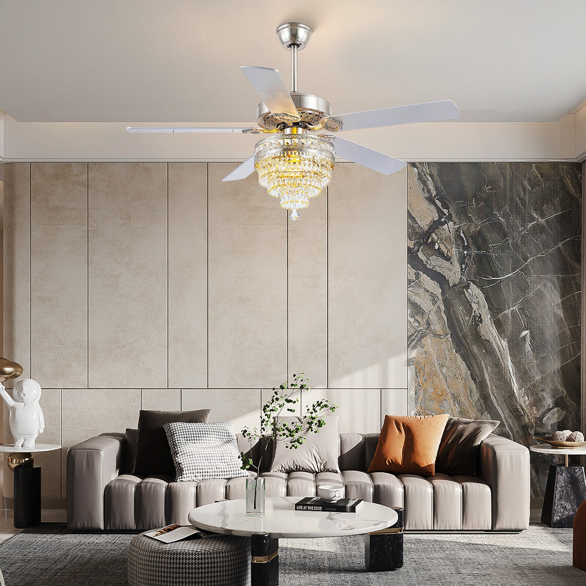 This ceiling fan combines a traditional silhouette with an exquisite crystal lampshade, offering elegance and romance under soft lighting. Designed with a copper AC motor, it ensures quiet, energy-efficient performance while enhancing any living room interior.