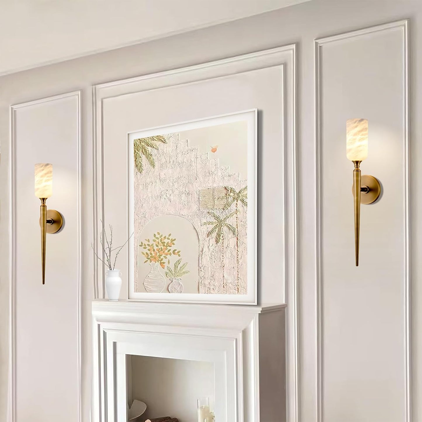 Elevate your interiors with the timeless elegance of this alabaster and brass wall sconce. Each piece is handcrafted with genuine Spanish alabaster, naturally veined and unique, paired with solid brass for a refined touch. Its warm, diffused glow creates a soft, moonlit atmosphere, perfect for enhancing any room.