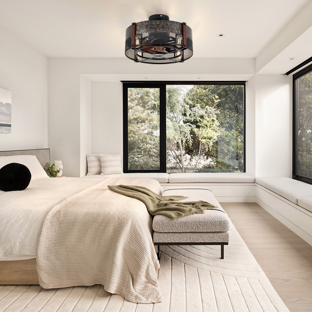 This 19" flush mount caged ceiling fan combines vintage industrial style with modern functionality. Featuring 8 ABS blades enclosed in a sturdy iron cage with handmade hemp rope, it provides strong airflow, quiet operation, and space-saving design—ideal for bedrooms, living rooms, and dining areas.