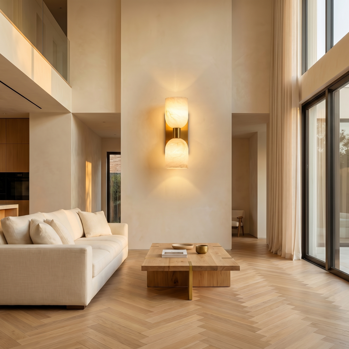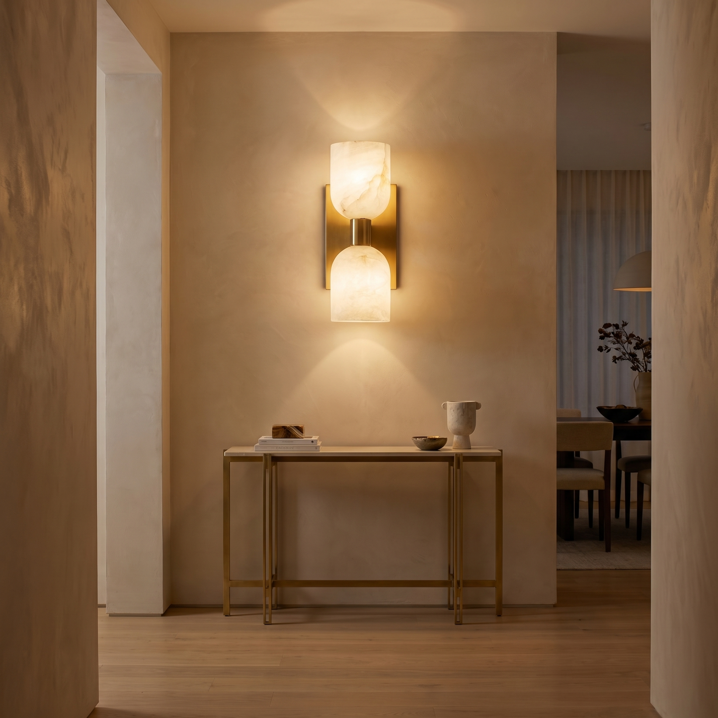 Part of the Sfera Collection, this wall lamp combines natural stone with refined metalwork. Each alabaster element is cut from a single stone block, so no two pieces are identical — the veining, translucency, and mineral tone are unique to every fixture.