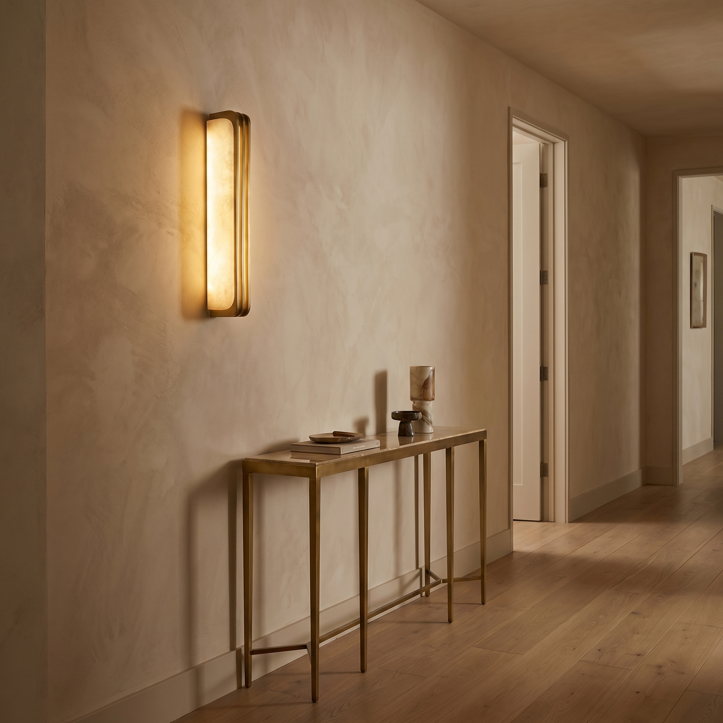 Part of the Striscia Collection, this wall lamp combines natural stone with refined metalwork. Each alabaster element is cut from a single stone block, so no two pieces are identical — the veining, translucency, and mineral tone are unique to every fixture.