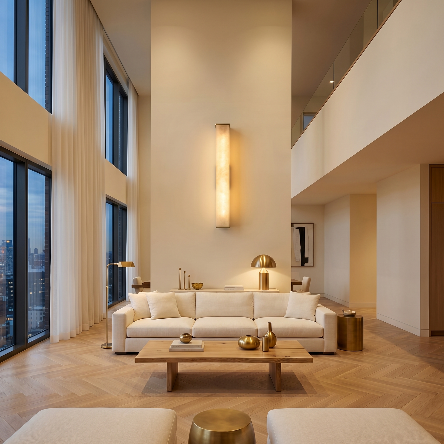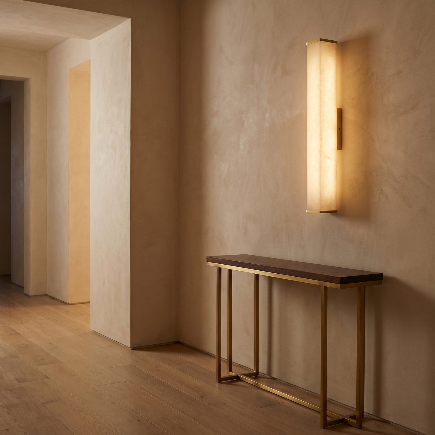 Part of the Striscia Collection, this wall lamp combines natural stone with refined metalwork. Each alabaster element is cut from a single stone block, so no two pieces are identical — the veining, translucency, and mineral tone are unique to every fixture.