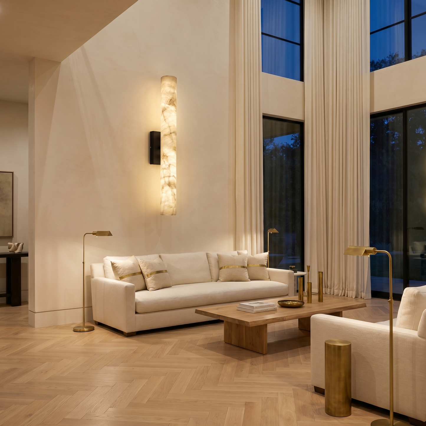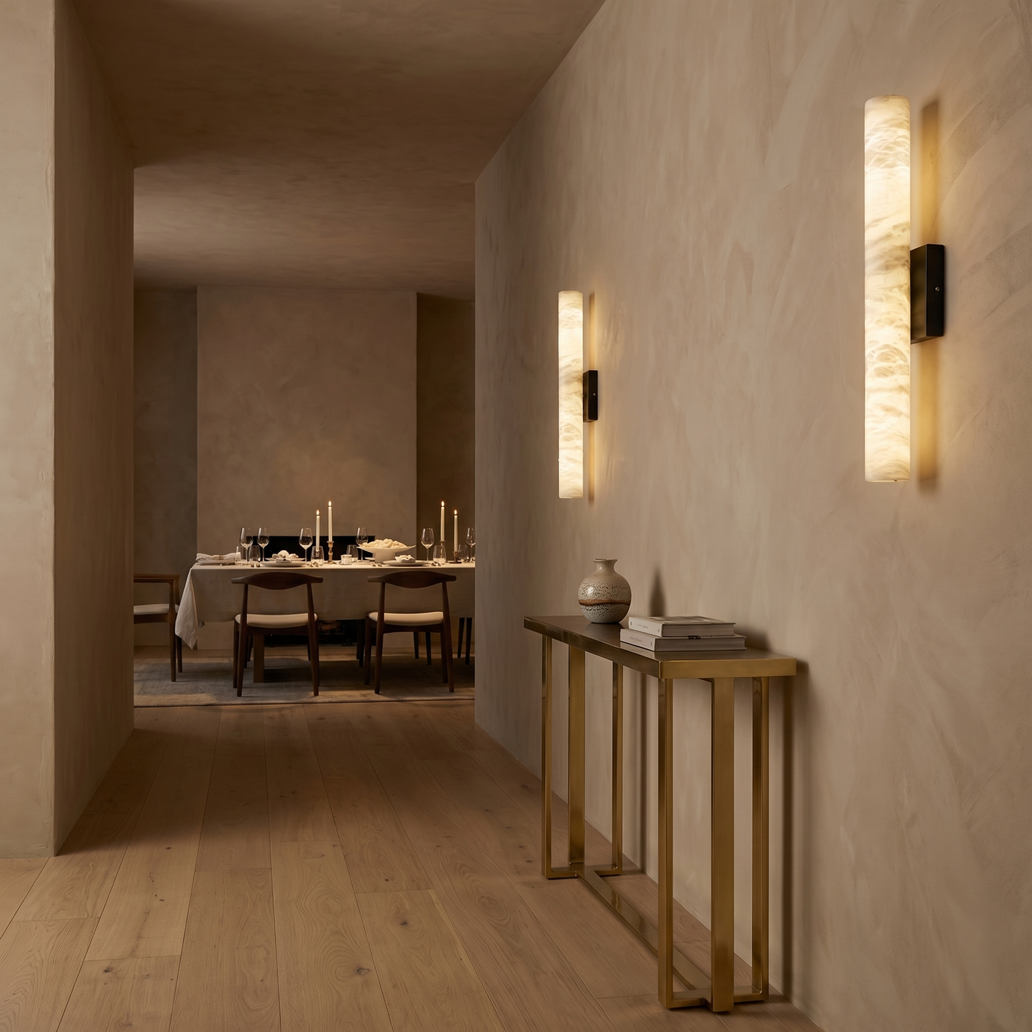 Part of the Capsula Collection, this wall lamp combines natural stone with refined metalwork. Each alabaster element is cut from a single stone block, so no two pieces are identical — the veining, translucency, and mineral tone are unique to every fixture.