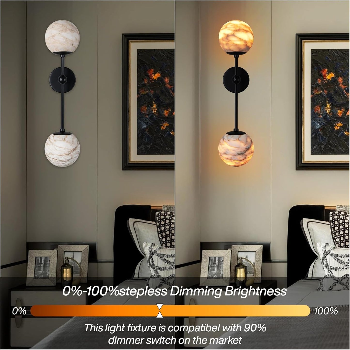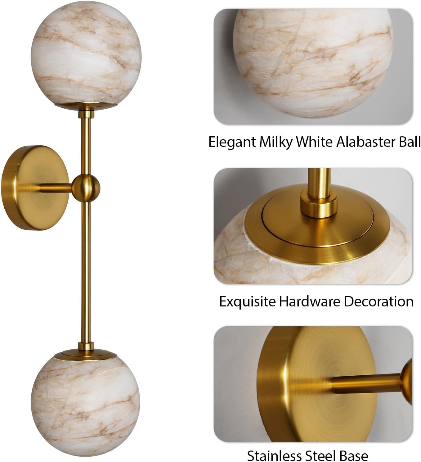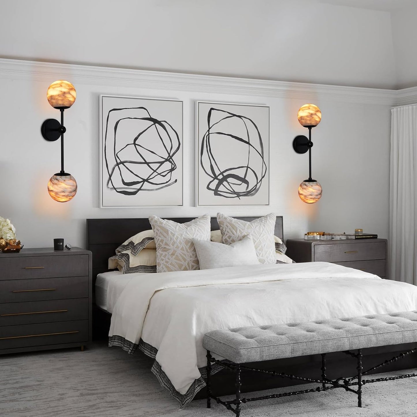 This alabaster globe wall sconce combines natural Spanish stone with a sleek black/gold metal base. Its modern globe design creates a warm, diffused glow, bringing elegance and sophistication to any interior space.