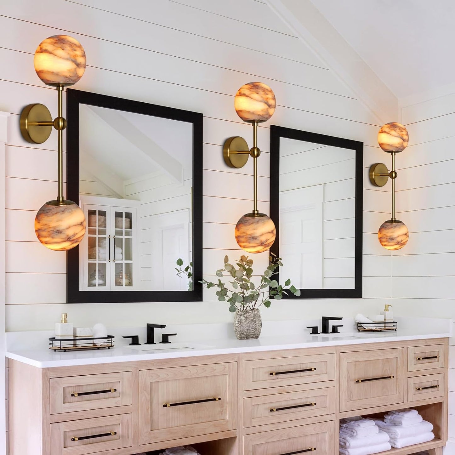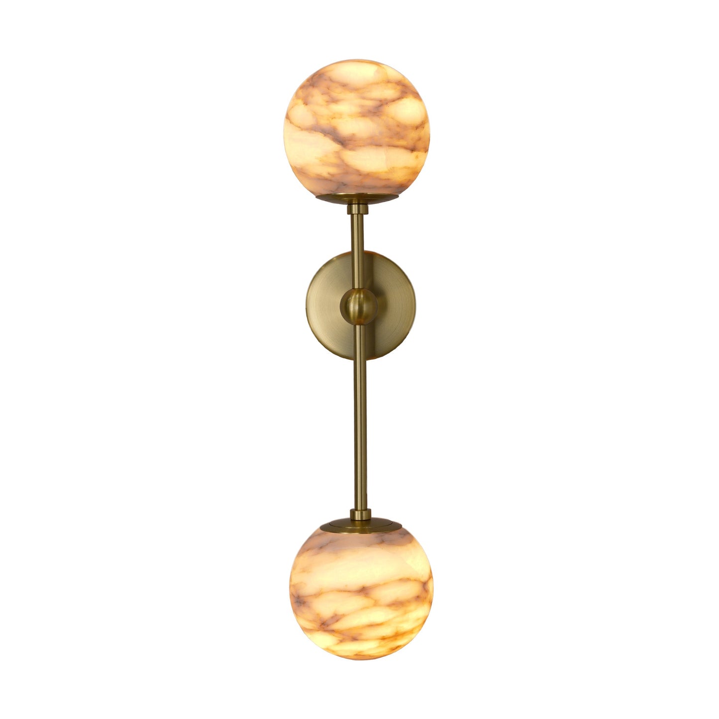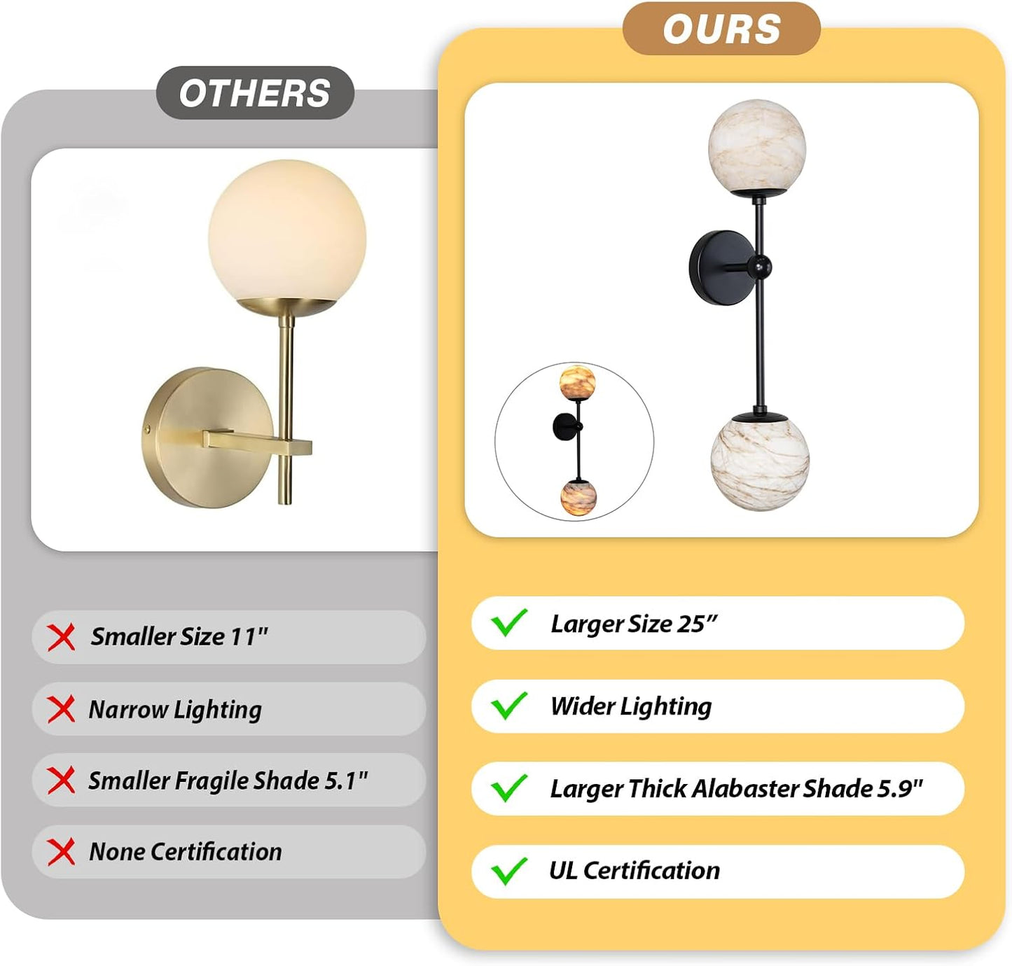 This alabaster globe wall sconce combines natural Spanish stone with a sleek black/gold metal base. Its modern globe design creates a warm, diffused glow, bringing elegance and sophistication to any interior space.
