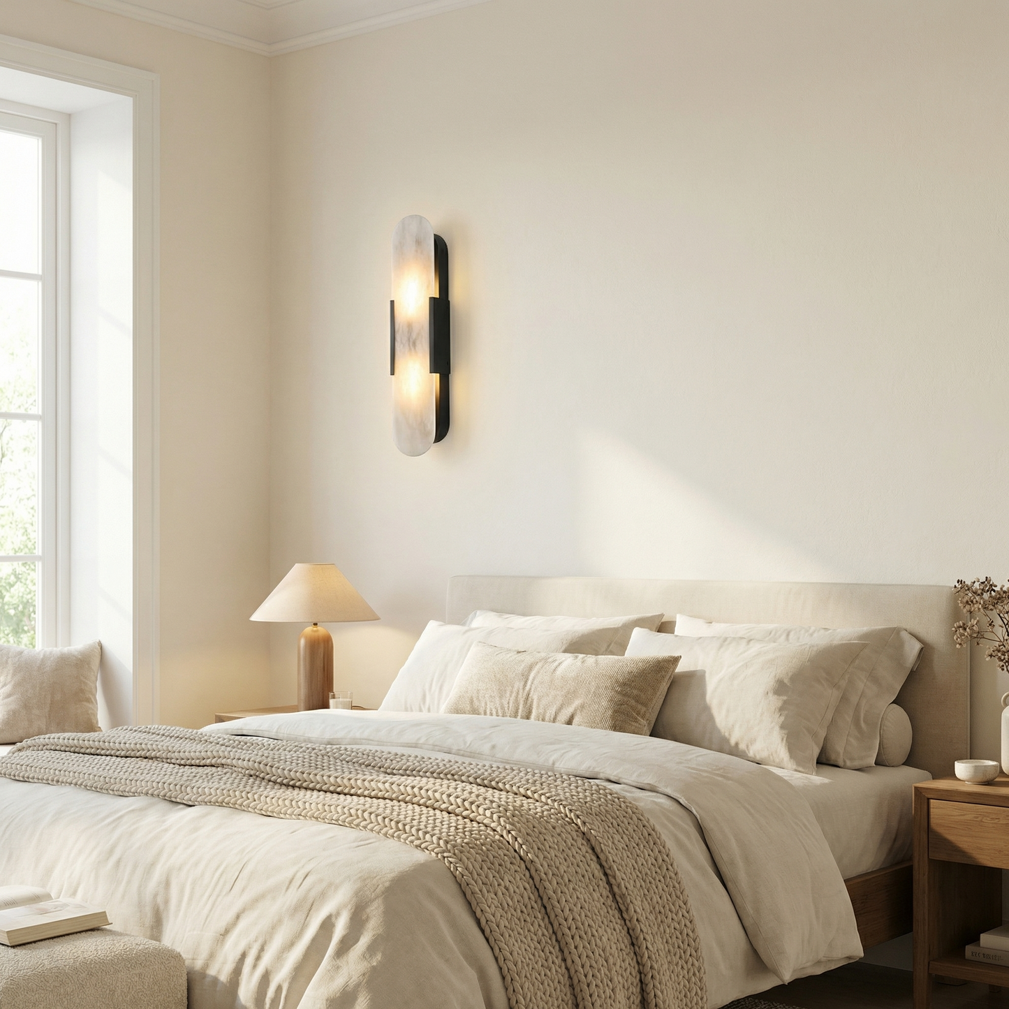 Part of the Sculpted Form Collection, this sculptural wall sconce treats light like a fine art object — hand-shaped alabaster forms paired with architectural metalwork, turning every wall into a gallery of warm, glowing stone.