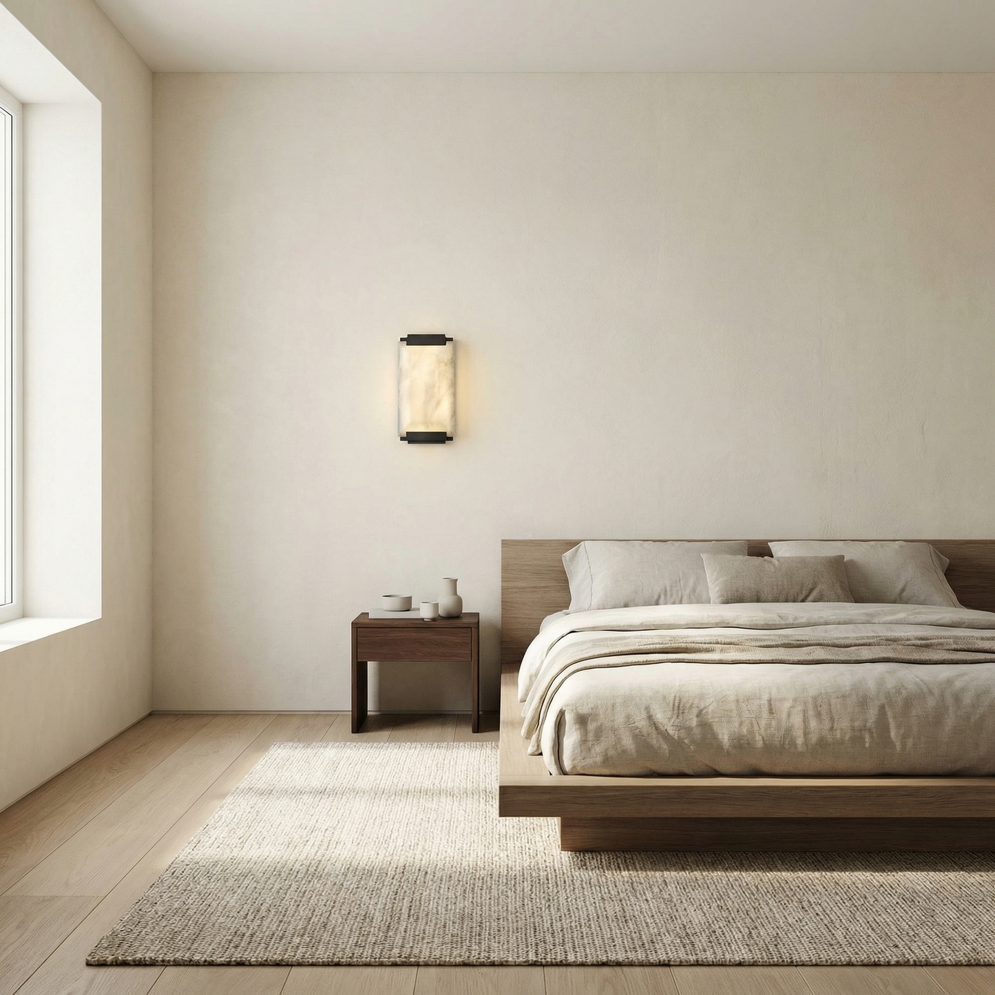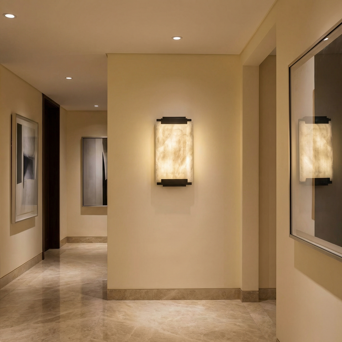 Part of the Framed Slab Collection, this wall sconce frames a translucent alabaster panel within an architectural metal surround — a study in structured geometry where warm stone and crisp lines balance each other.