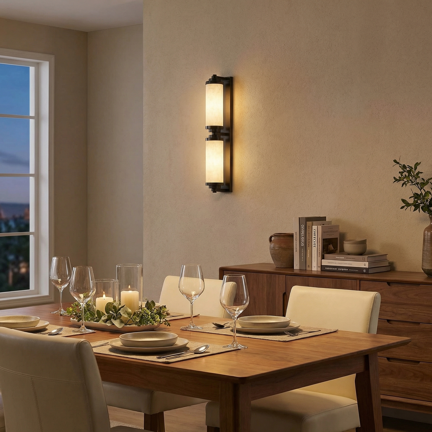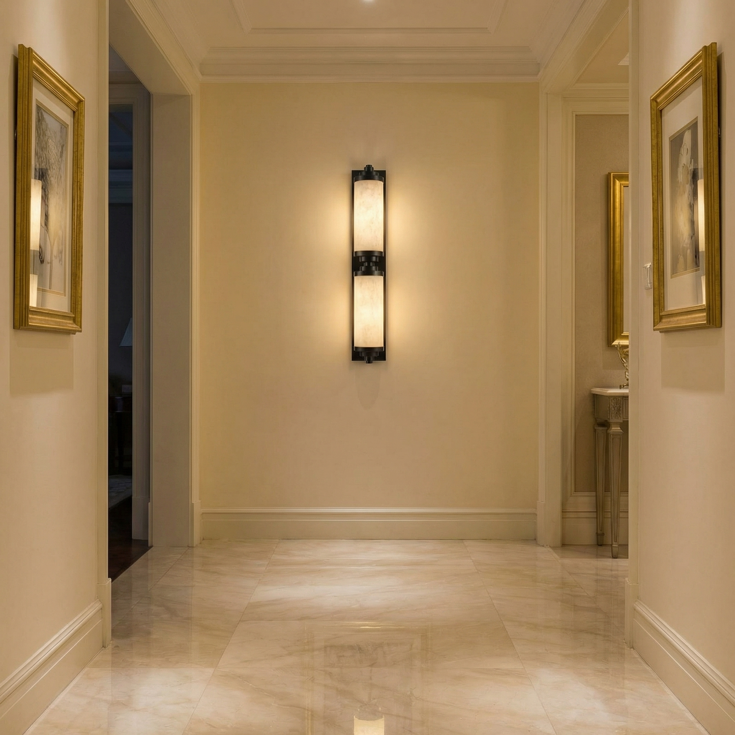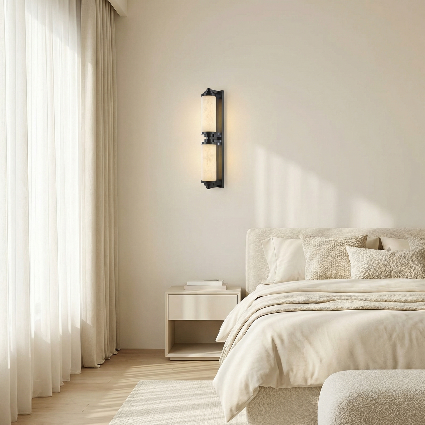 Part of the Cylinder Arm Collection, this architectural wall sconce pairs a solid alabaster cylinder shade with a sculpted metal arm — the stone glows with a warm, candle-like light, bringing timeless hotel-lobby sophistication to any wall.