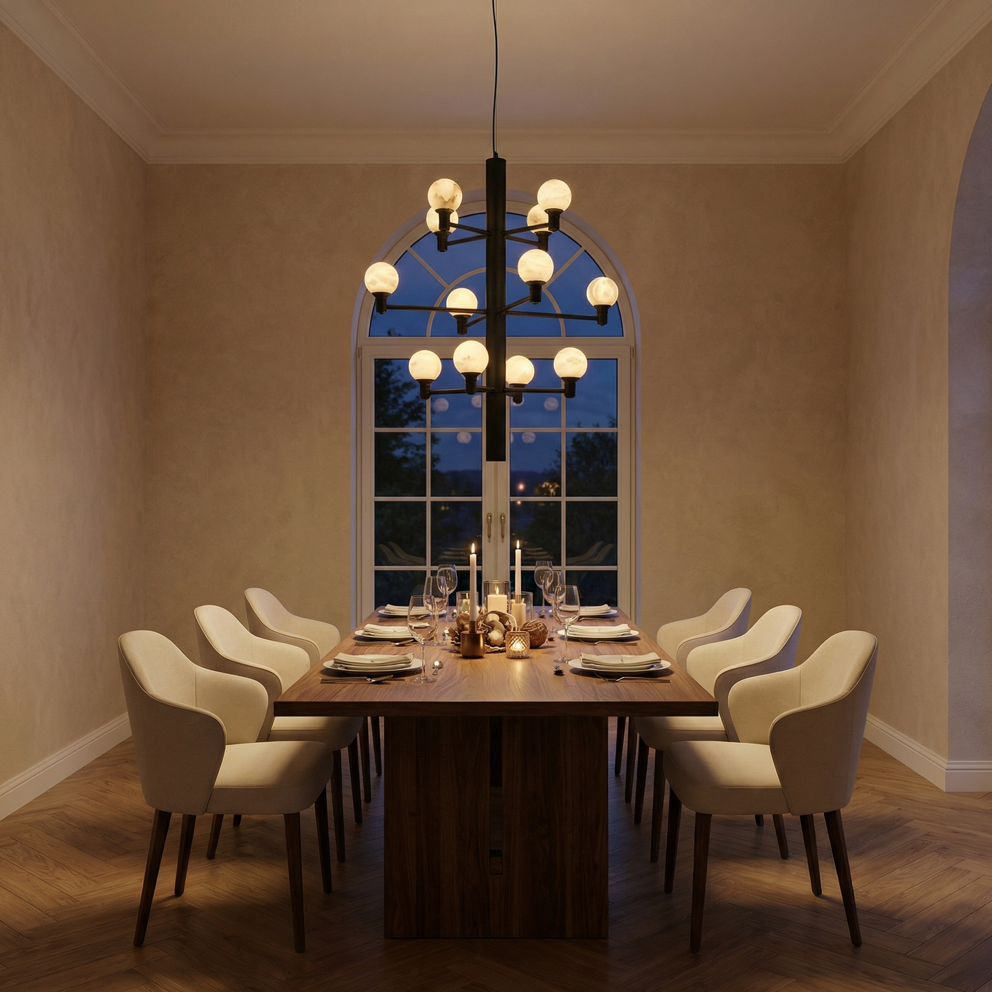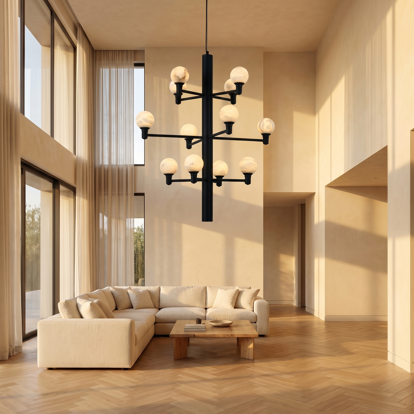 Part of the Ramo Collection, this chandelier combines natural stone with refined metalwork. Each alabaster element is cut from a single stone block, so no two pieces are identical — the veining, translucency, and mineral tone are unique to every fixture.