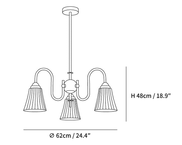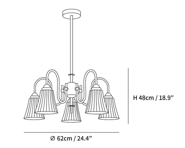 Intricately pleated shade lamps meet a simple frame in the Esther Chandelier. The white Ceramic for soft illumination in your space, in a balanced configuration. A straightforward structure made from iron brings a beautiful modern element to a traditional lighting fixture.