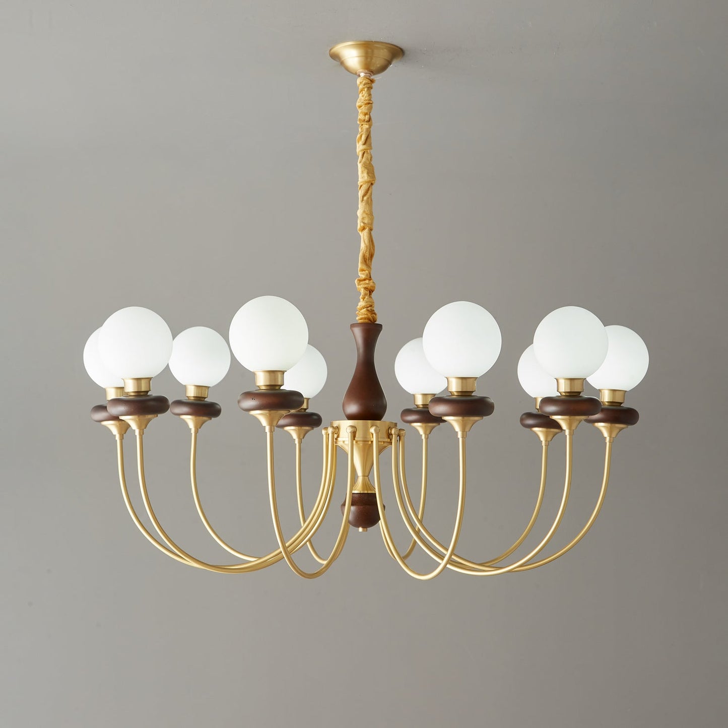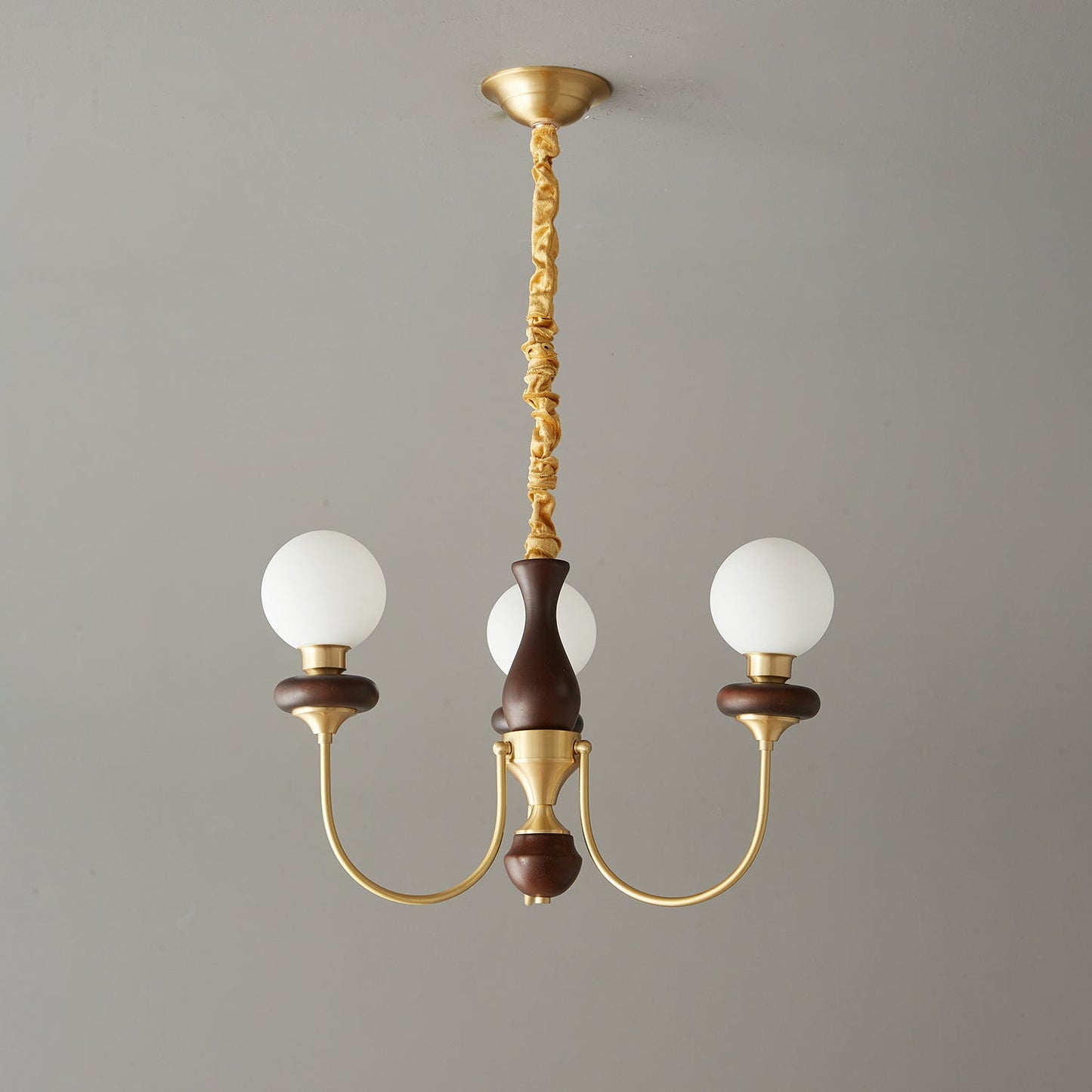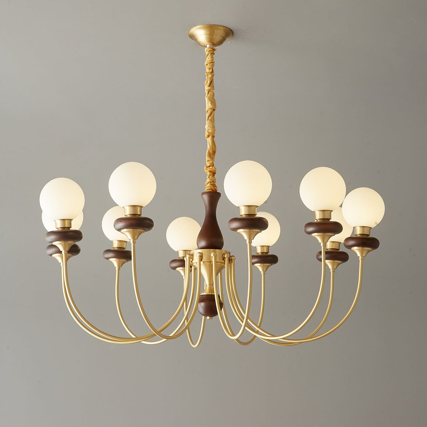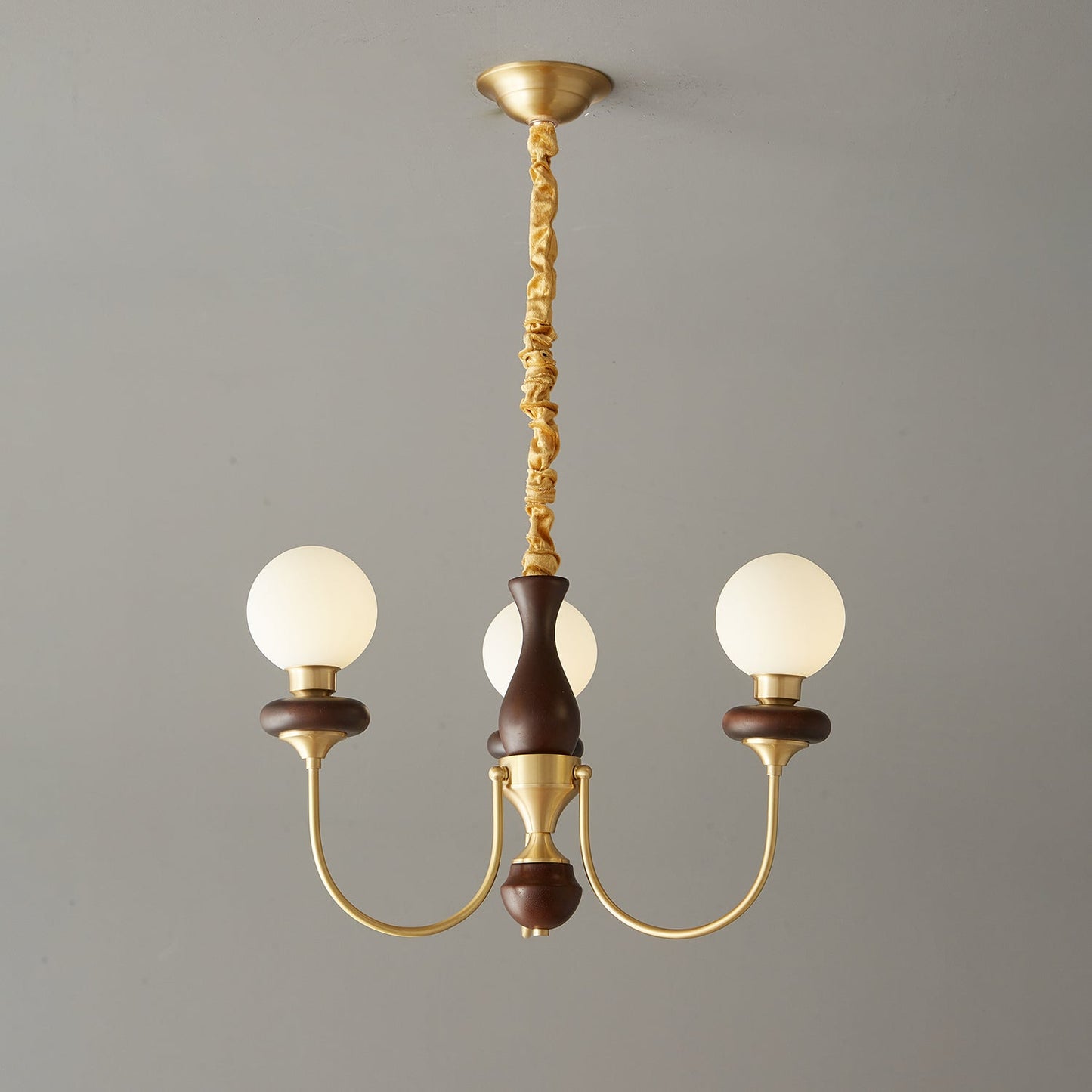 A statement of refined elegance, the YIOSI Bellagio Arc Chandelier draws inspiration from the timeless grandeur of European estates. This chandelier seamlessly blends handcrafted wood accents, gracefully arched brass arms, and frosted glass orbs, creating a symphony of warmth and sophistication. The fluid curves of its golden frame evoke a sense of movement, while the rich wood detailing adds a grounding, organic touch. Suspended by a delicately wrapped fabric cord, this chandelier radiates both vintage charm and contemporary allure, making it the perfect centerpiece for luxurious dining rooms, elegant living spaces, and opulent foyers.