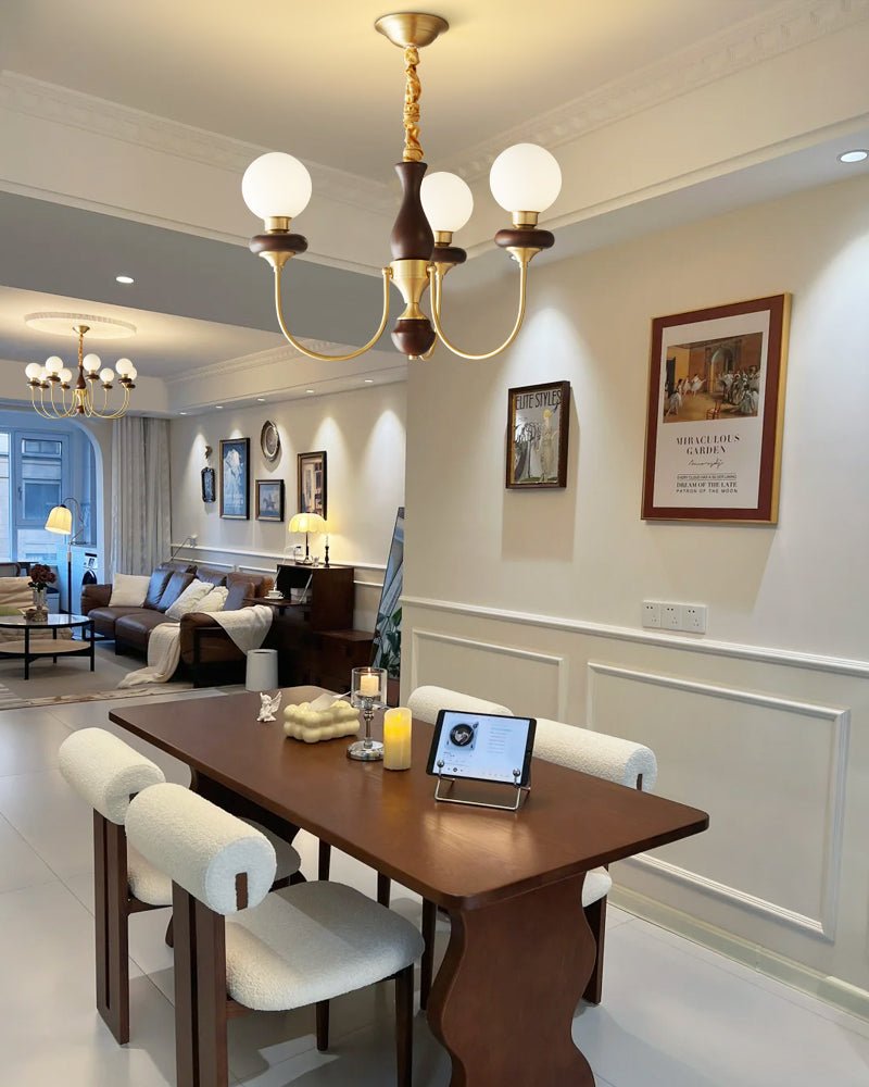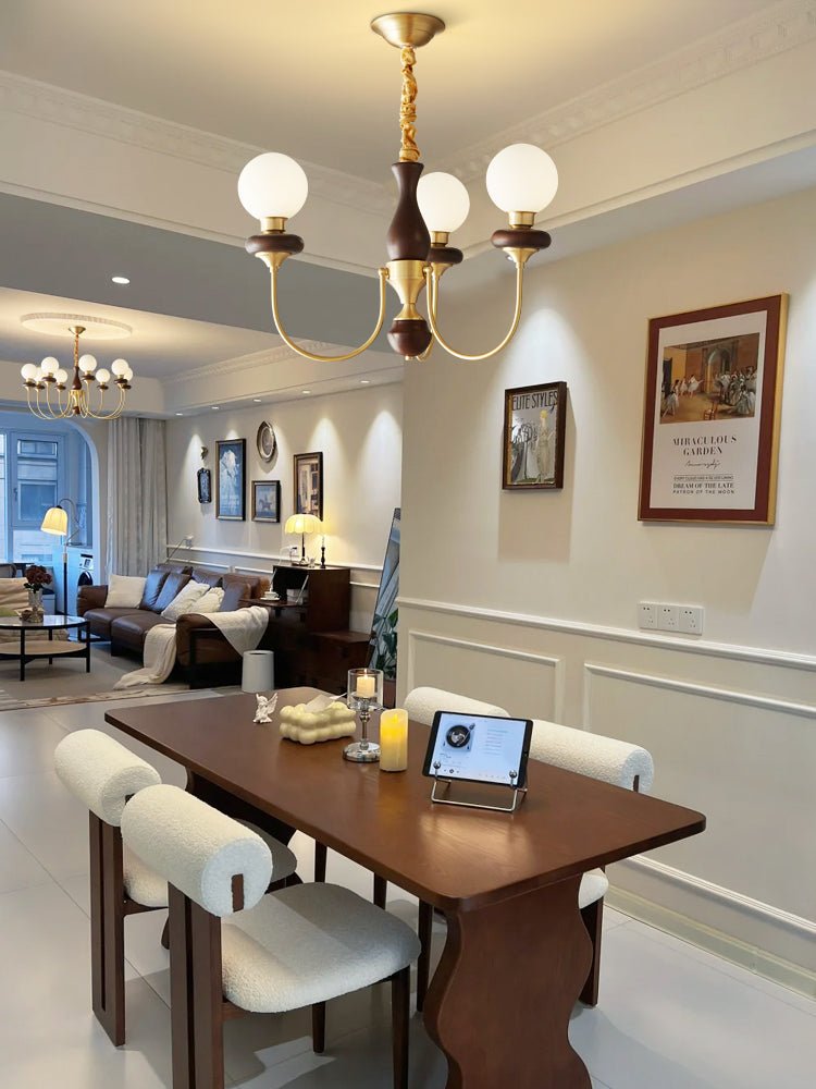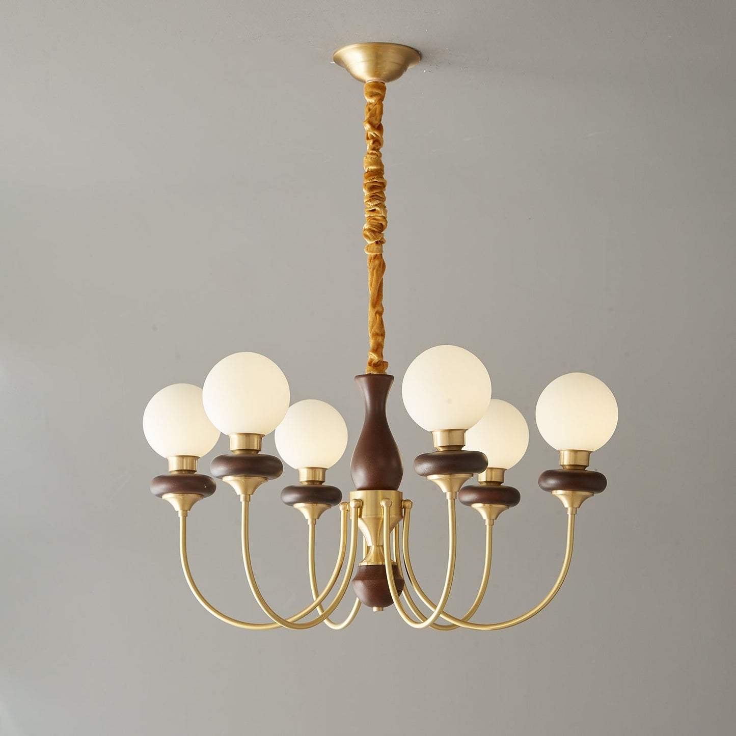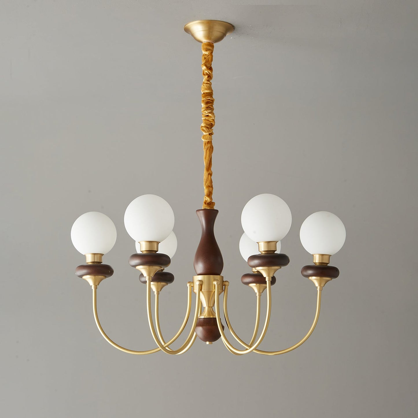 A statement of refined elegance, the YIOSI Bellagio Arc Chandelier draws inspiration from the timeless grandeur of European estates. This chandelier seamlessly blends handcrafted wood accents, gracefully arched brass arms, and frosted glass orbs, creating a symphony of warmth and sophistication. The fluid curves of its golden frame evoke a sense of movement, while the rich wood detailing adds a grounding, organic touch. Suspended by a delicately wrapped fabric cord, this chandelier radiates both vintage charm and contemporary allure, making it the perfect centerpiece for luxurious dining rooms, elegant living spaces, and opulent foyers.