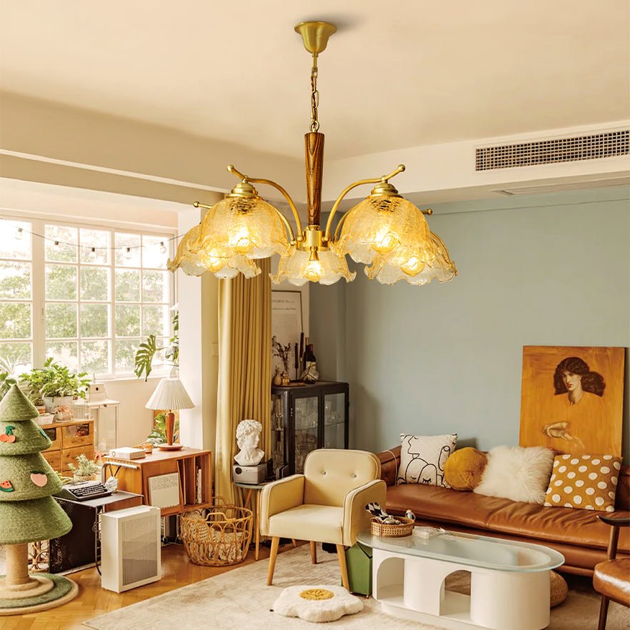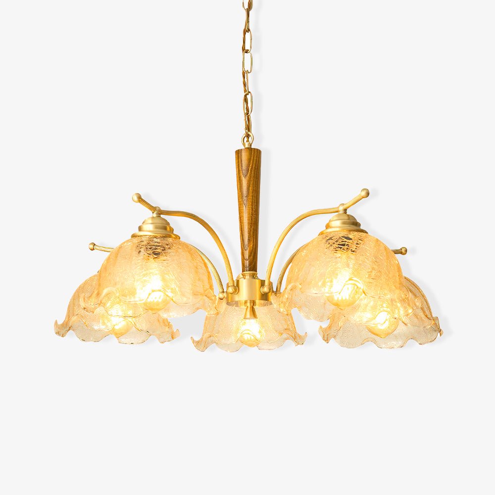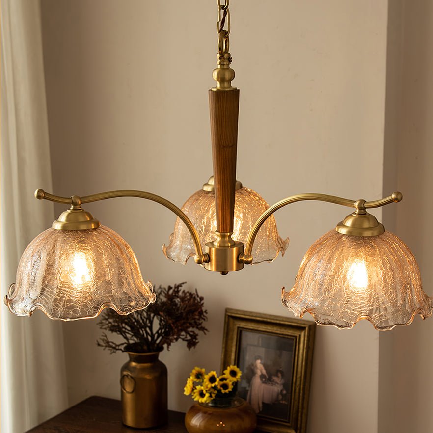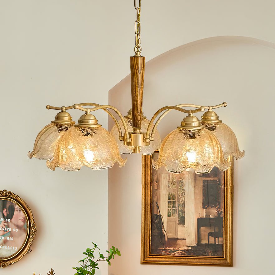 Inspired by the atmosphere of romantic dates in Parisian cafés, this chandelier will enchant anyone with its elegance. Like flower buds about to blossom out on the thin brass stalks, the with cracks flower lampshades diffuse the light, making it soft and comfortable for the eye. The beautiful rounded shapes and harmonious colours make this fixture look aesthetically pleasing.