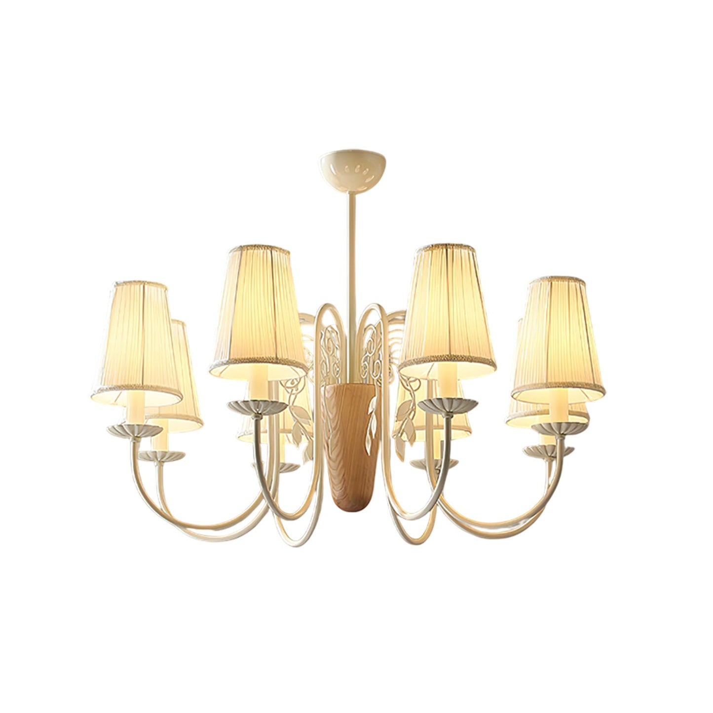 The Evelora Chandelier from YIOSI blends classic elegance with a touch of natural charm. Delicate pleated fabric shades rest gracefully on curved white arms, while the central wooden accent adds warmth and balance to the design. Soft light filters through the shades to create a cozy, inviting atmosphere, making this chandelier a beautiful centerpiece for dining rooms, bedrooms, or any interior that embraces timeless refinement.