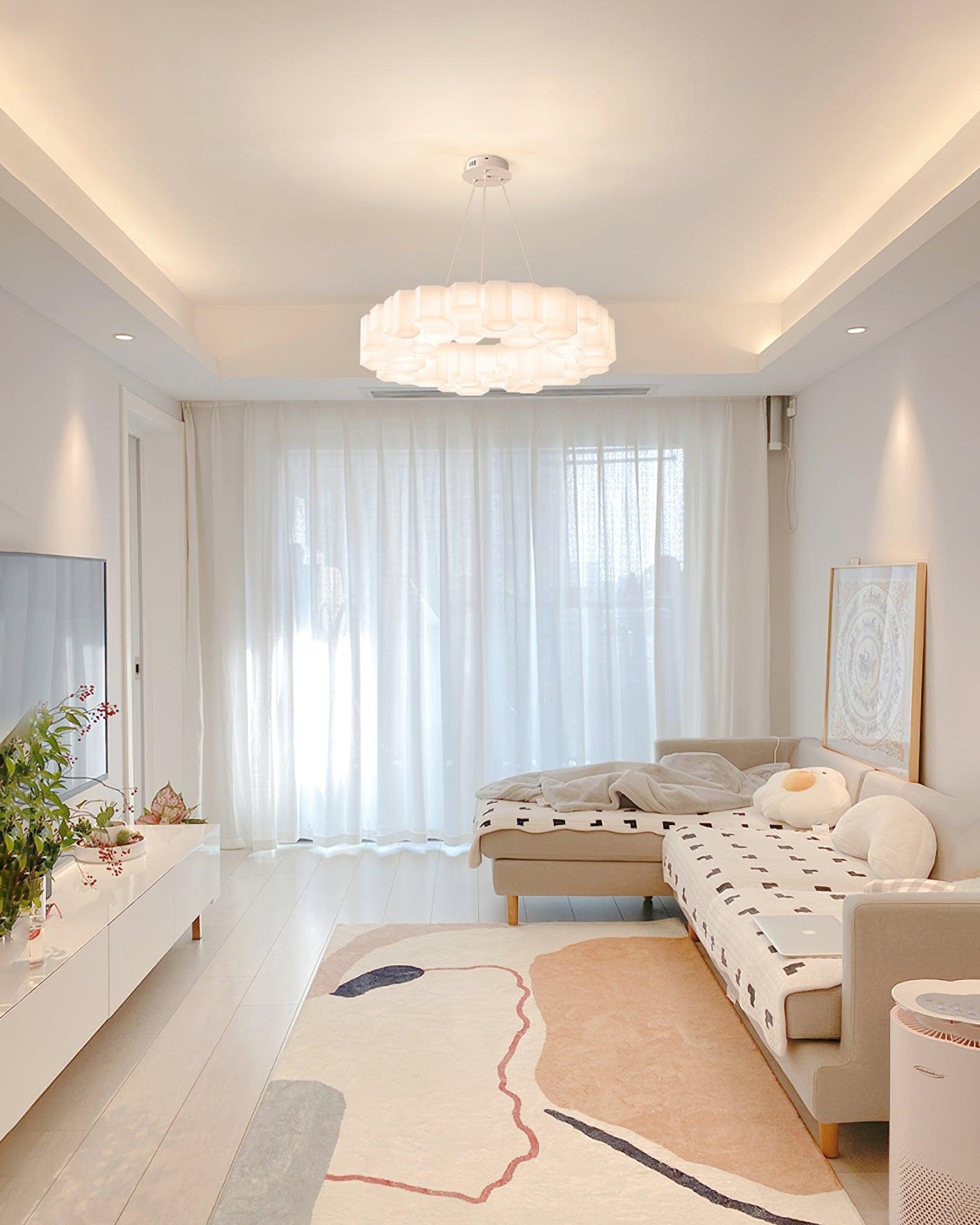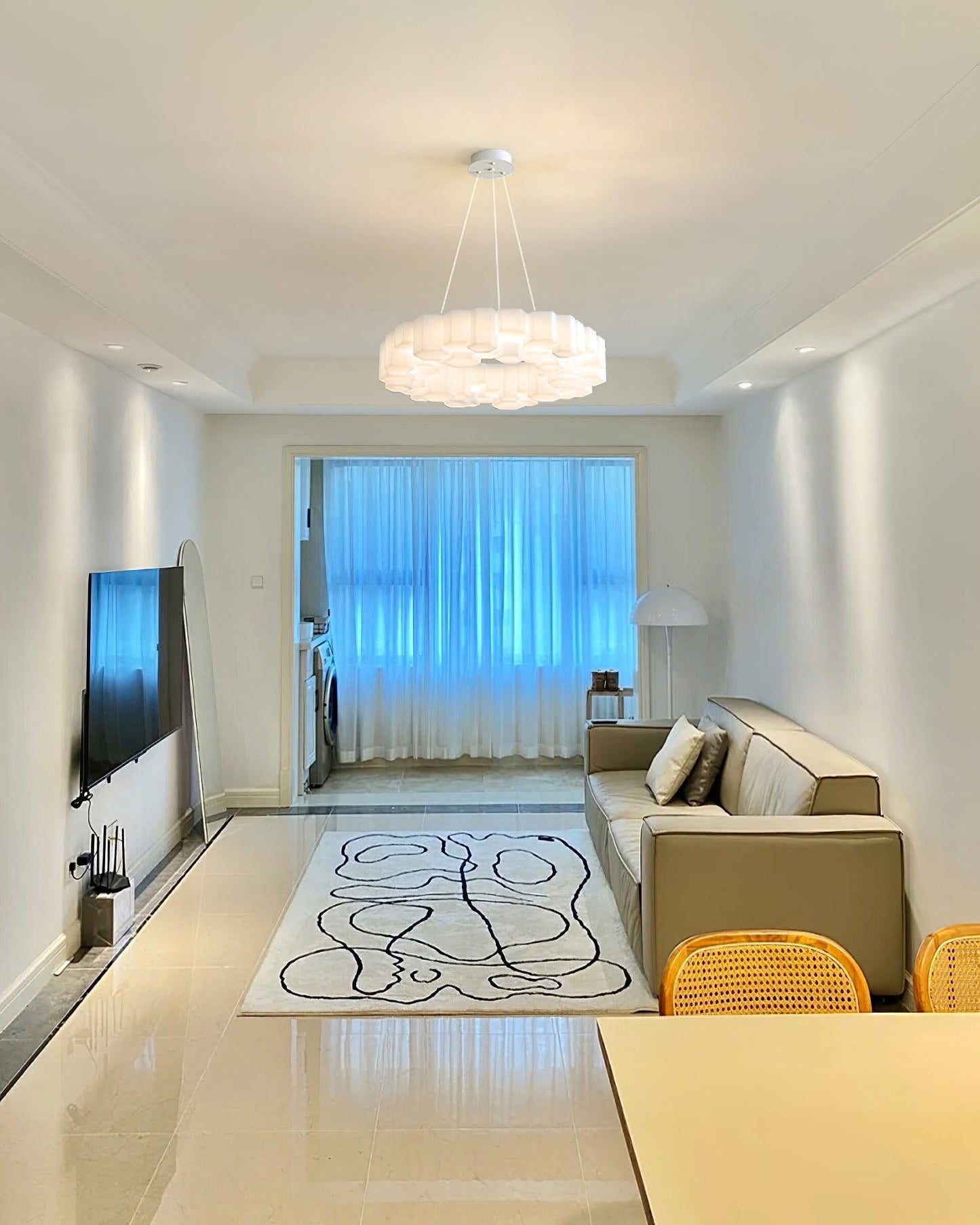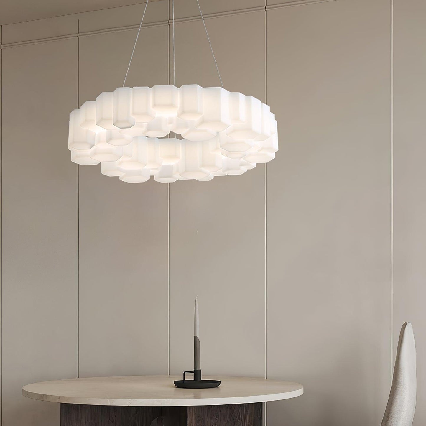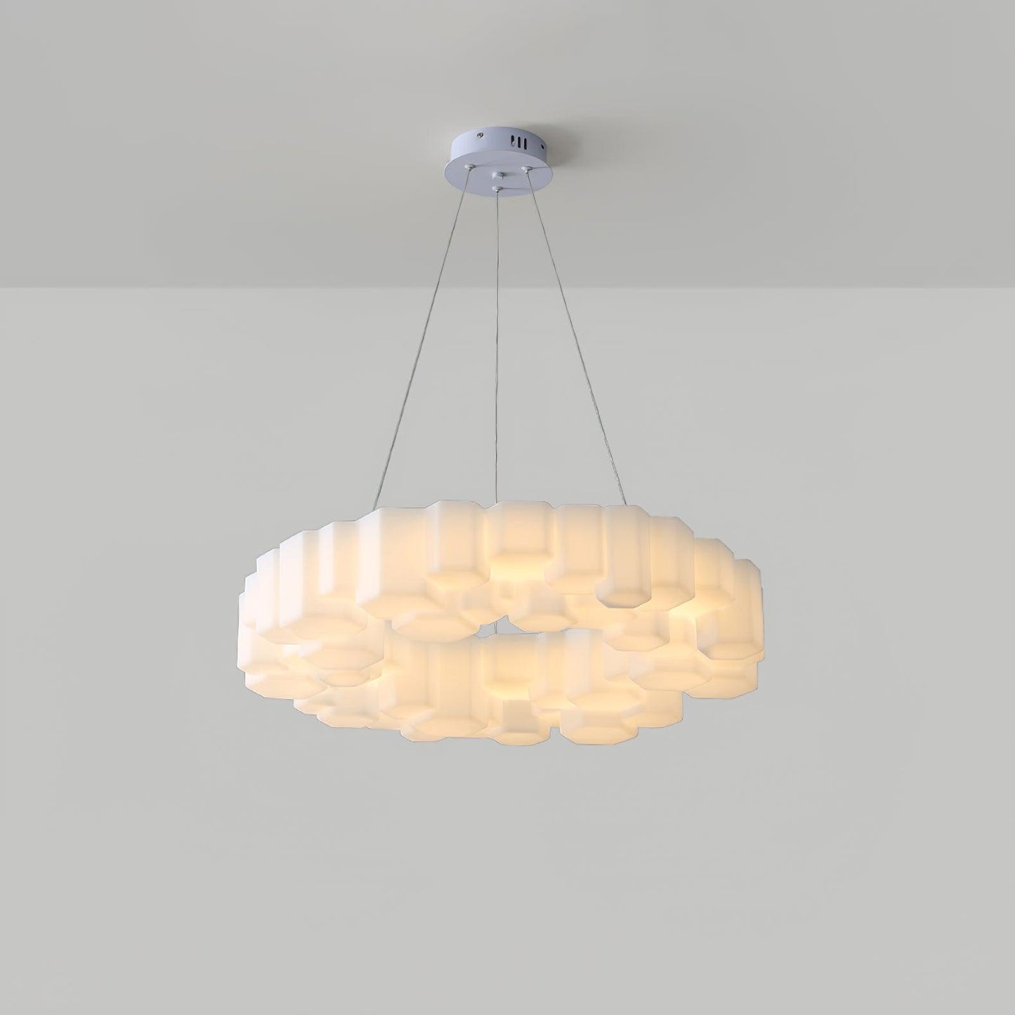 he lamps are made from modules in glossy white polycarbonate, a glass-like and durable material that is used, Its design is reminiscent of the hexagon pattern of honeycombs. The Pendant lights give off a warm and pleasant light.