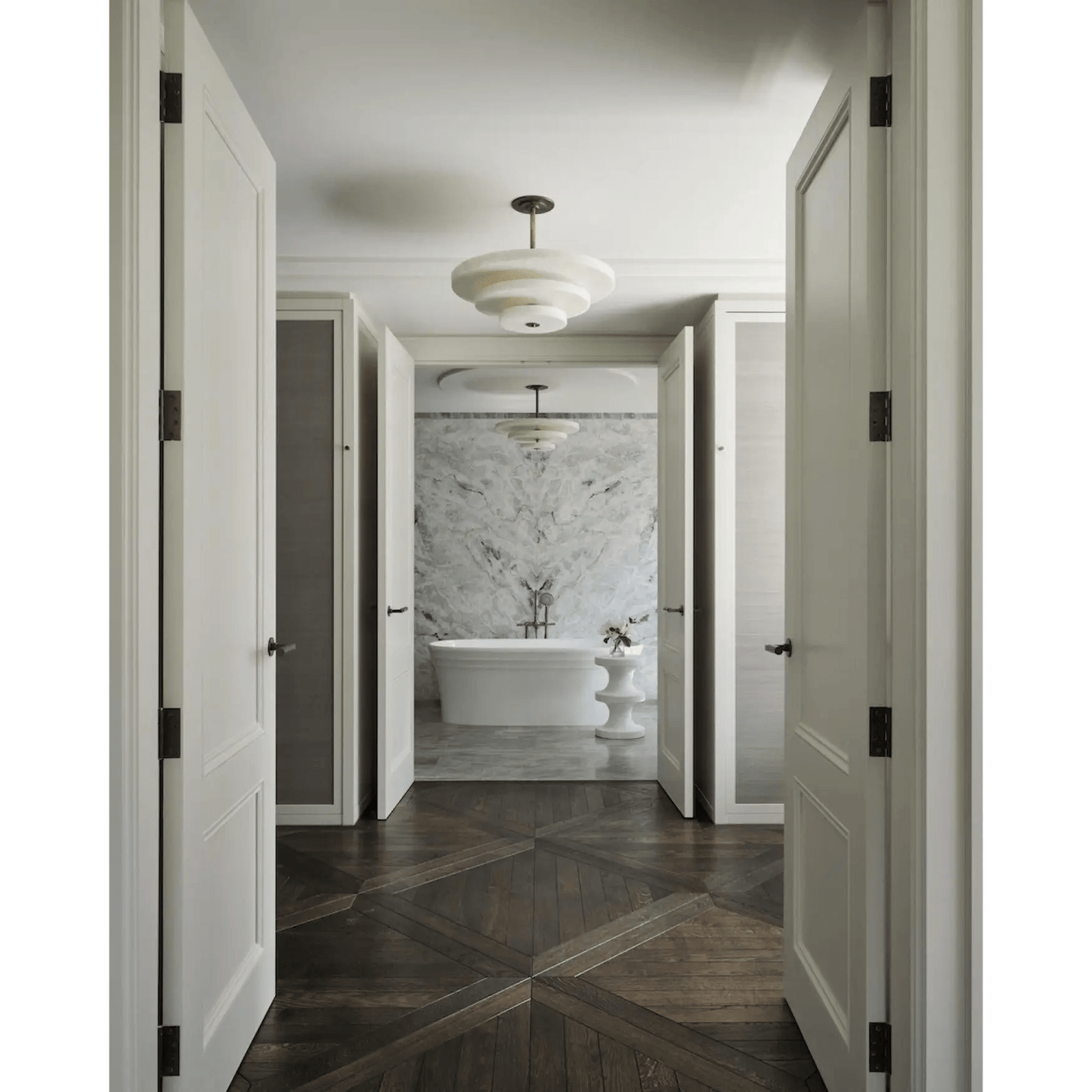 The Ice Queen Alabaster Chandelier showcases a refined tiered design with three smooth alabaster layers that gently diffuse light, producing a warm and inviting ambiance. Its classic round silhouette, enhanced by subtle veining, reflects timeless elegance and luxury. Suspended from a brass metal canopy, this fixture offers a striking contrast that highlights the natural beauty of the stone, making it an expert choice for sophisticated interiors.