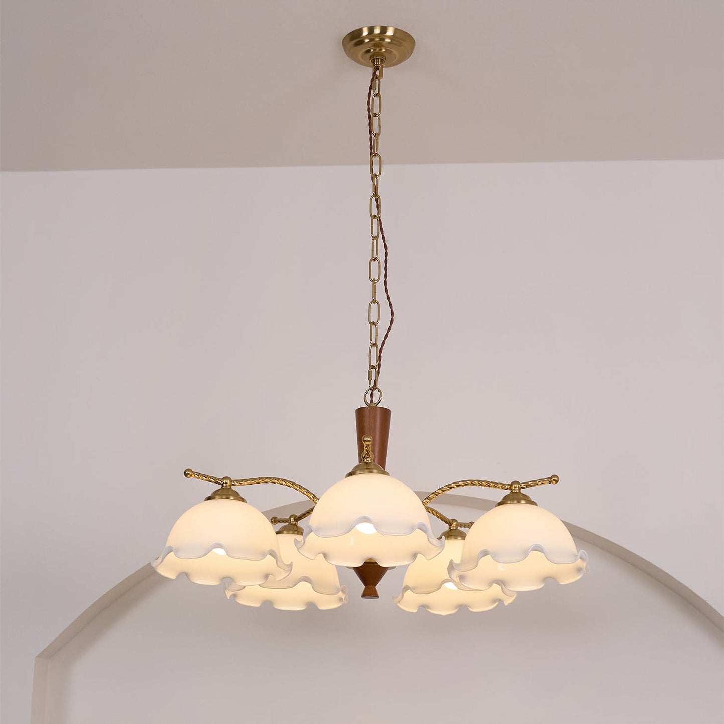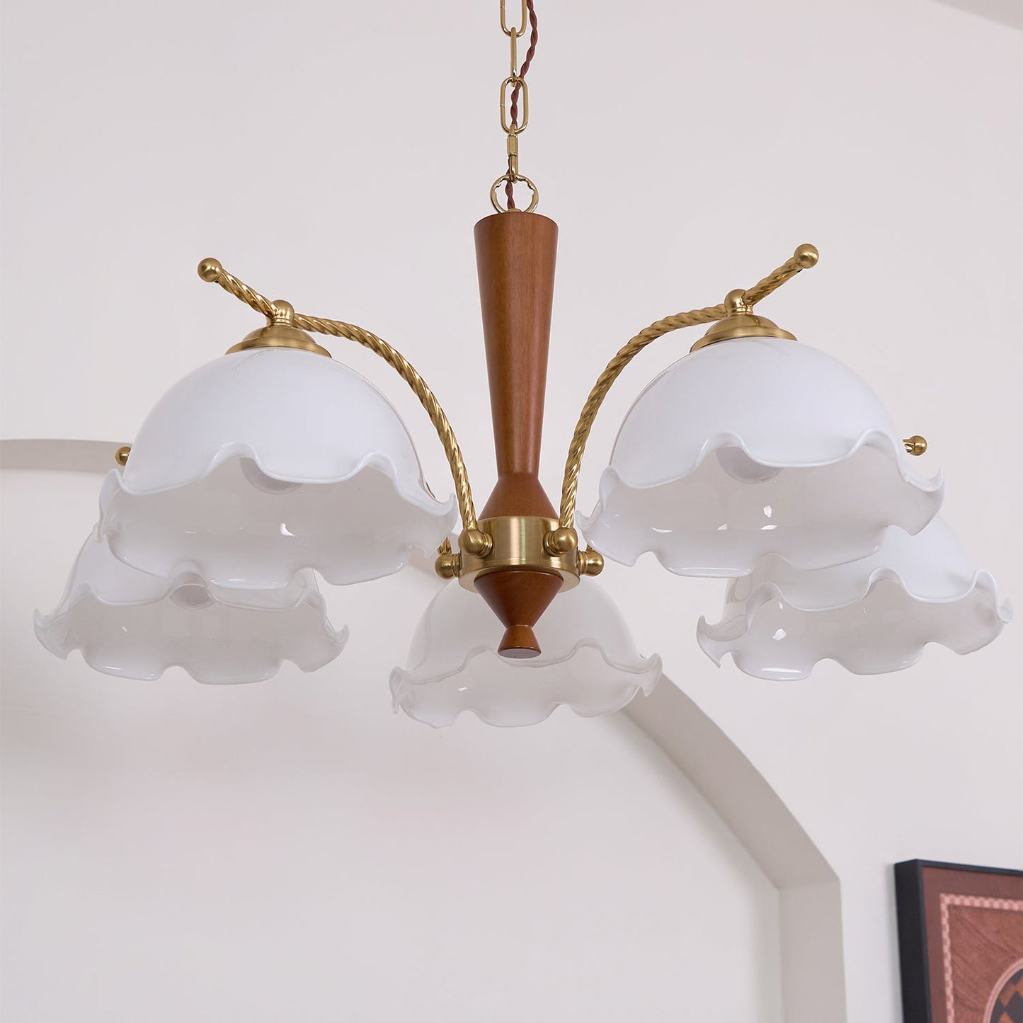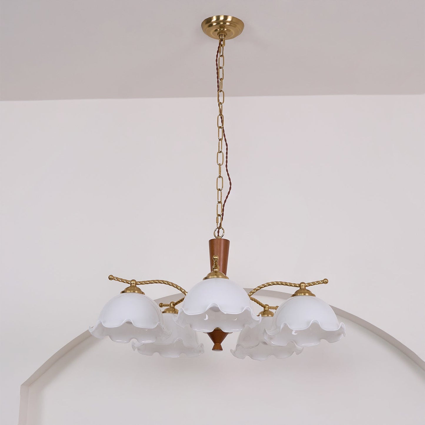 A modern update on the classic chandelier, this is an eye-catching lighting centerpiece sure to raise admiration. The chandelier features a striking flower lampshade. lamp body curving out downwards, this chandelier is a stylish choice for a living room or living space.