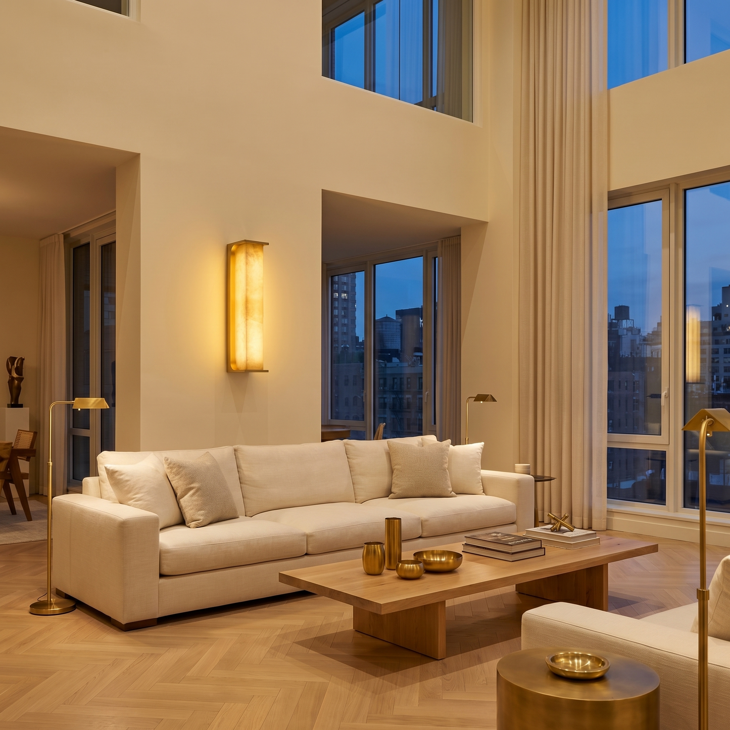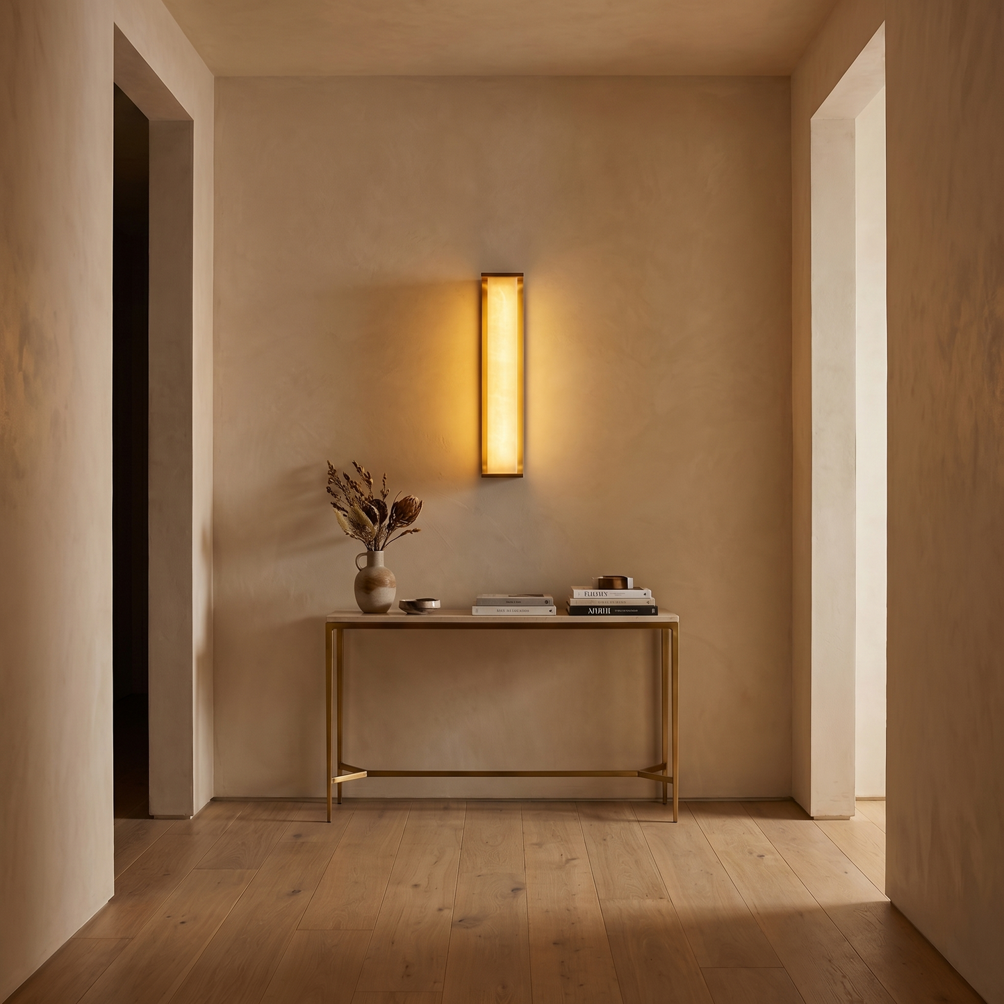 Part of the Cornice Collection, this wall lamp combines natural stone with refined metalwork. Each alabaster element is cut from a single stone block, so no two pieces are identical — the veining, translucency, and mineral tone are unique to every fixture.