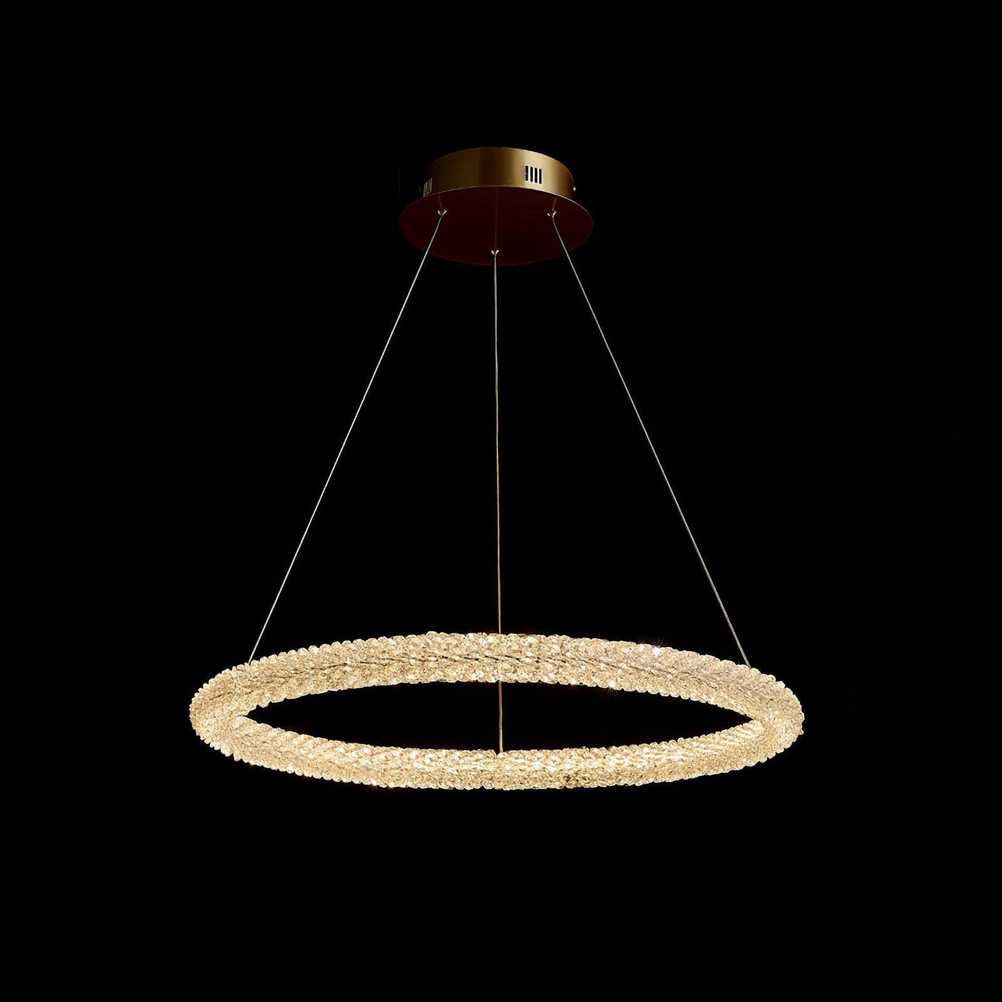 A charming silhouette with a hint of energy and whimsy delivers an uplifting, glamorous look with character. Stylize a modern space with this decadent island chandelier fashioned from Iron lamp body and a chic looped bar of crystal accents. An artful offering from Ring Crystal Chandeliers by designer, its impressive profile draws attention and starts conversations. This elegant fixture features energy-efficient LED technology.