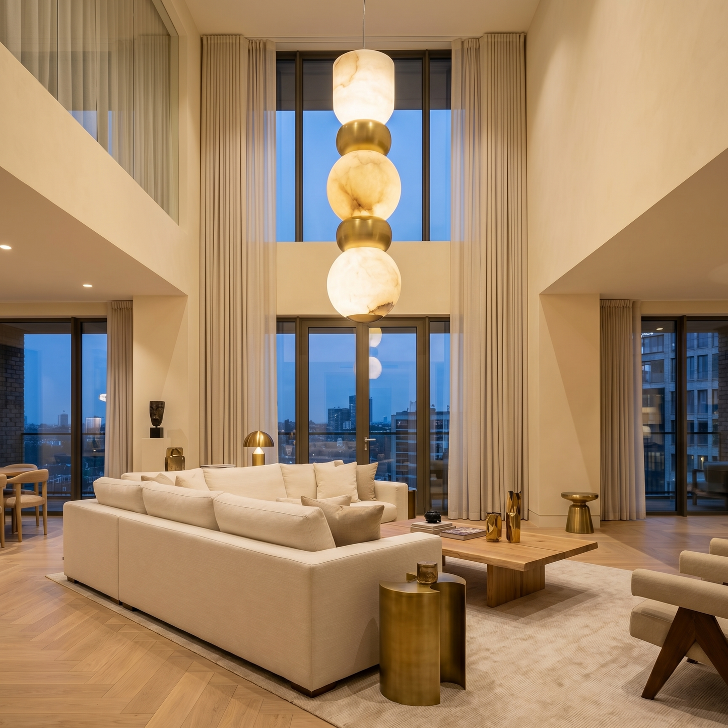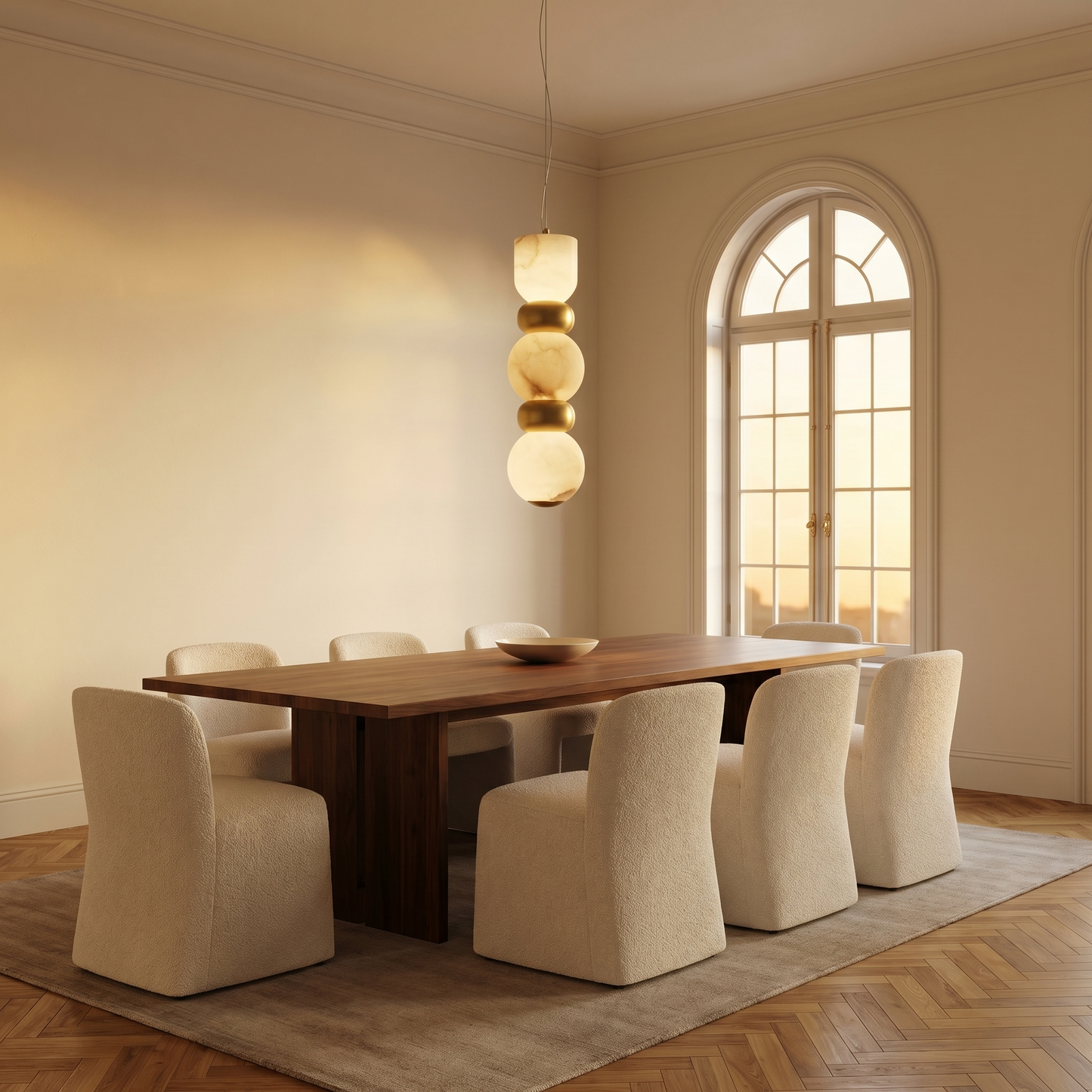 Part of the Totem Collection, this pendant combines natural stone with refined metalwork. Each alabaster element is cut from a single stone block, so no two pieces are identical — the veining, translucency, and mineral tone are unique to every fixture.