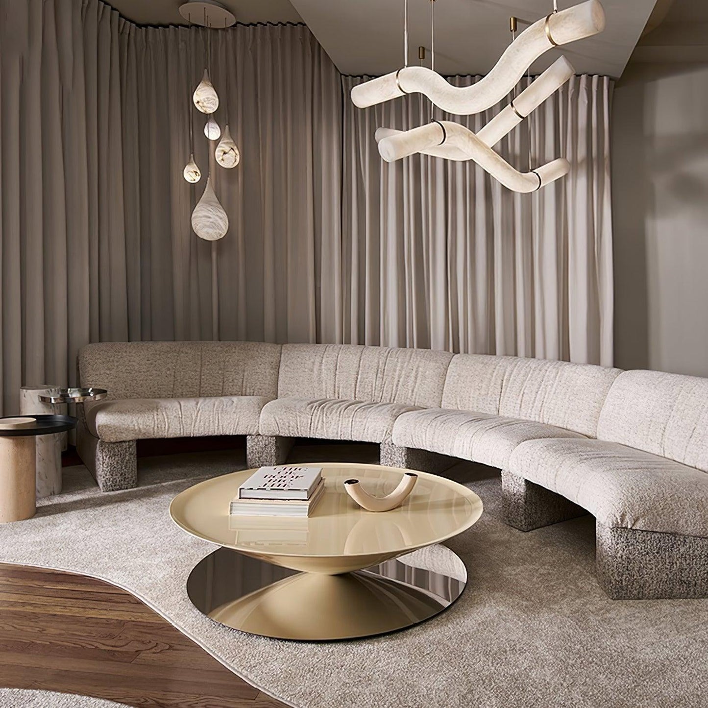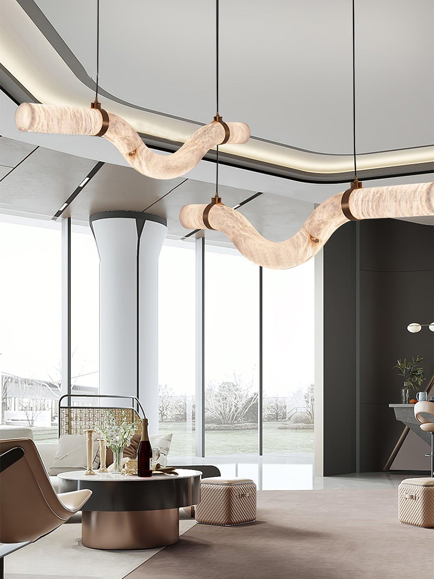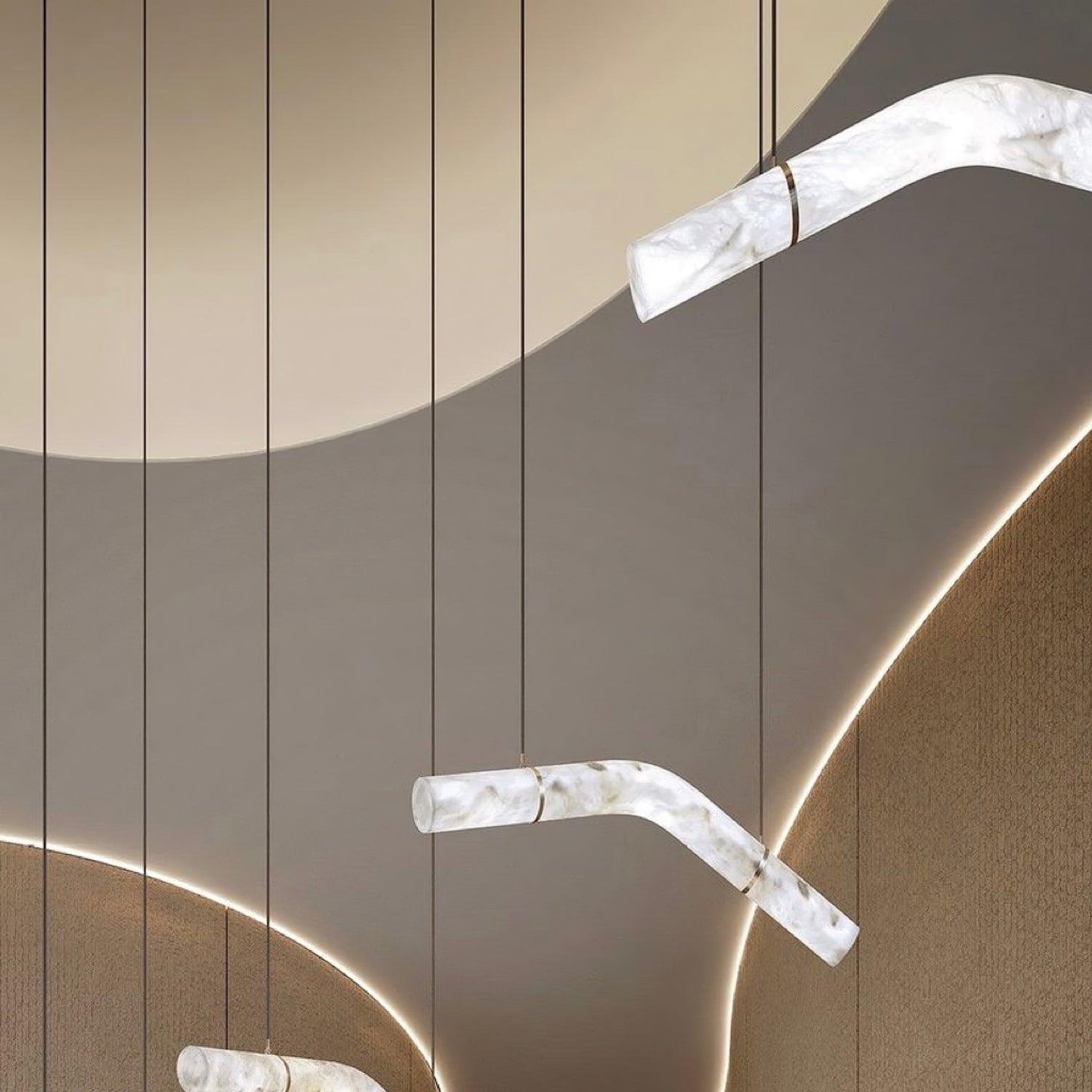 The Infinity Pendant Lamp showcases a sculptural closed-loop design inspired by the infinity symbol. Combining brass, alabaster, and fine leather accents, it radiates a soft, timeless glow. Integrated LED lighting and adjustable suspension make it both elegant and practical for modern interiors.