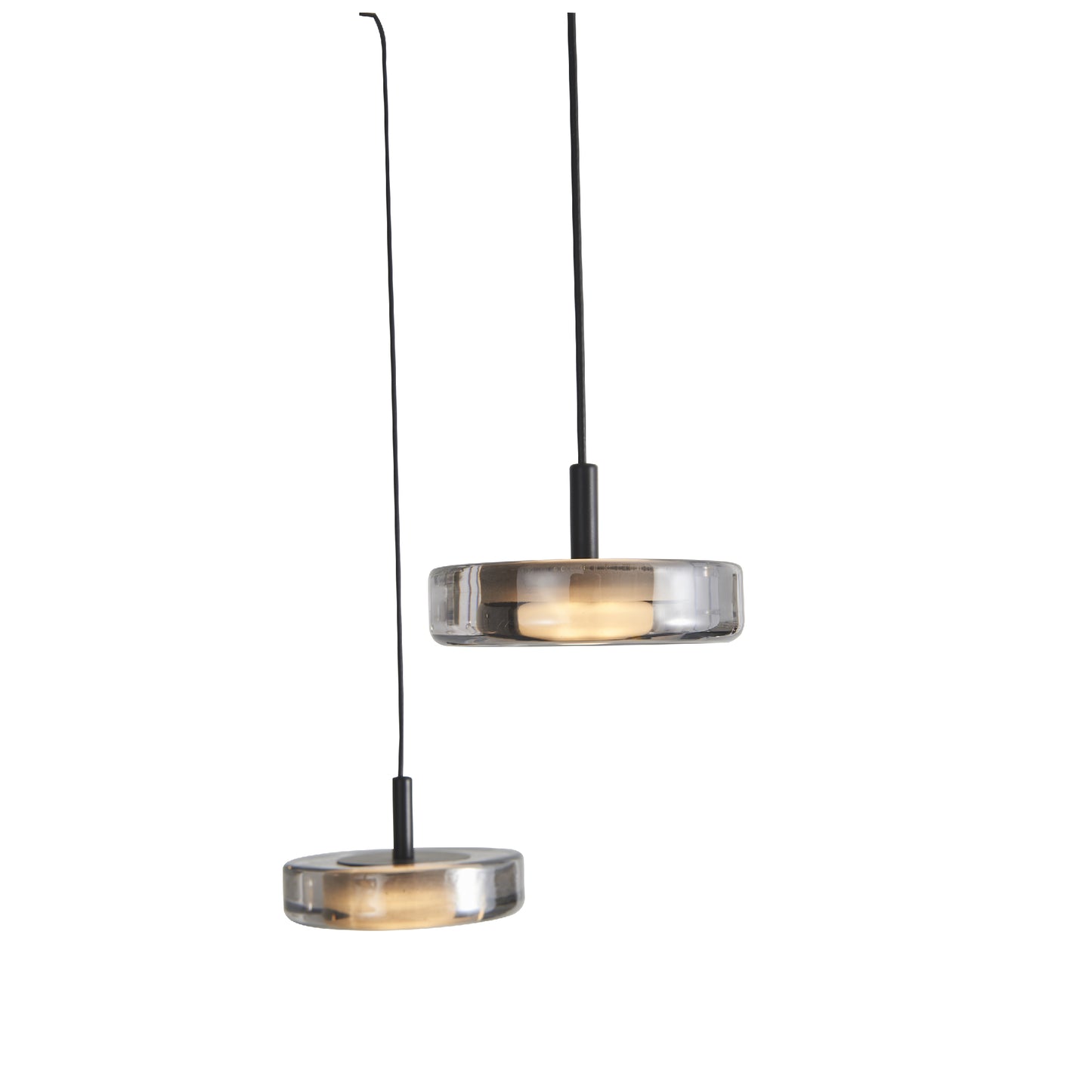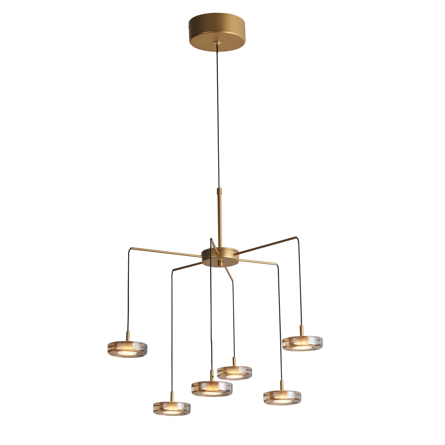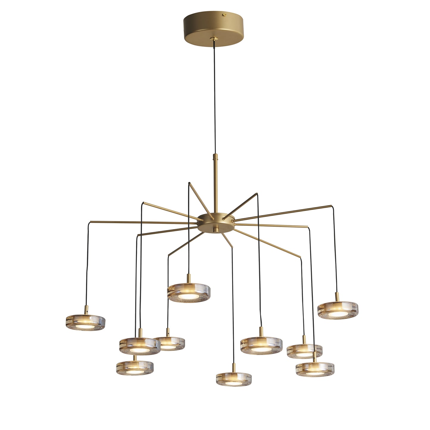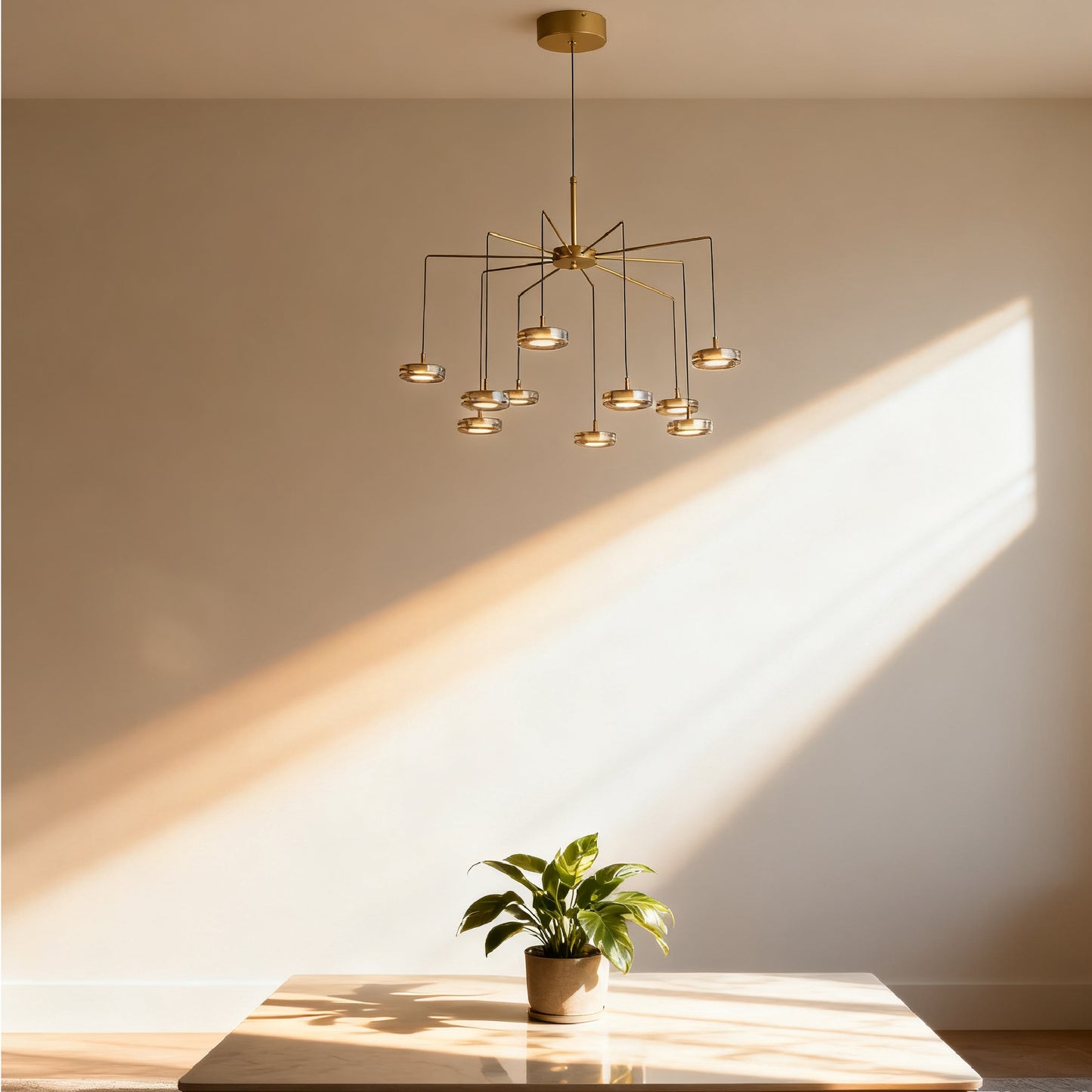 Crafted from premium aluminum and glass, this chandelier combines sharp structural lines with delicately shaped glass discs. The gold finish brings warmth and luxury, while the black finish delivers a calm, modern tone.