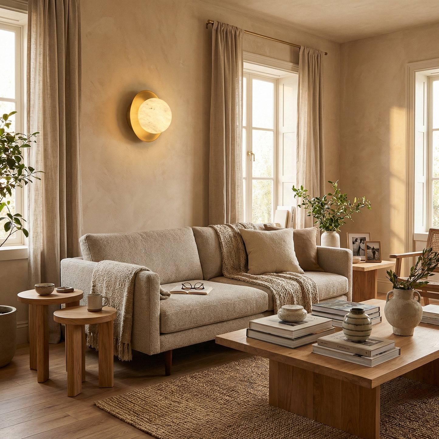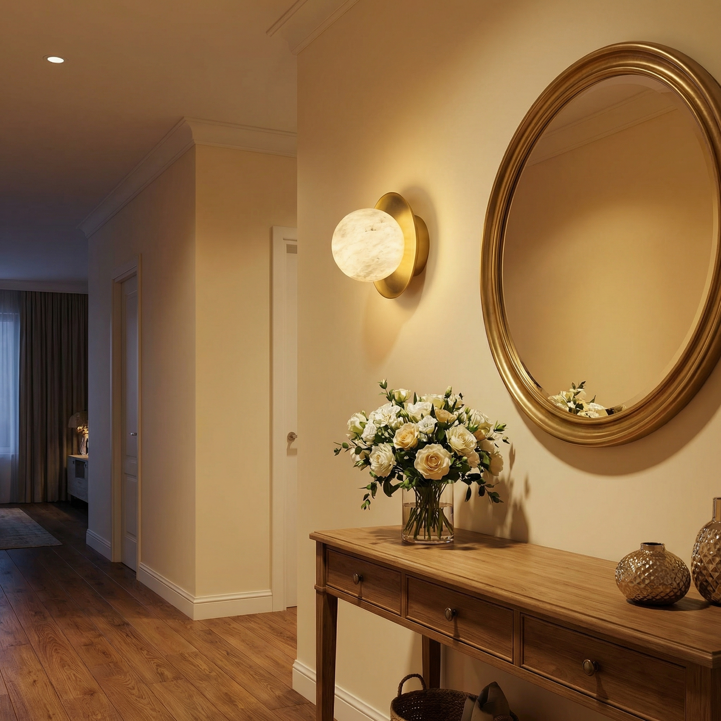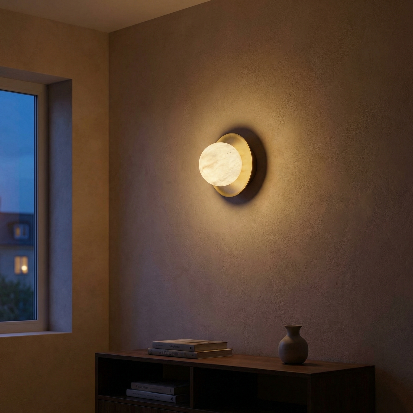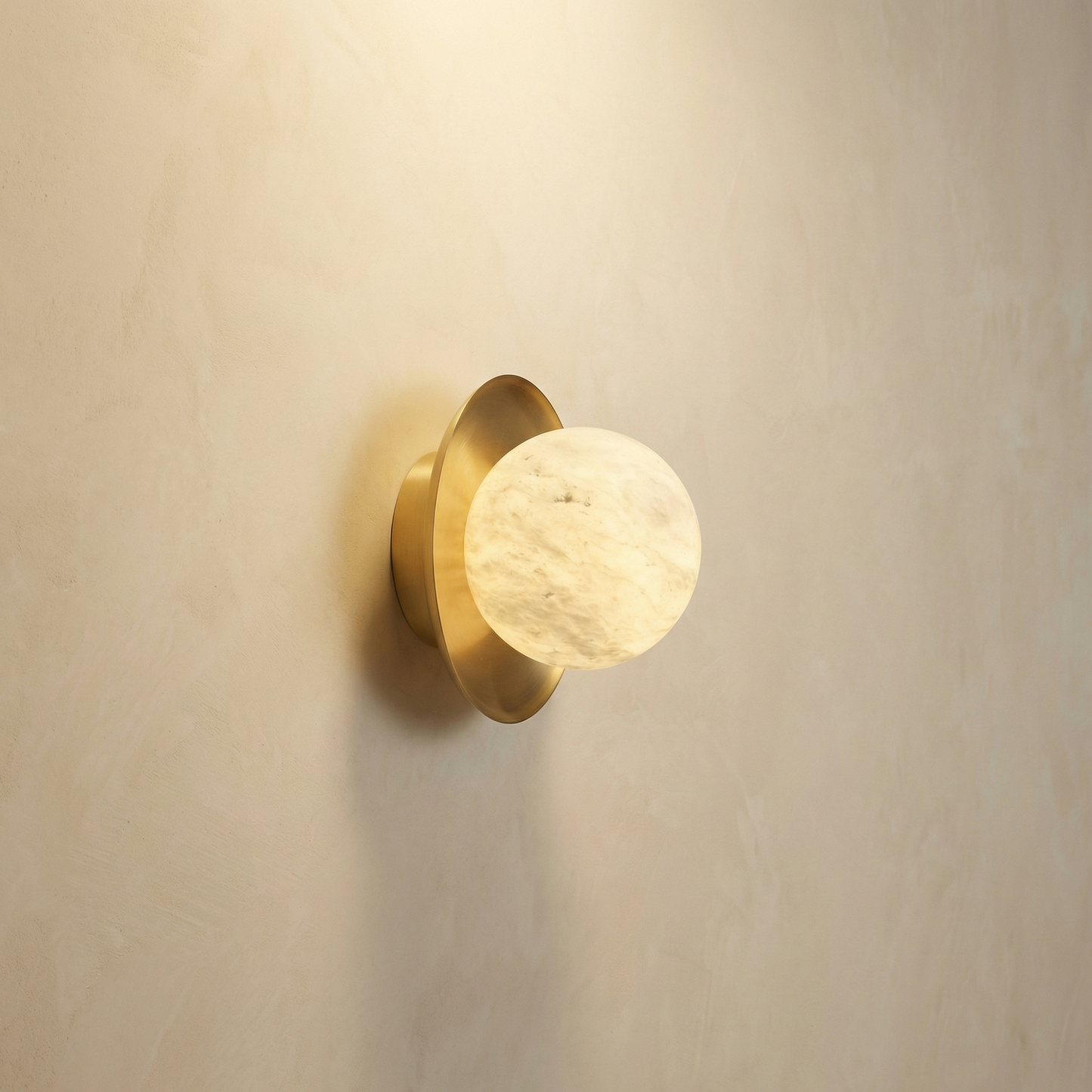Part of the Eclipse Orb Collection, this wall sconce evokes the glow of a solar eclipse — a translucent alabaster orb haloed by sculpted brass discs, casting a warm amber crescent across the wall.