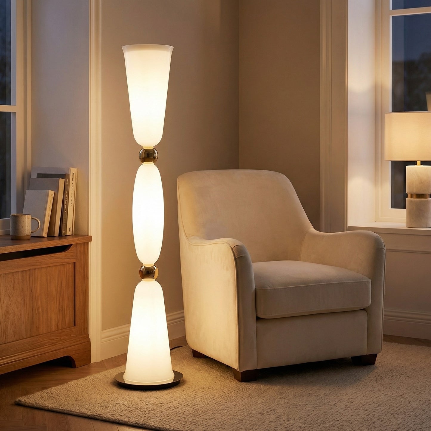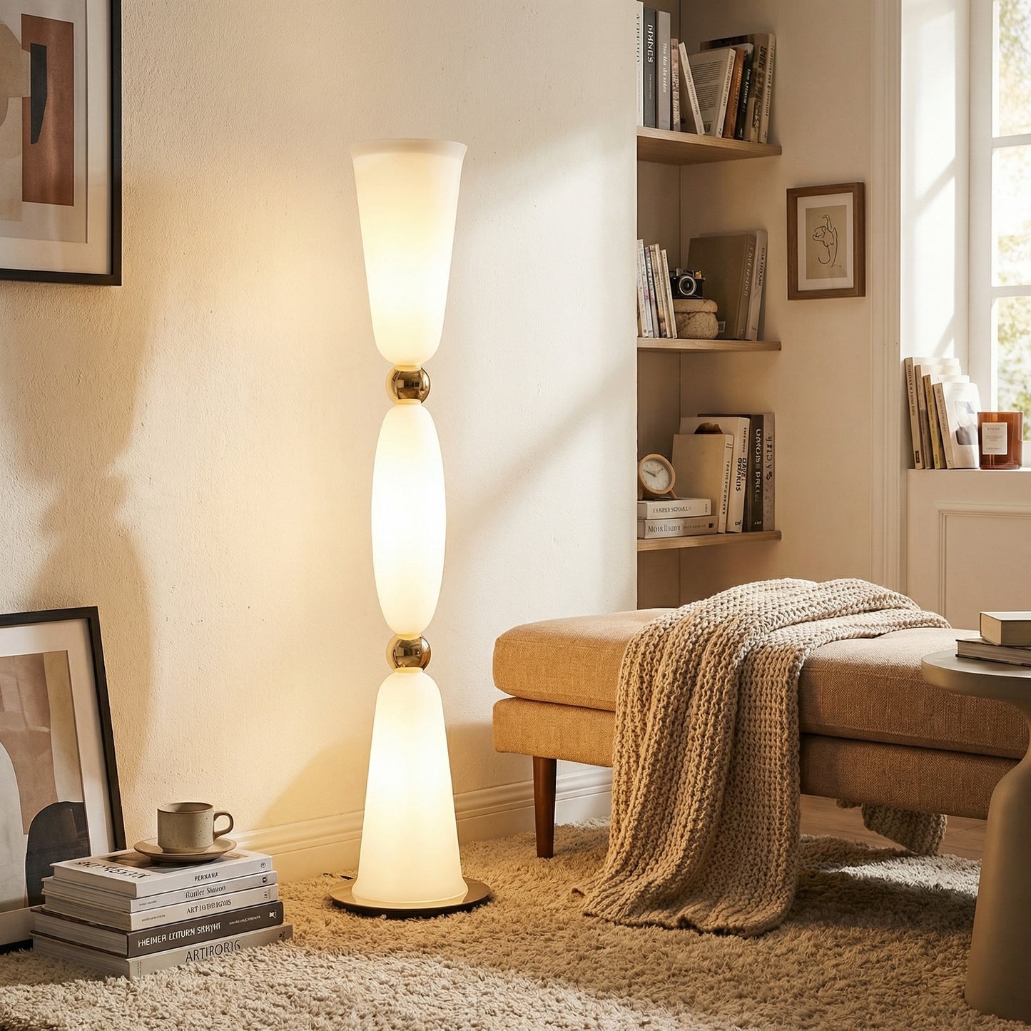 Elevate your space with the Yiosi Cristallo Triple Glass Floor Lamp, a masterfully crafted floor lamp featuring stainless steel, white jade glass construction with a gold finish. Each piece combines modern elegance with expert craftsmanship, creating a stunning focal point for any room.