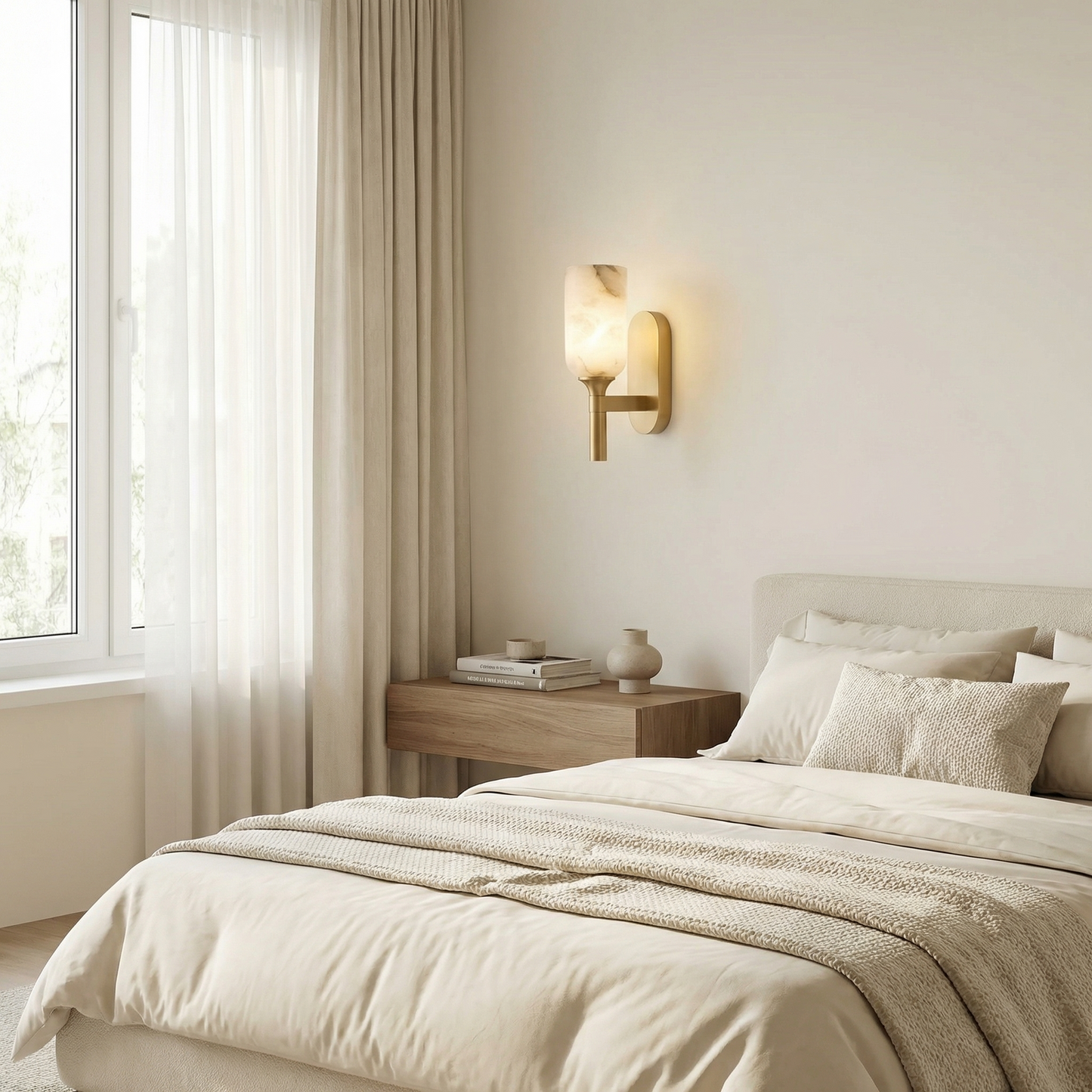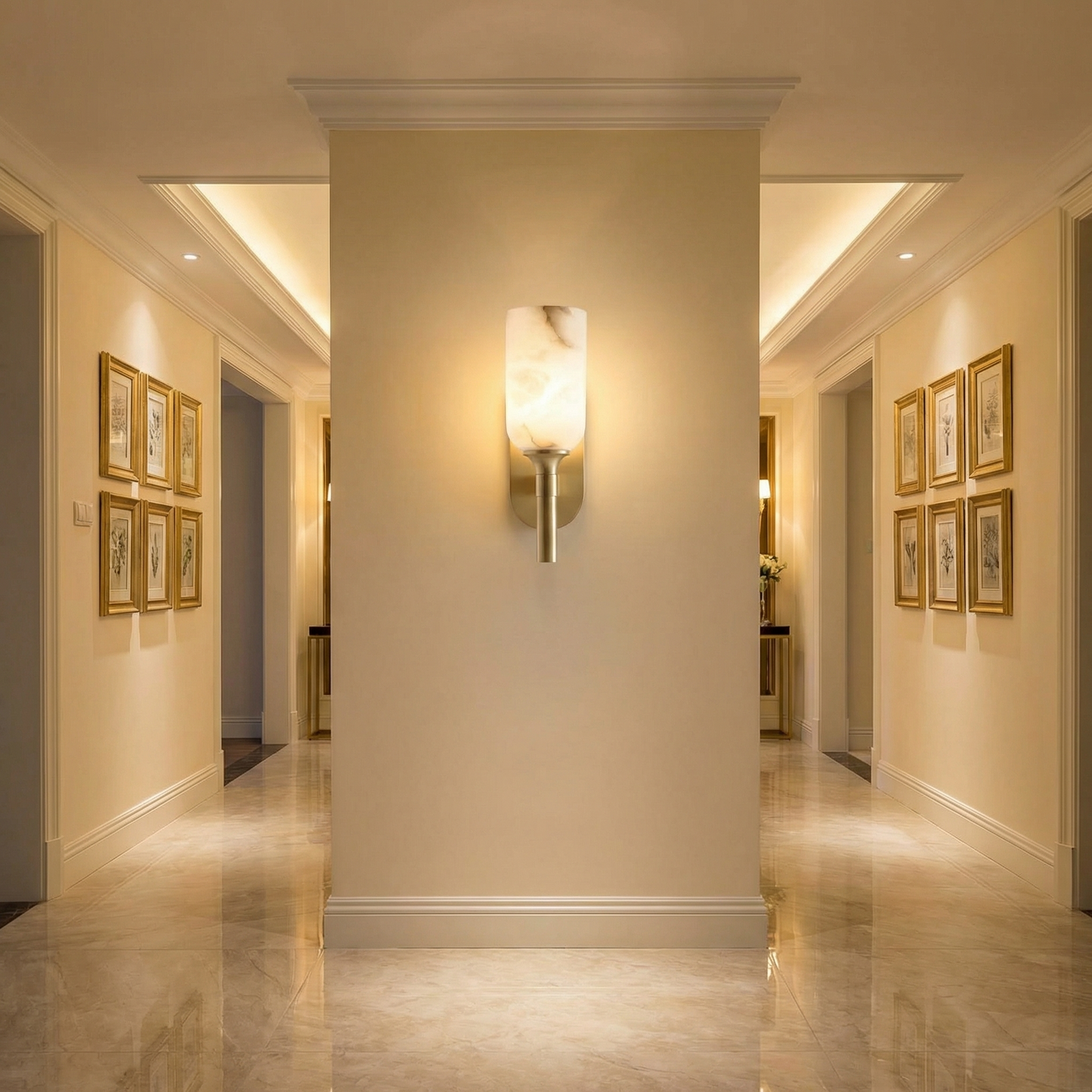 Part of the Cylinder Arm Collection, this architectural wall sconce pairs a solid alabaster cylinder shade with a sculpted metal arm — the stone glows with a warm, candle-like light, bringing timeless hotel-lobby sophistication to any wall.