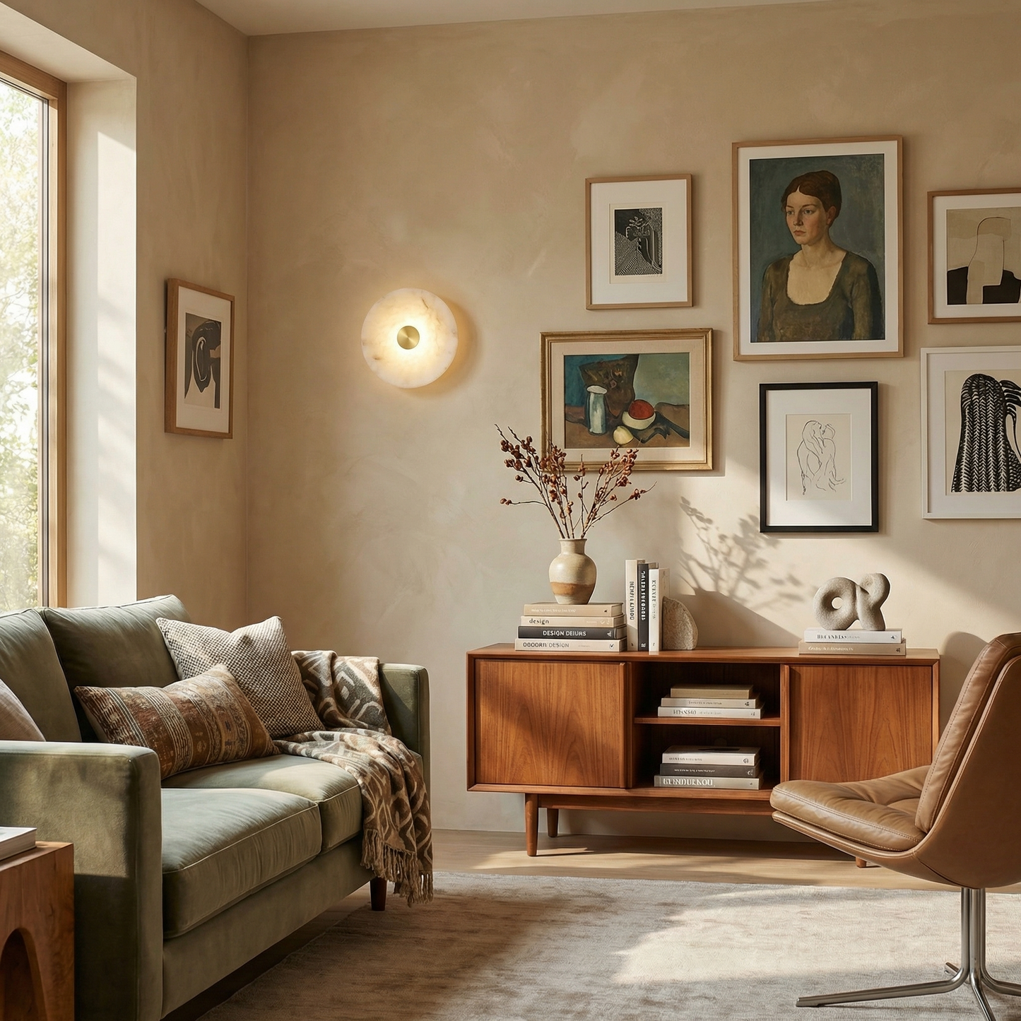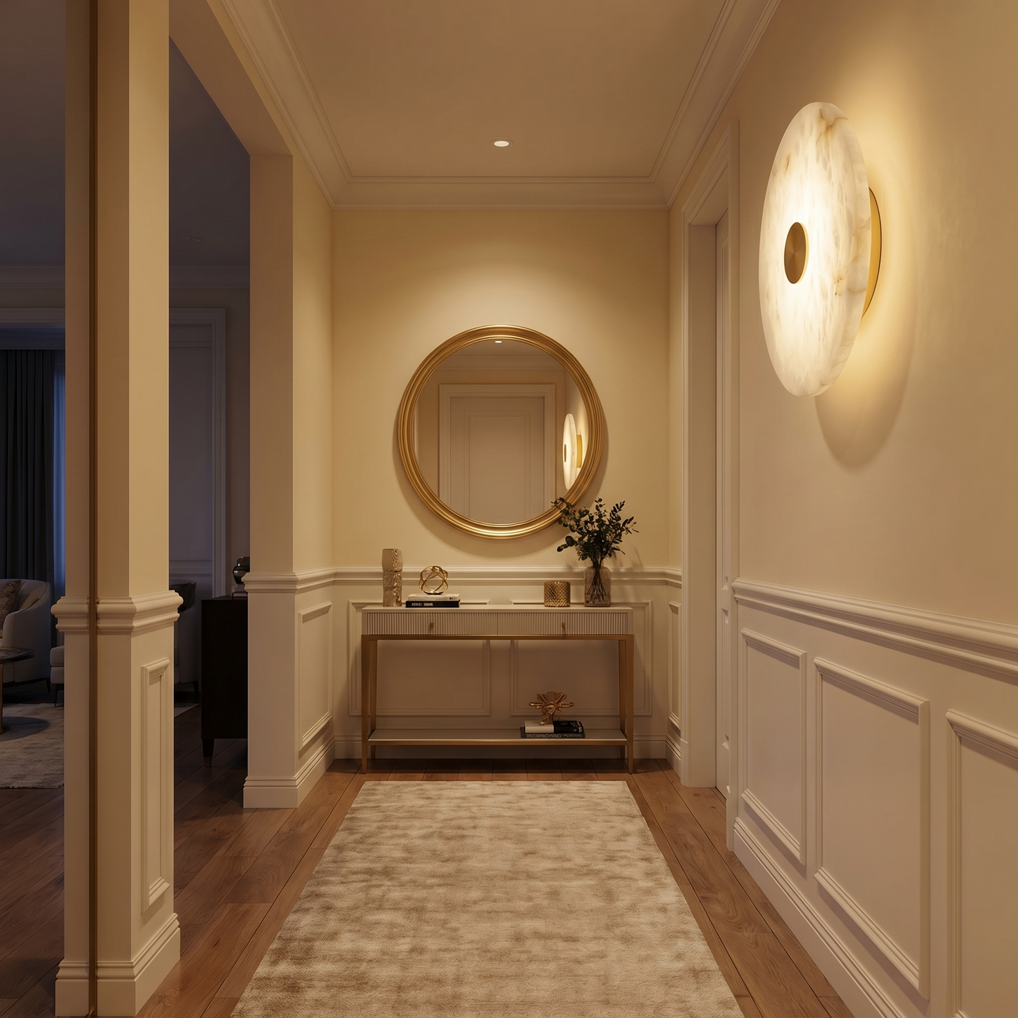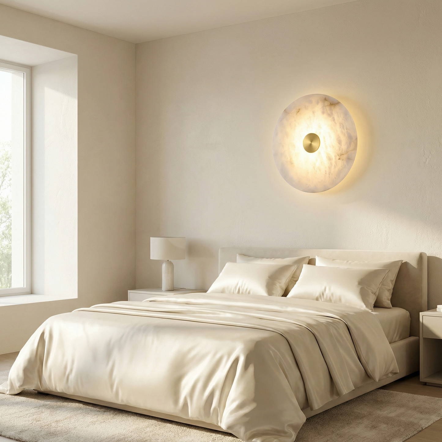 Part of the Luna Disc Collection, this flush-mount wall sconce captures the full moon in translucent alabaster — a flat disc of hand-selected stone that glows with a soft, even amber light, anchored by a minimal metal centre.