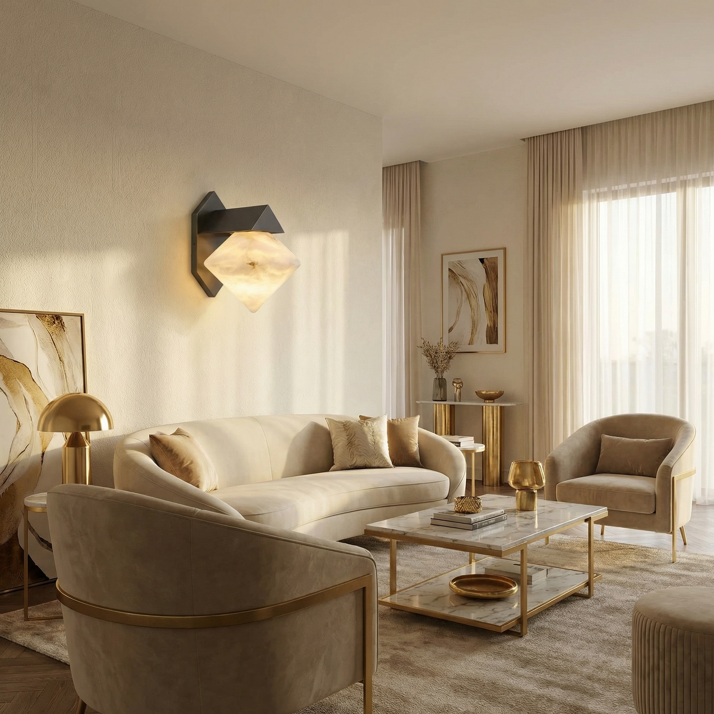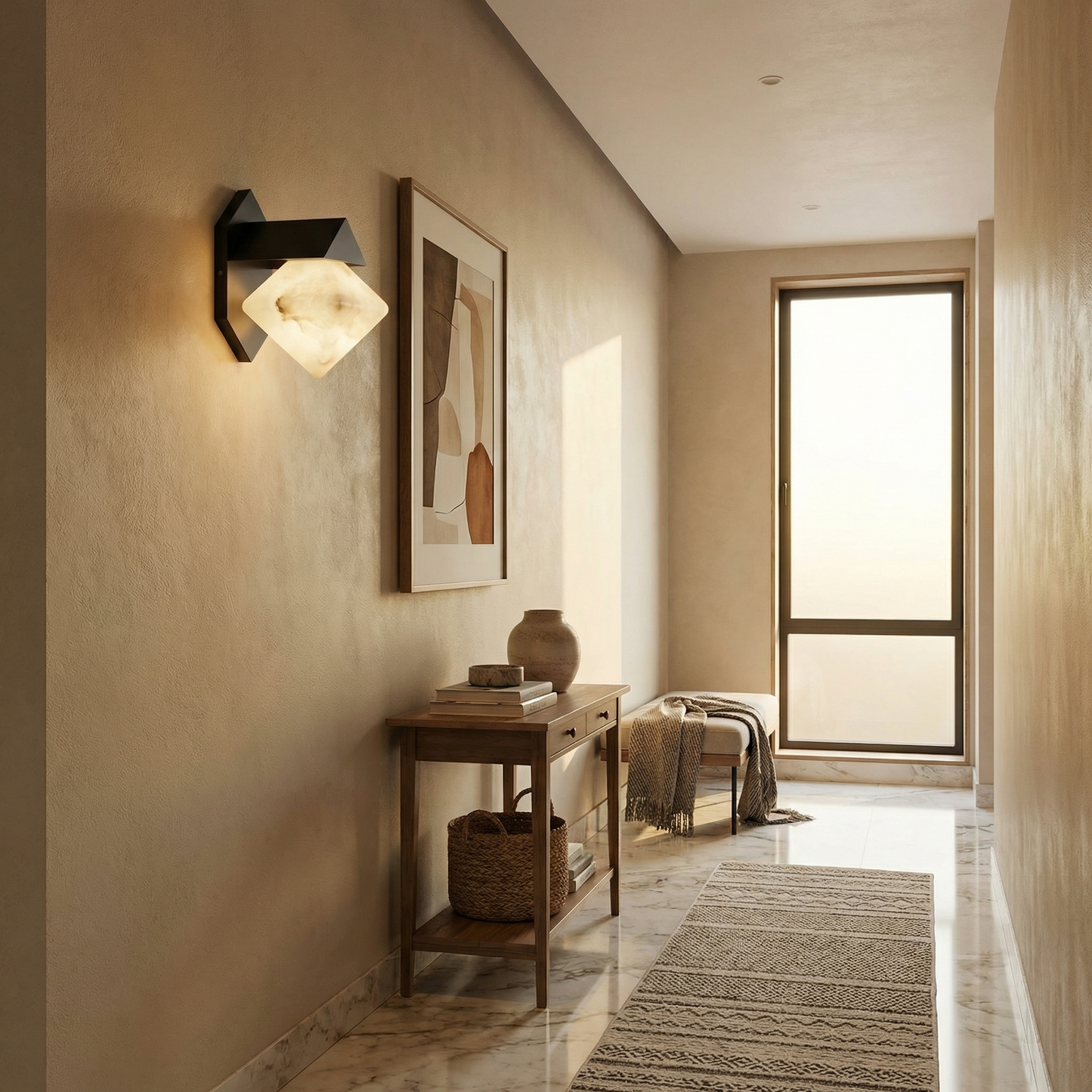 Part of the Geo Crystal Collection, this wall sconce translates the language of cut gemstones into architectural light — faceted alabaster catches the glow from every angle, anchored by a geometric metal frame.