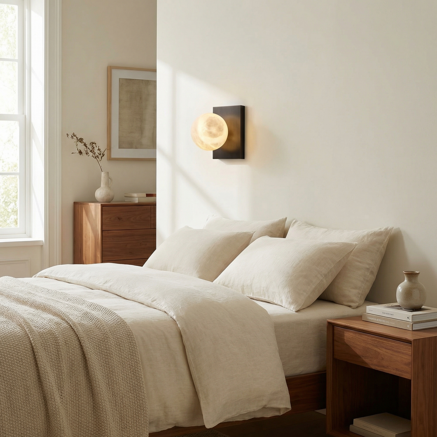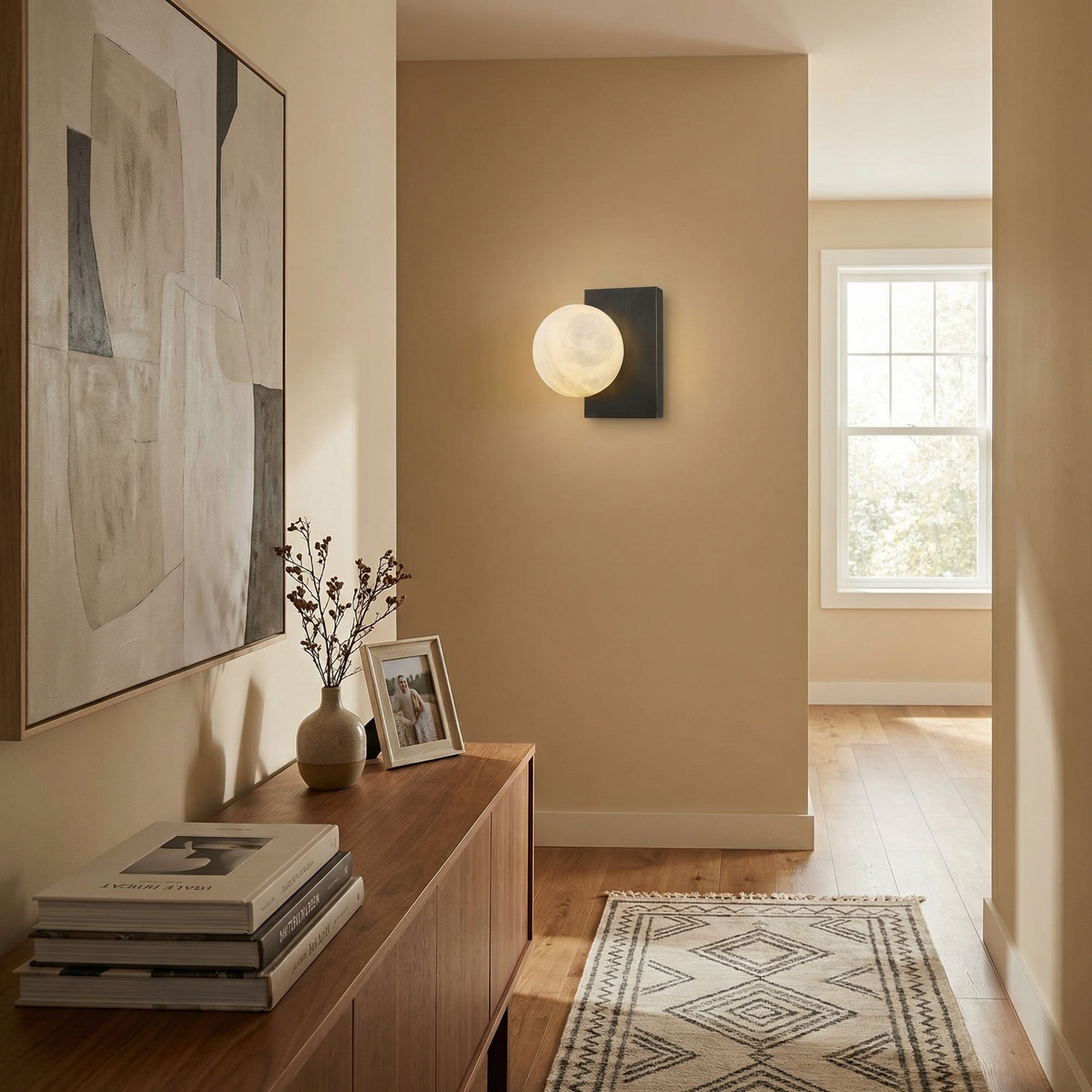 Part of the Rectangular Plate Collection, this wall sconce anchors a softly glowing alabaster orb to a minimal rectangular metal backplate — an architectural study in balance, where warm stone meets crisp geometric form.