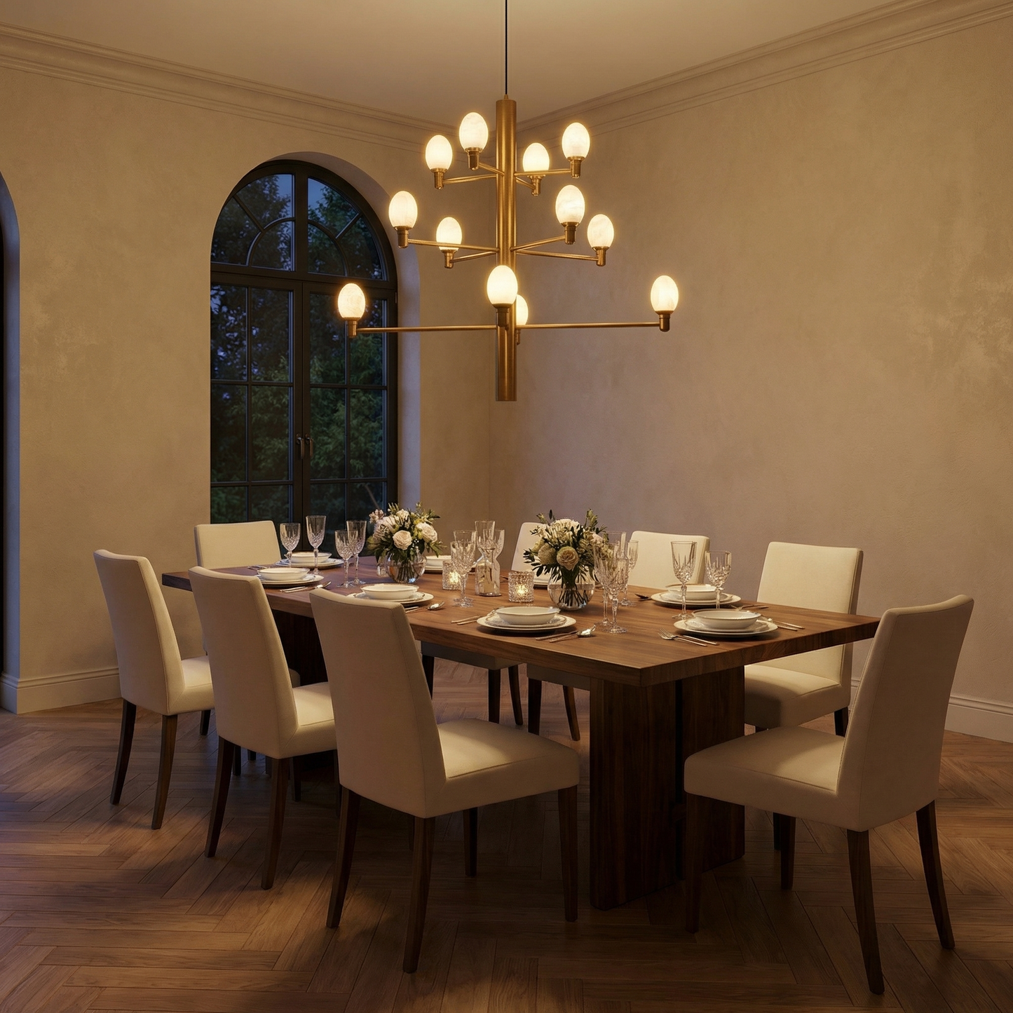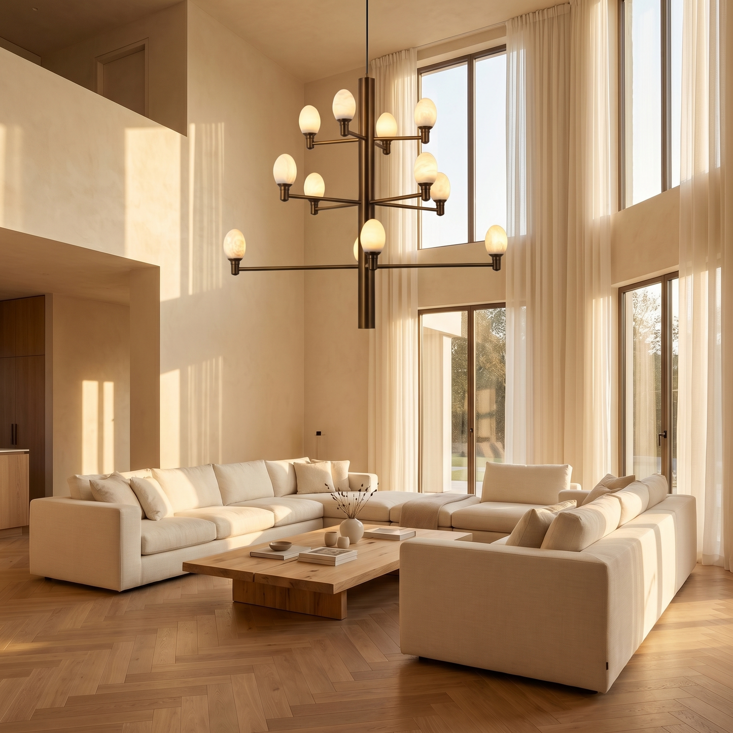Part of the Ramo Collection, this chandelier combines natural stone with refined metalwork. Each alabaster element is cut from a single stone block, so no two pieces are identical — the veining, translucency, and mineral tone are unique to every fixture.