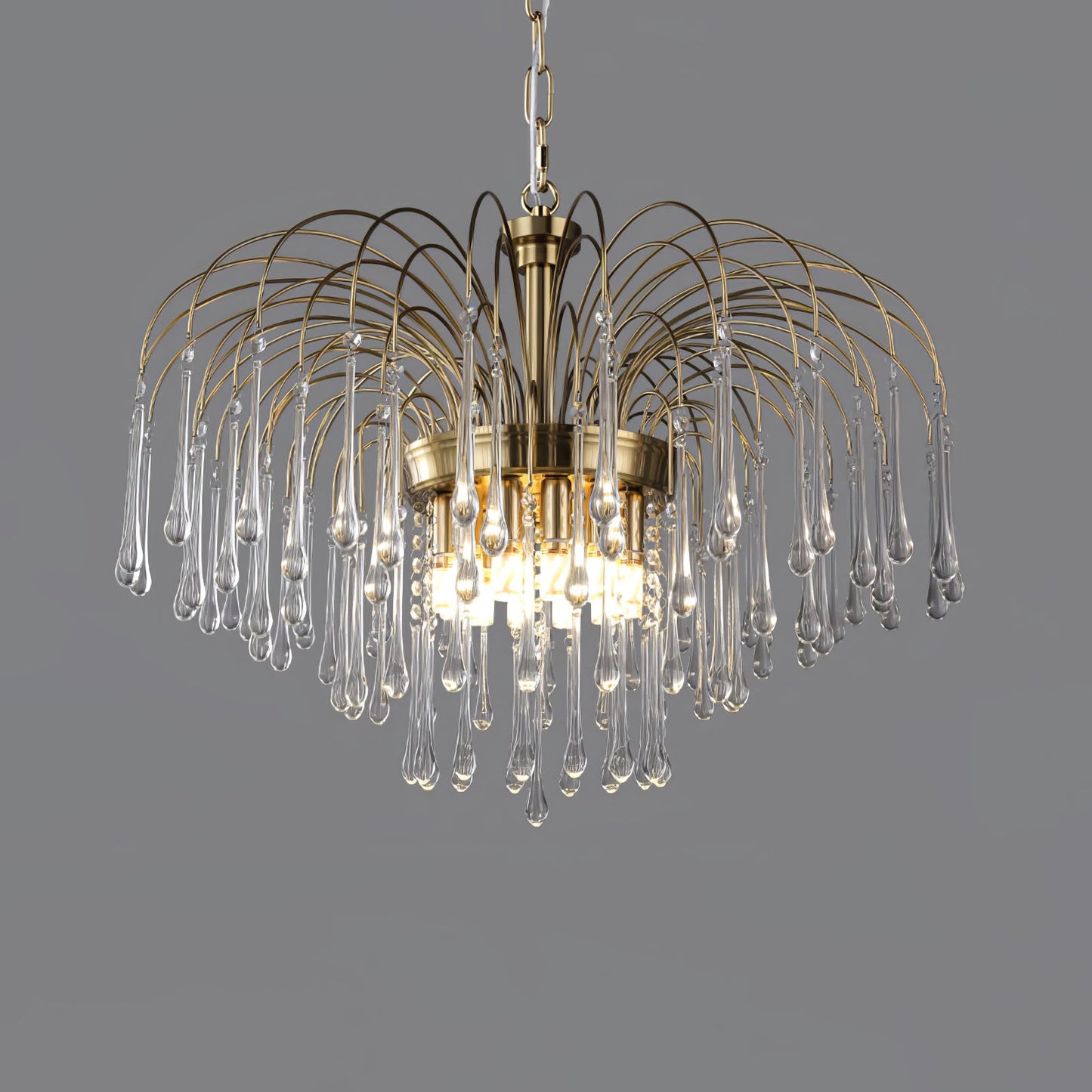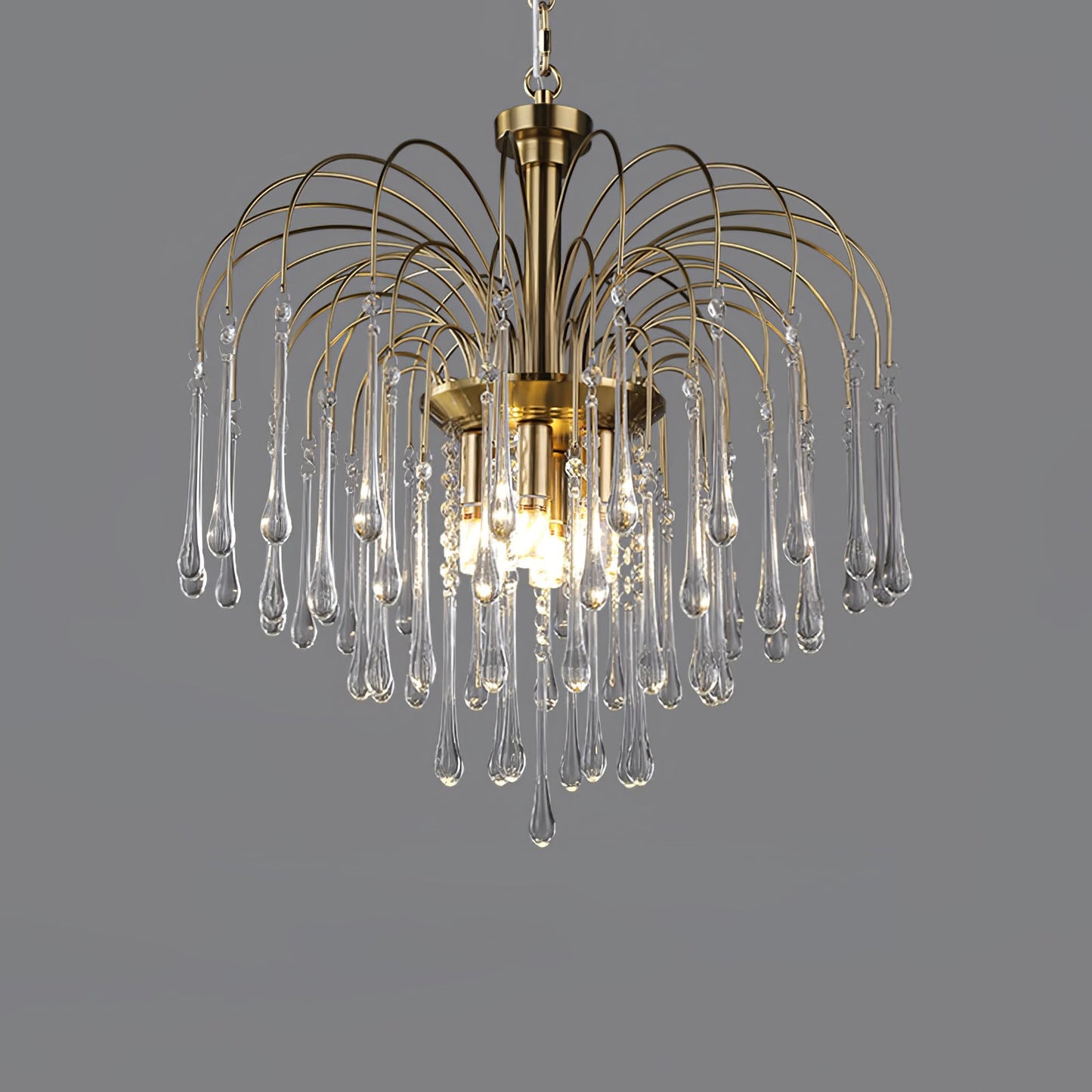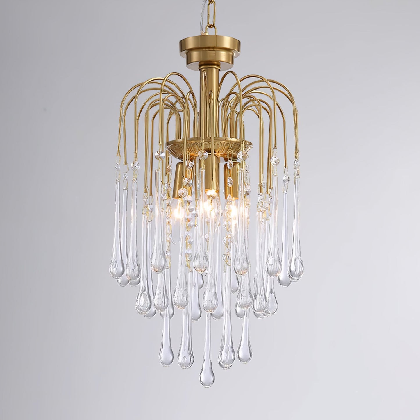 Maltose Chandelier is a stunning blend of vintage elegance and bold silhouettes. This features sleek curved gold finish arms around a decorative central frame, with overlapping tiers of shimmering crystal buttons and drops that create a picturesque cascading light effect and form a dramatic Waterfall effect when illuminated.
