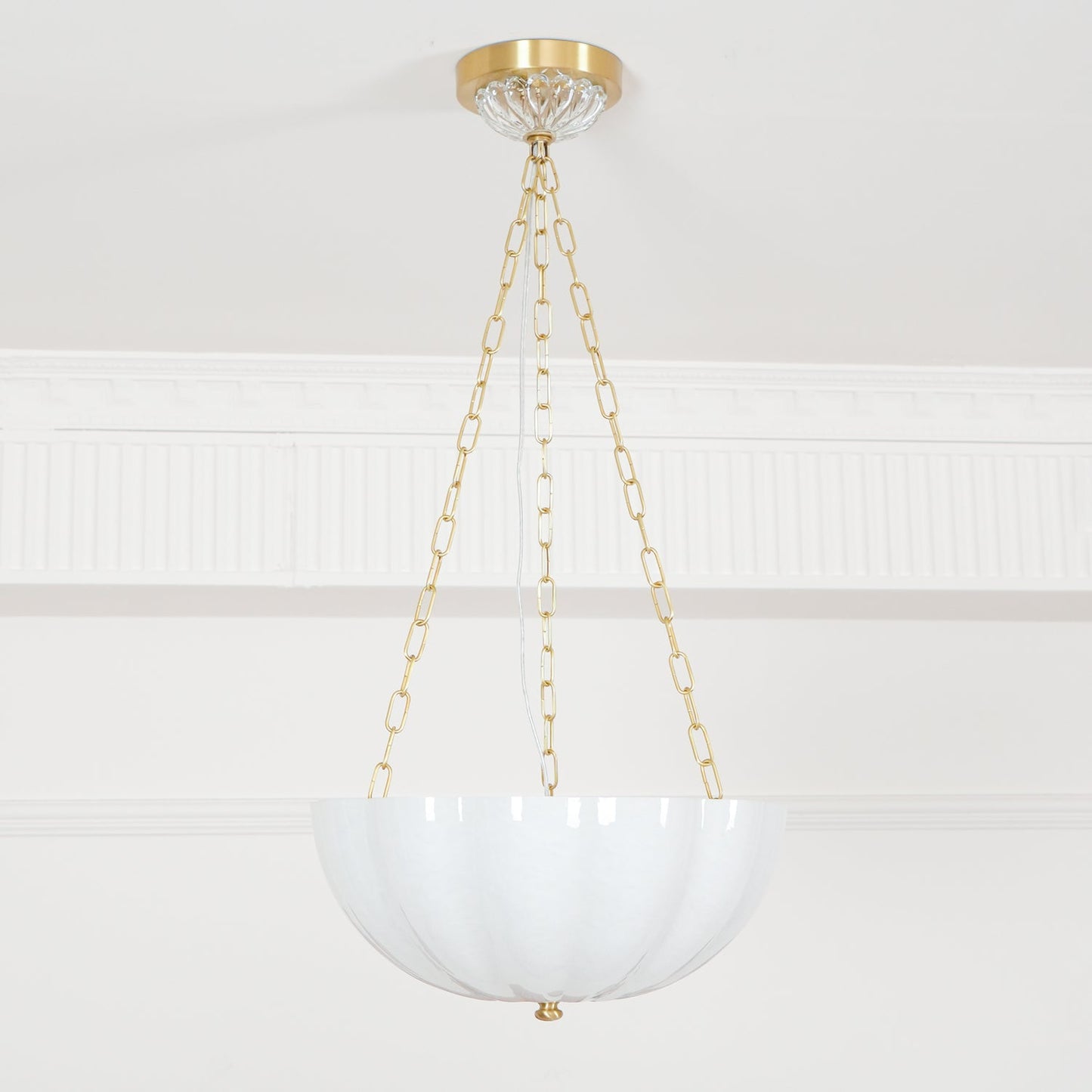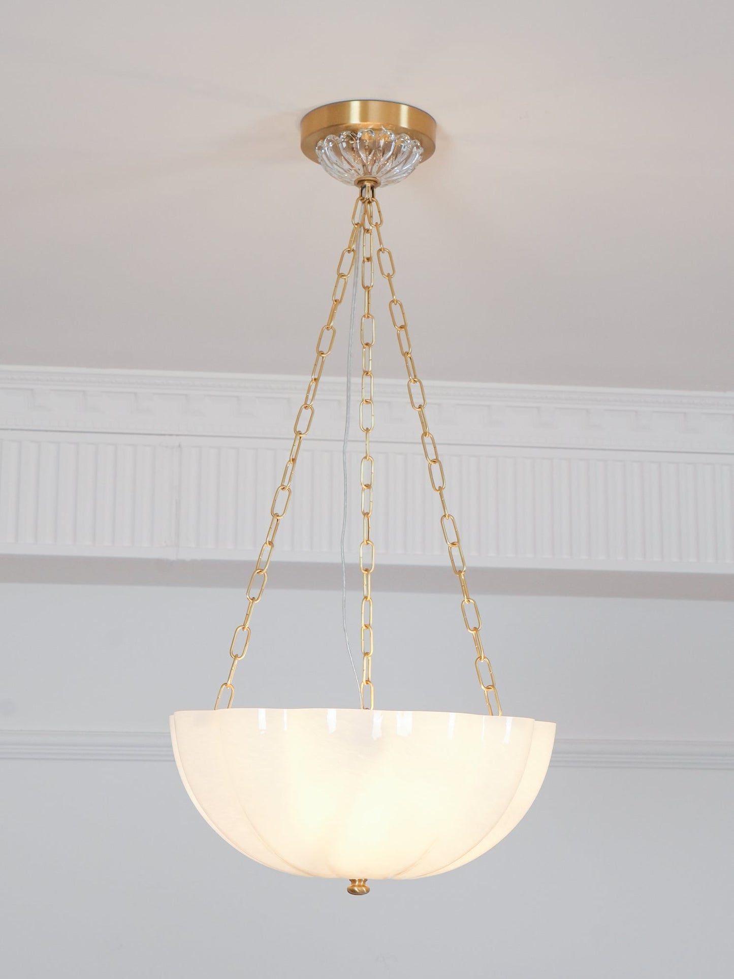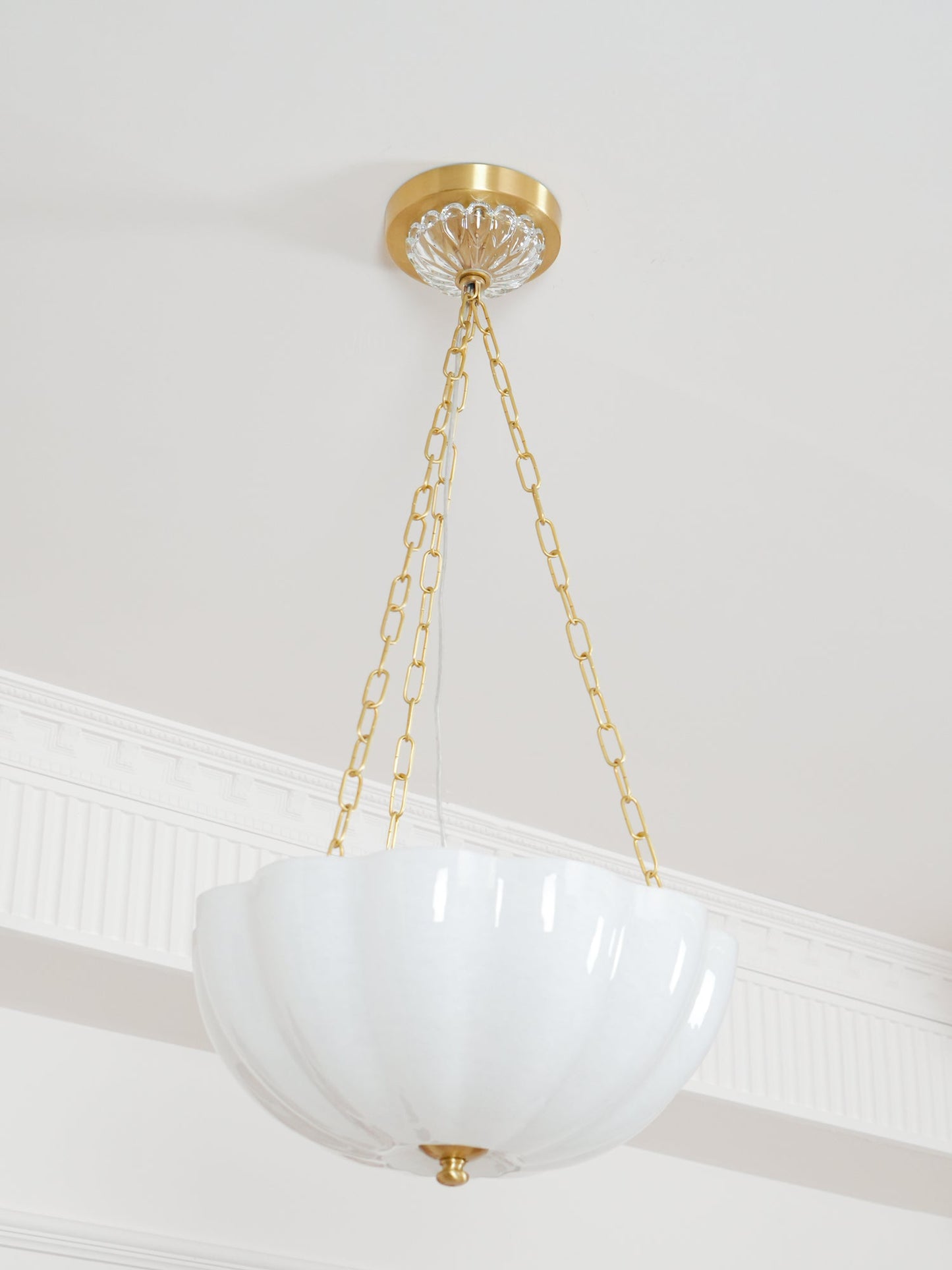 With hints of art deco, the traditional charm of the Rosehill Chandelier can be seen throughout. Known for her blending of old-world charm and modern sensibility, the chandelier is comprised of iron fixtures, chain link, and canopy, along with a flowing glass shade that hangs from it. Light diffuses through the glass in an ambient cast while the remainder bounces off the ceiling above.