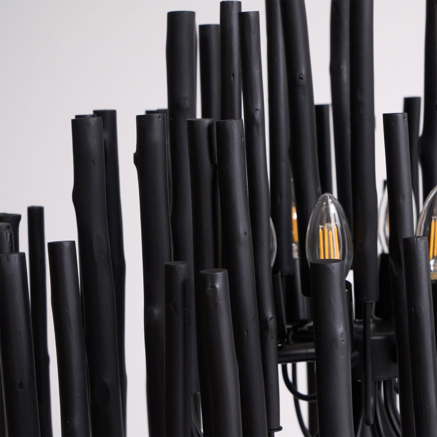 Enhance any space with the unique and charming Swinton Chandelier. Crafted with layered wooden rods and curved iron arms, each piece boasts a one-of-a-kind shape and size due to the natural characteristics of the wood. Available in black or white, this chandelier is a perfect blend of natural elements and modern design.